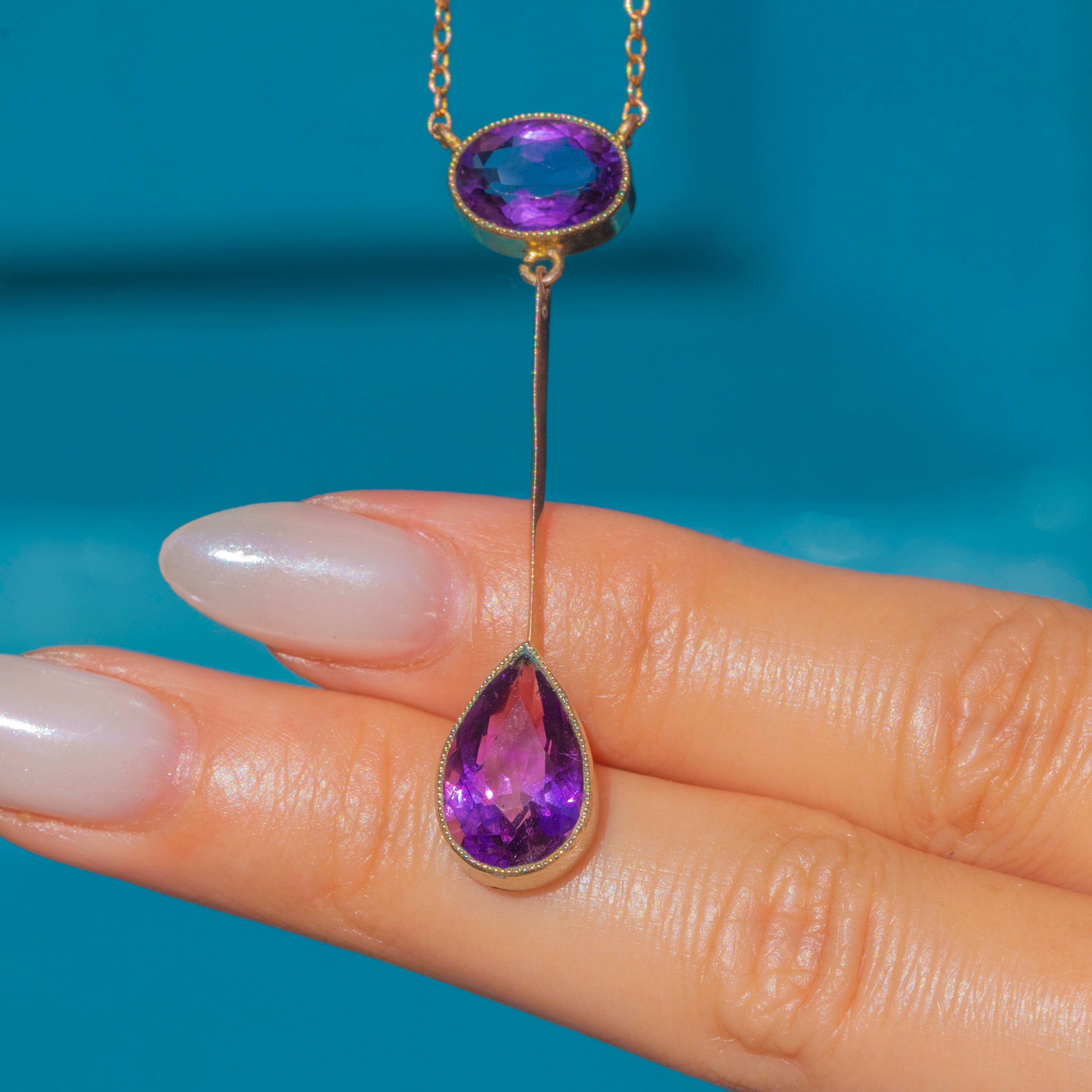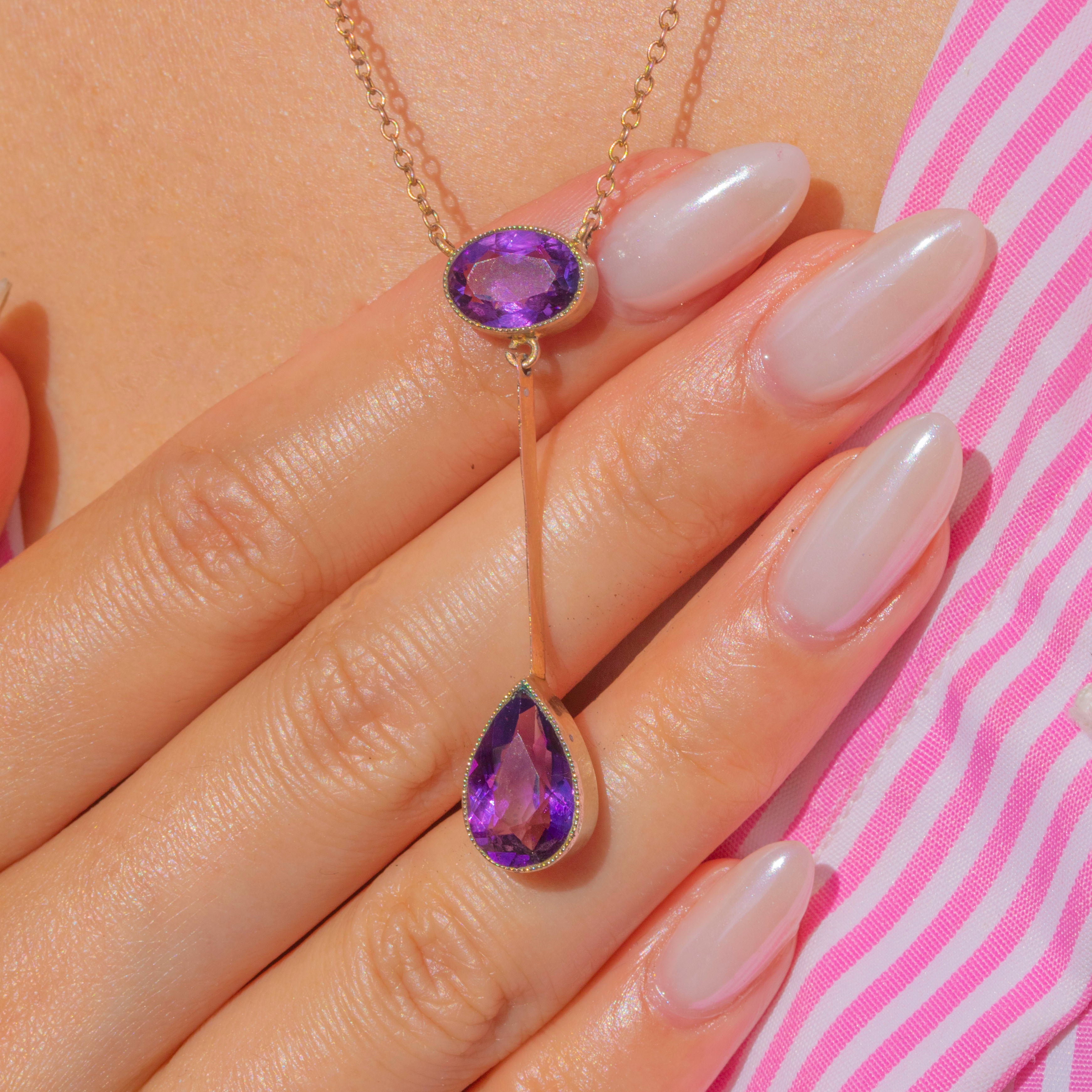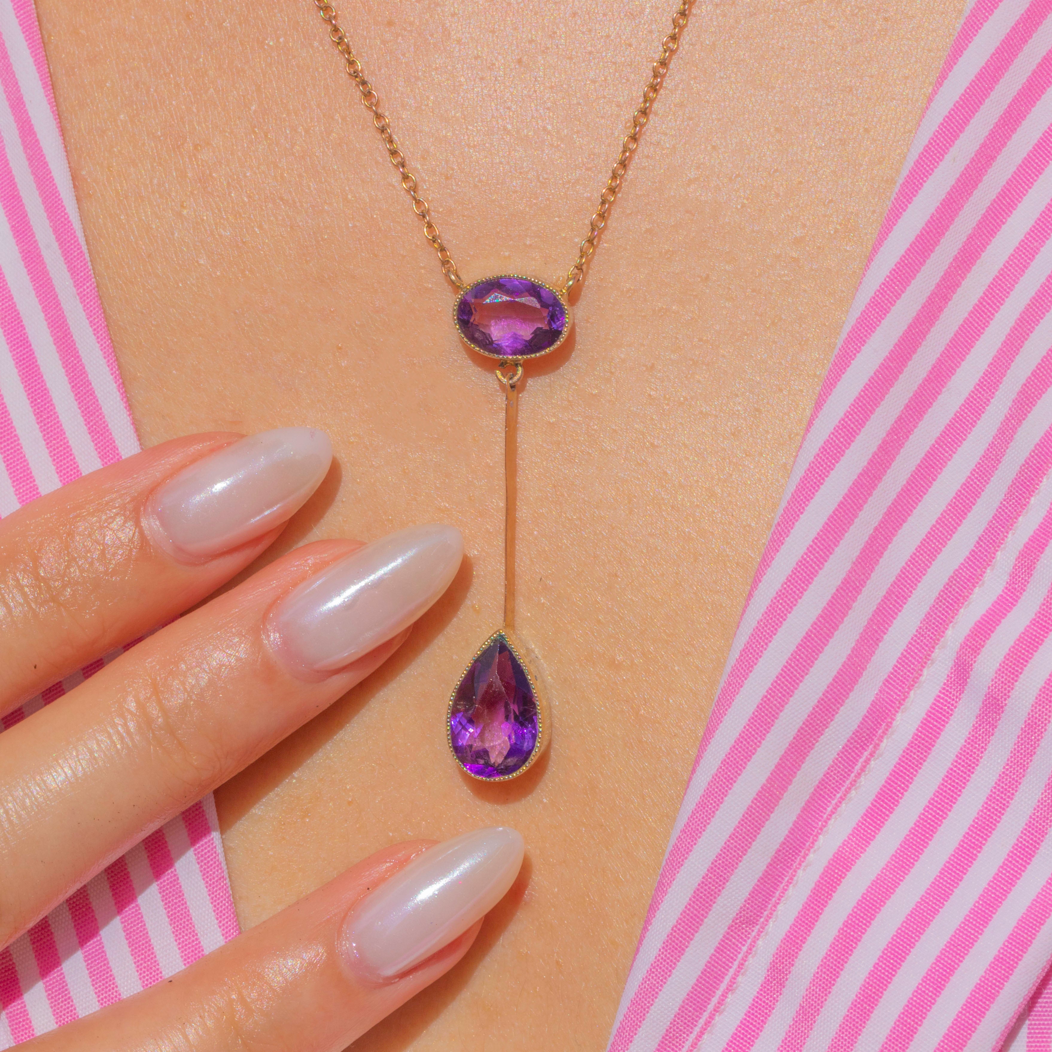 This Edwardian Amethyst necklace will elegantly accentuate your neckline! Crafted from solid 9ct Gold, this antique necklace boasts 3.50cts of rich purple Amethysts, each bezel-set with millgrain detailing.