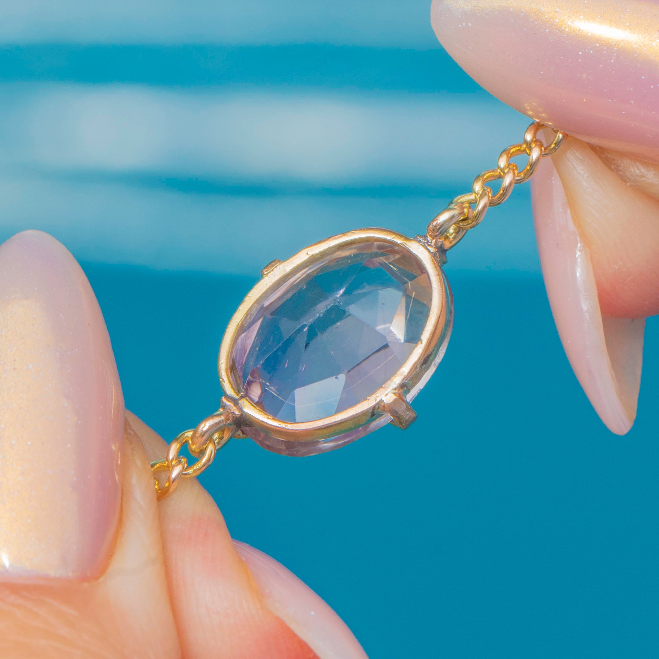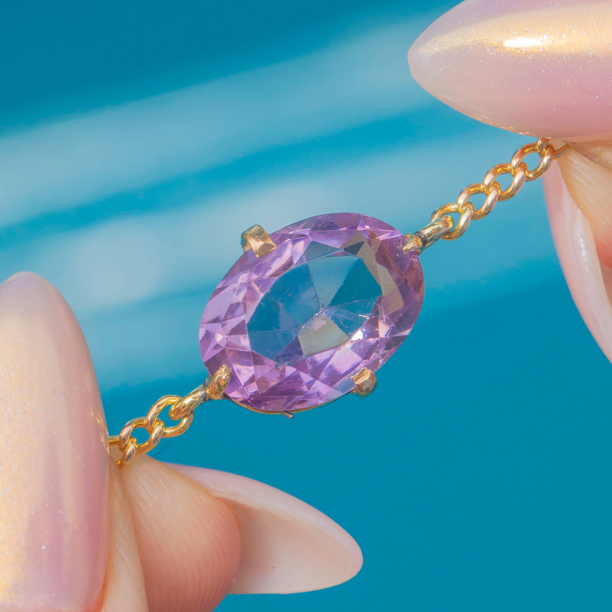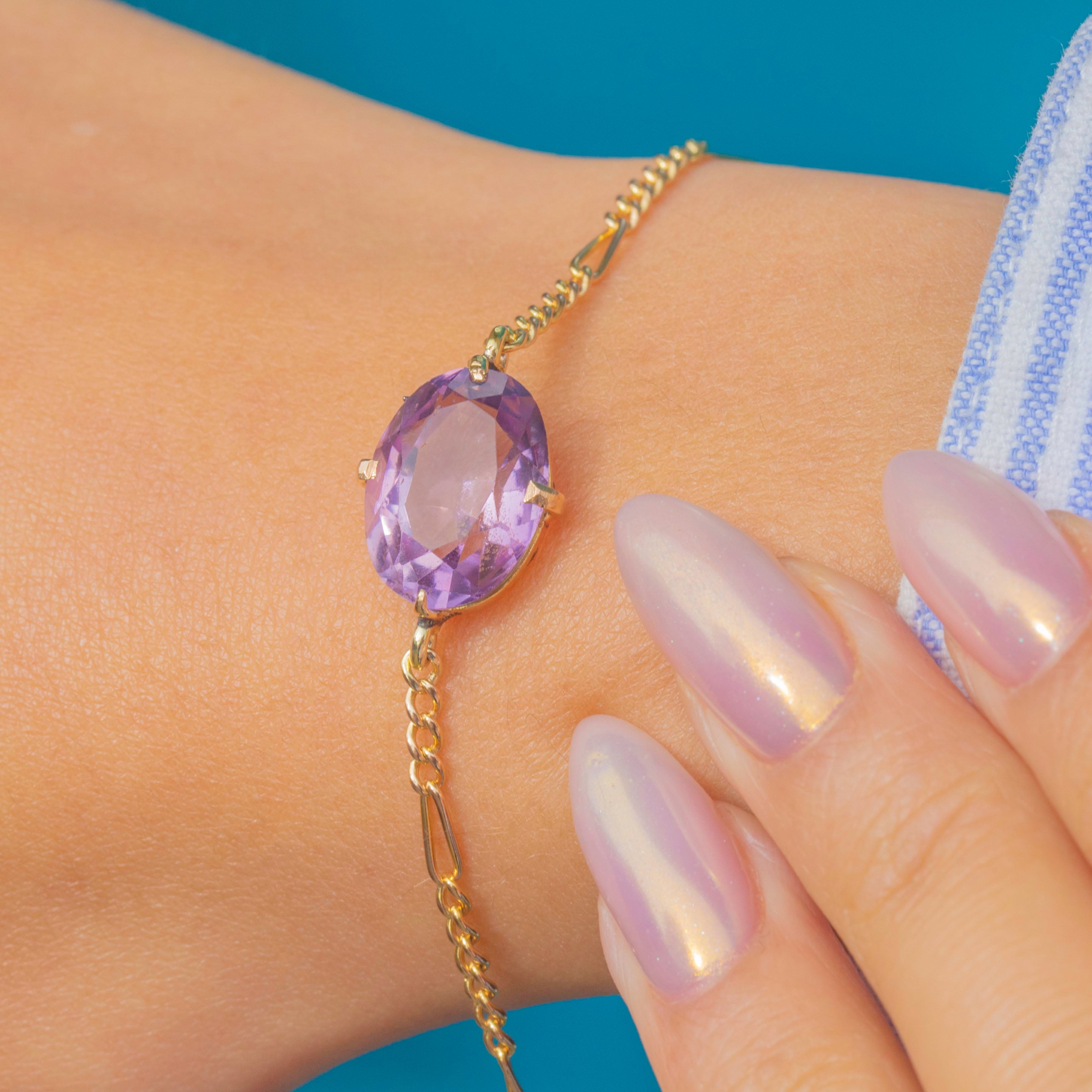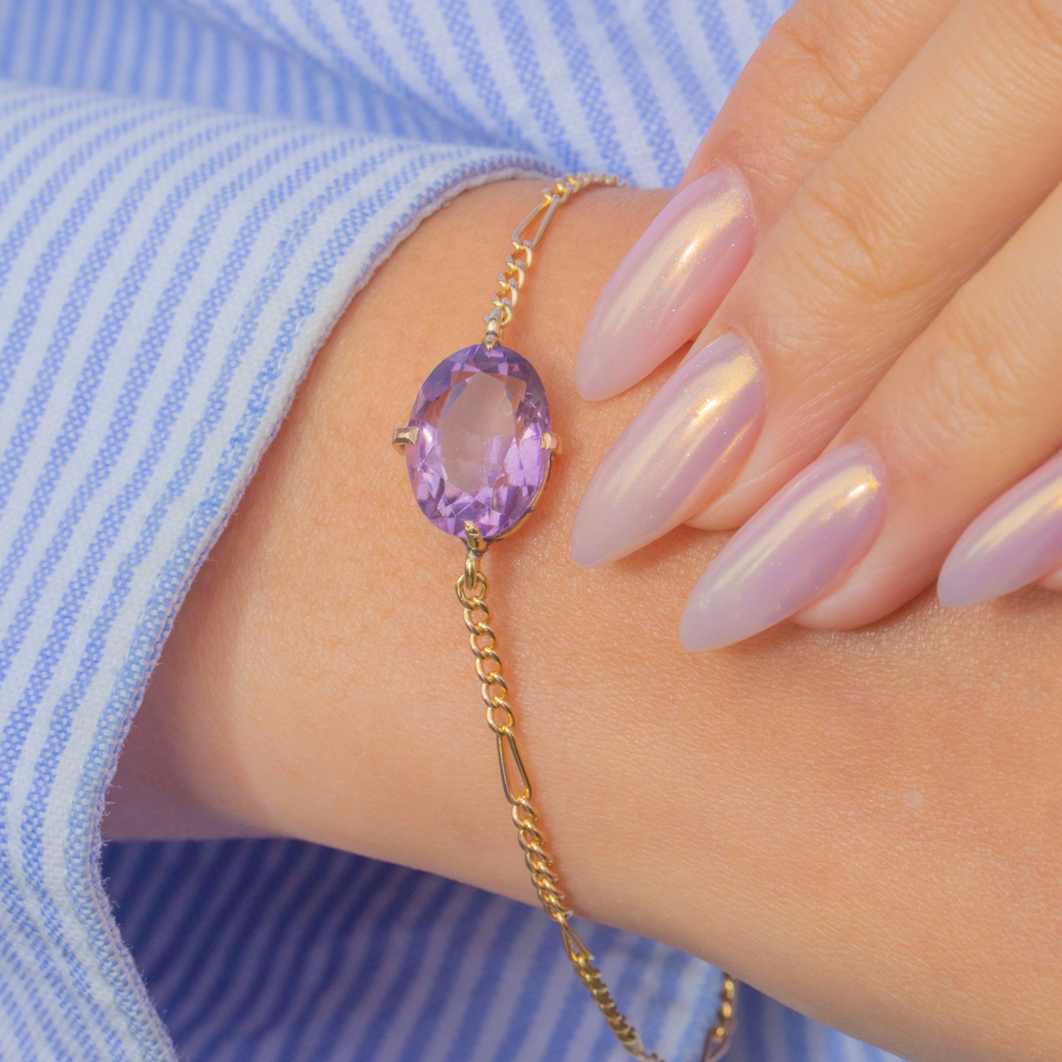 EXCELLENT: The Amethyst is radiant, with only very minor surface wear present upon close inspection. The chain links are uniform and secure and with its bolt-ring in perfect working order, this bracelet can be worn with utmost confidence.