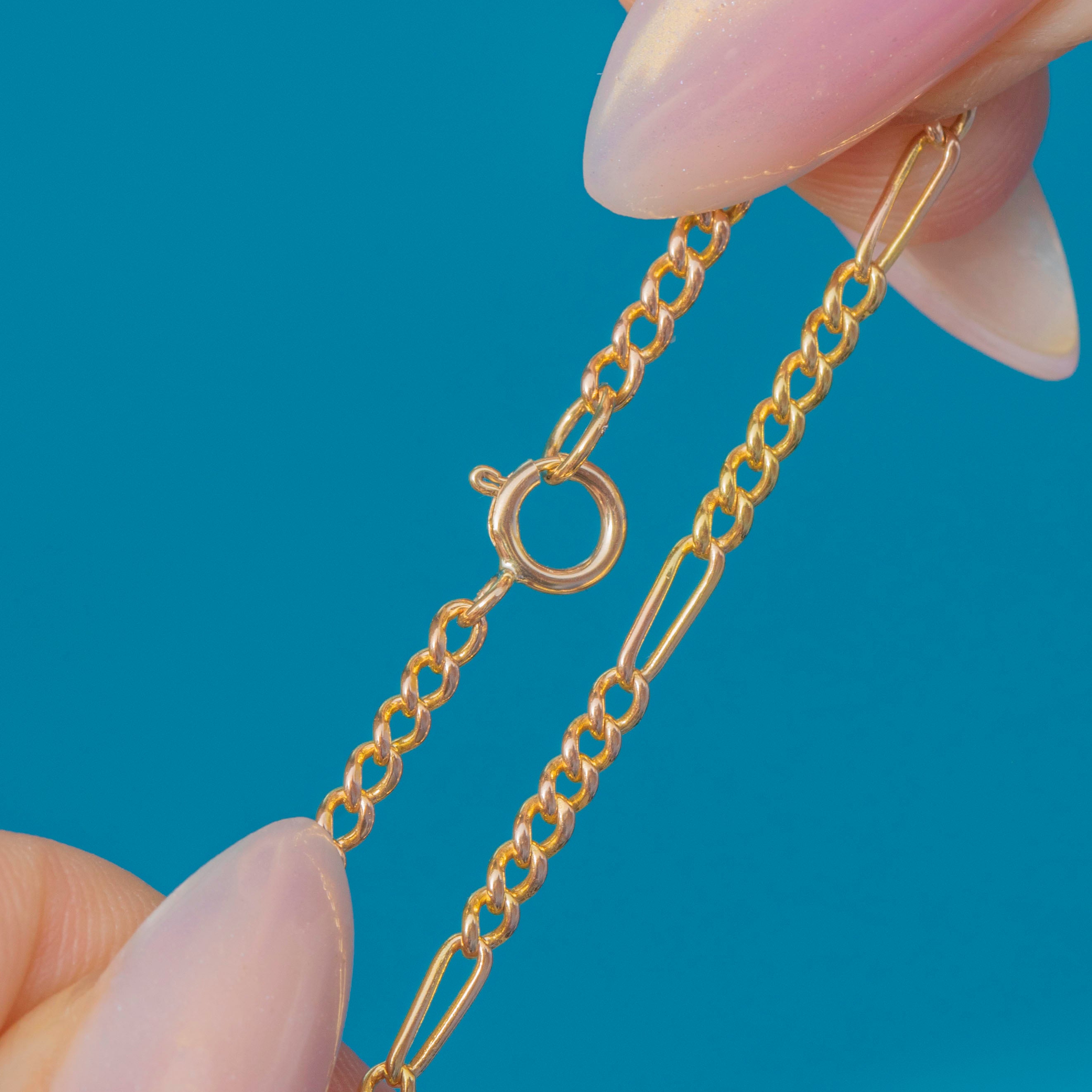 It is hugged by claw settings and suspended from an intricately formed Figaro link chain. At a desirable 7" long, this antique bracelet is a wonderful versatile option for your attire.