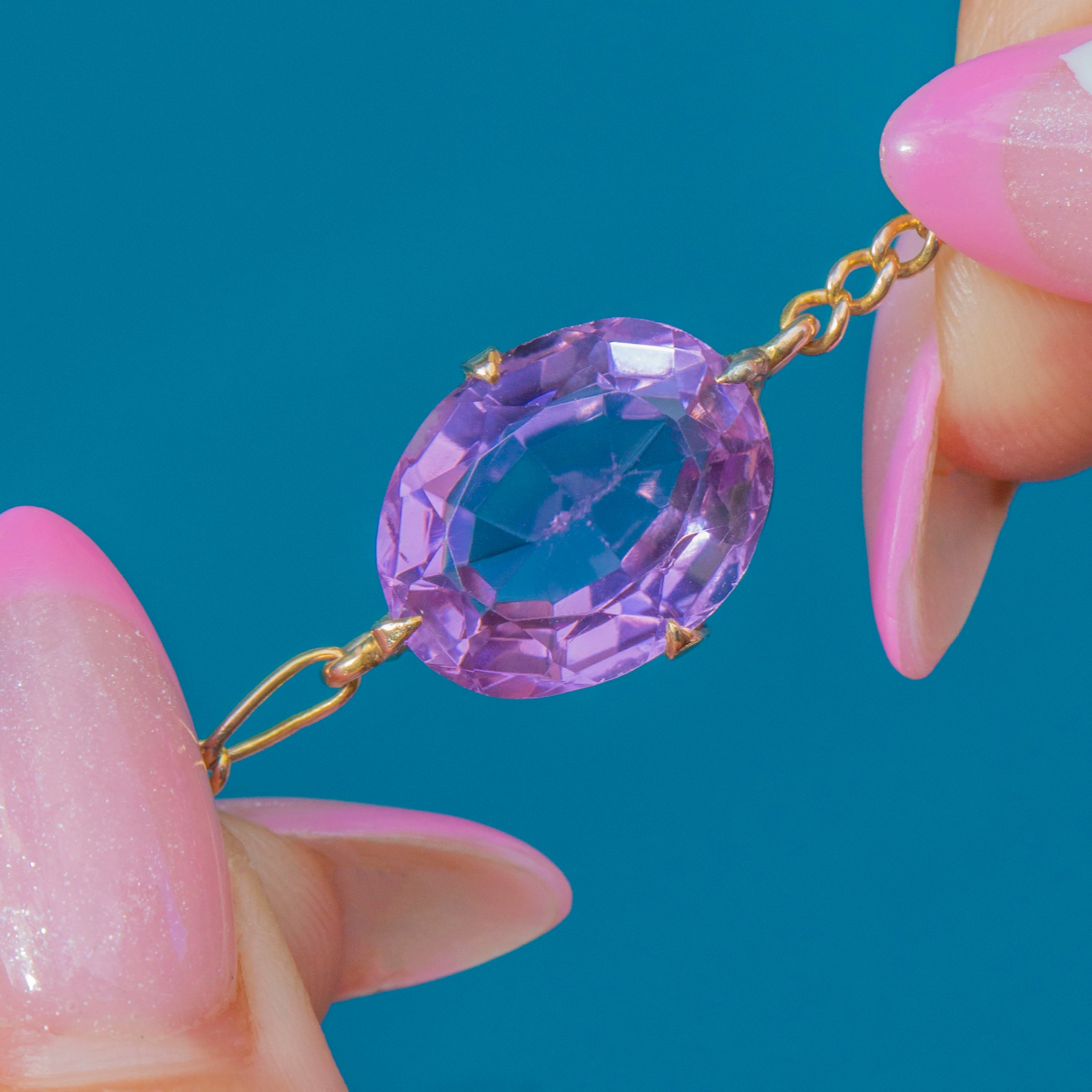 VERY GOOD: The Amethyst is securely set with lively colour and crisp facets. There is some light wear around the Amethyst setting and gentle surface wear to the links, consistent with age and careful wear. Overall well-preserved and ready to wear.