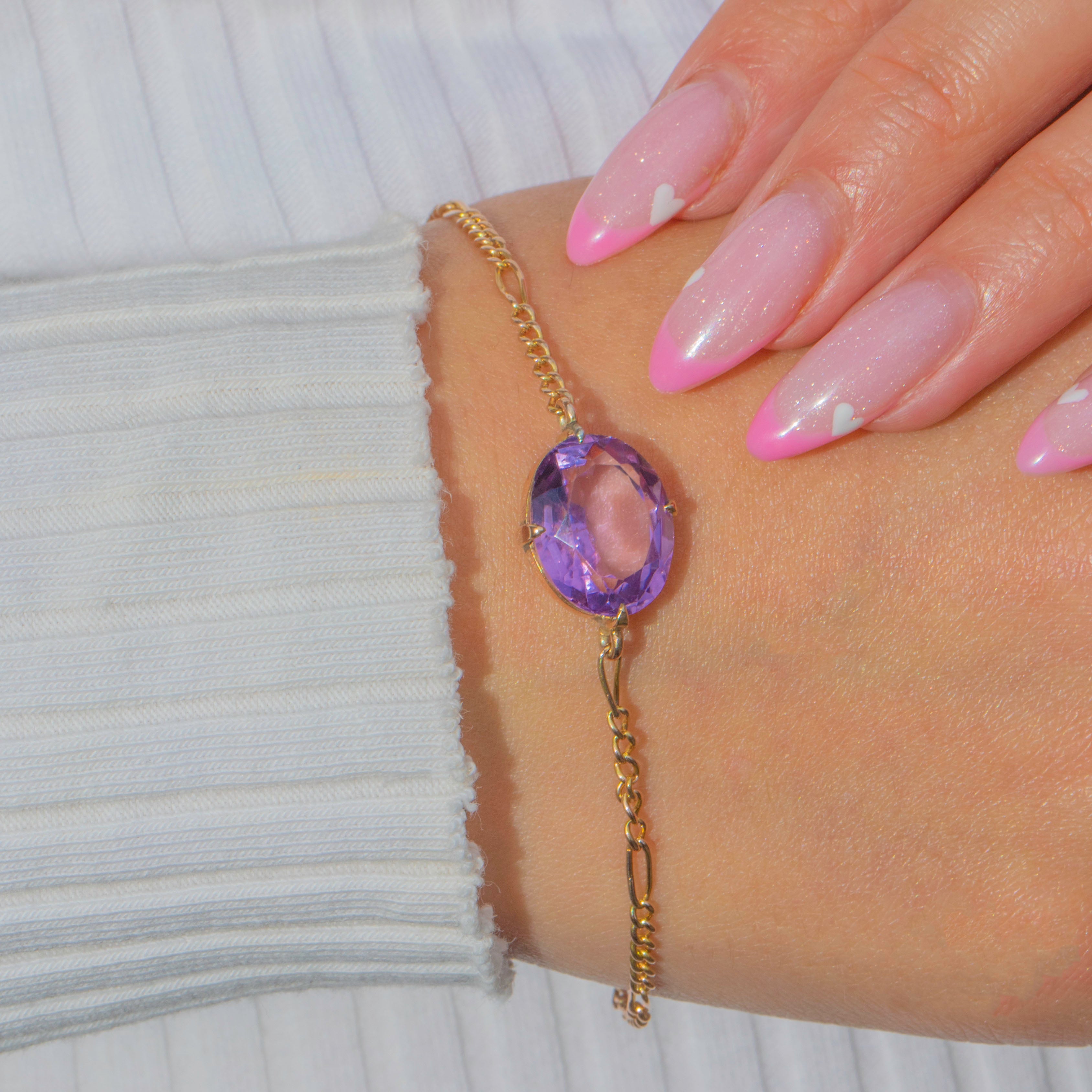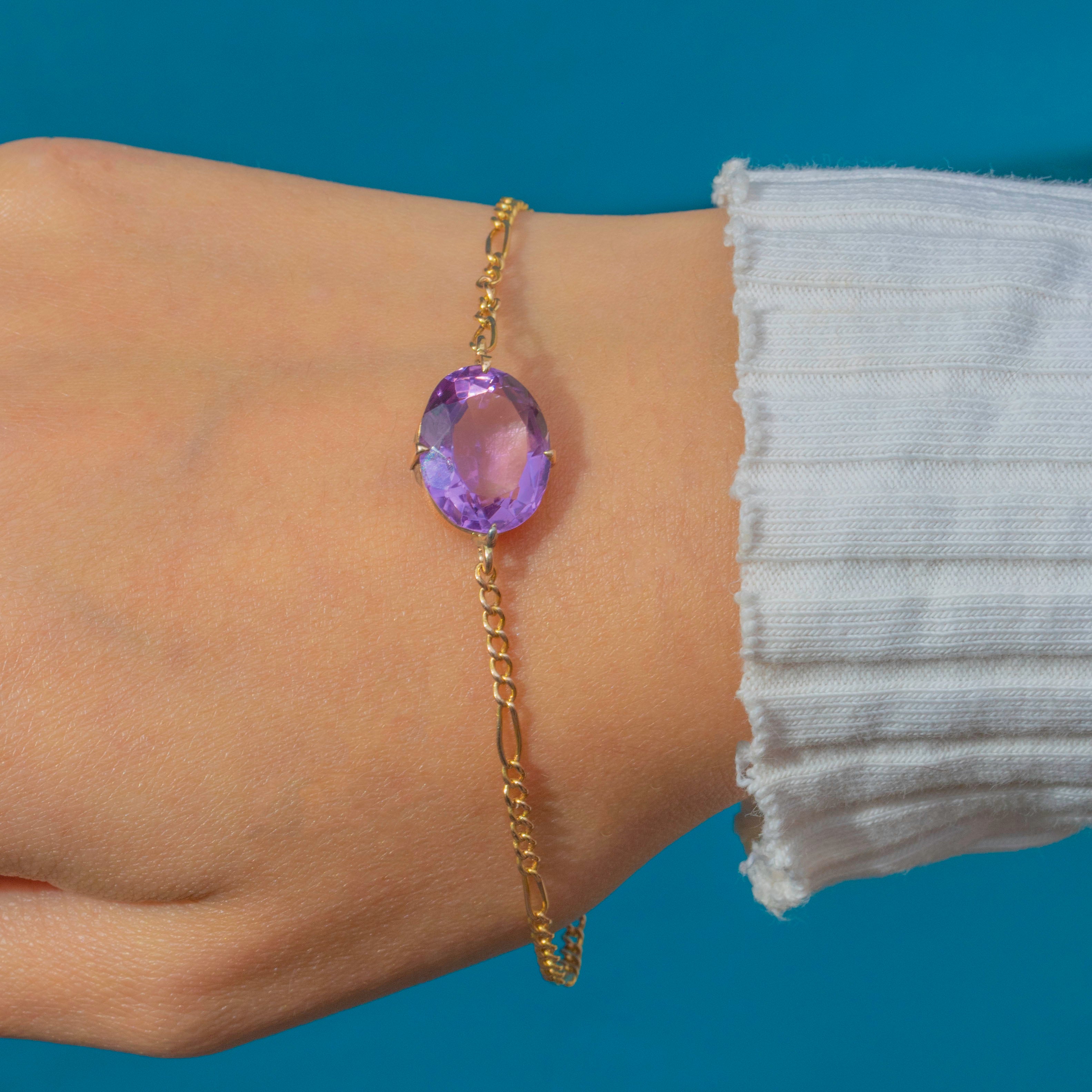 A pretty Victorian Figaro bracelet in 9ct Gold, set with a richly coloured 3.50ct Amethyst. The crisp figaro links give a delicate, elegant drape, while the glossy oval Amethyst adds a vibrant pop of purple for effortless everyday wear.