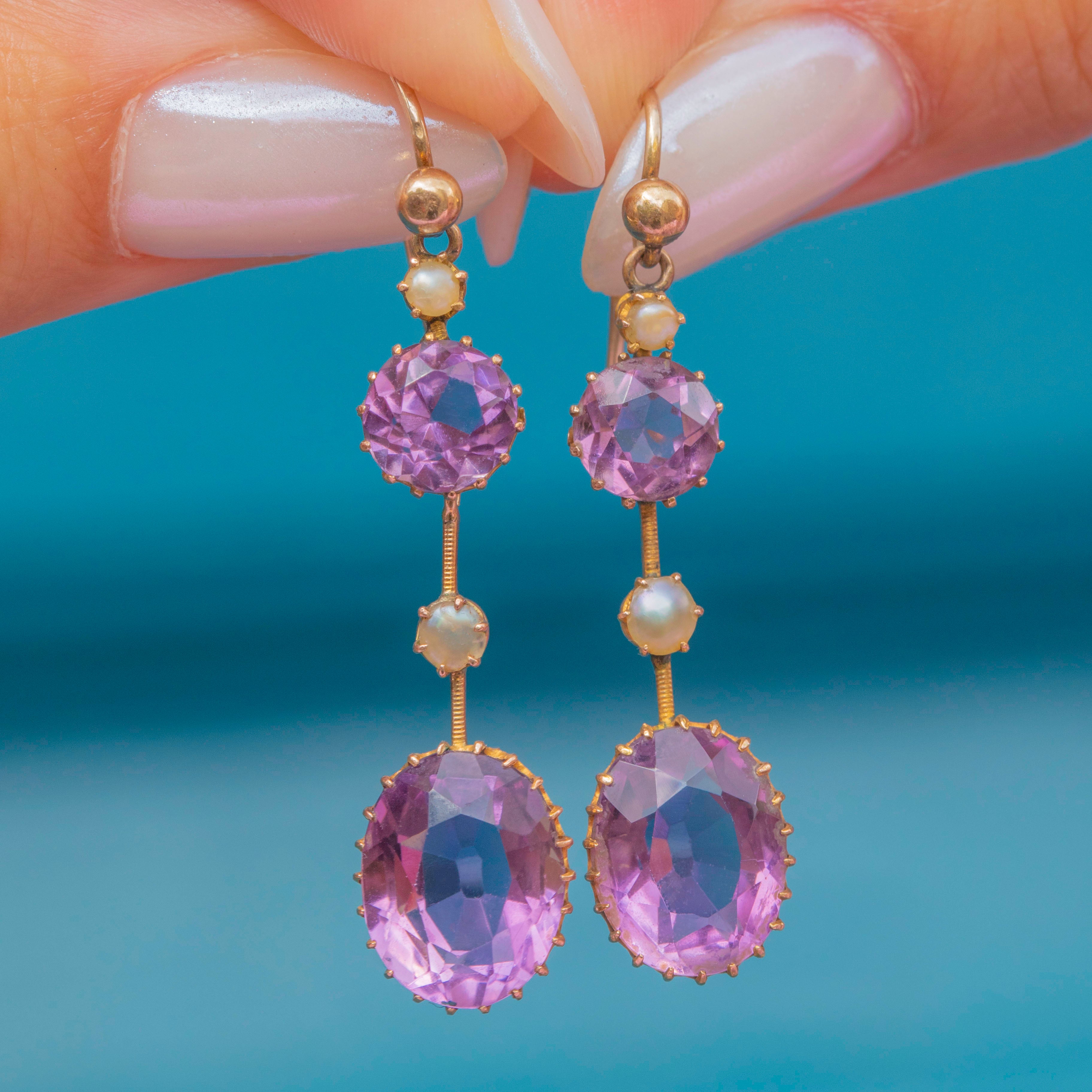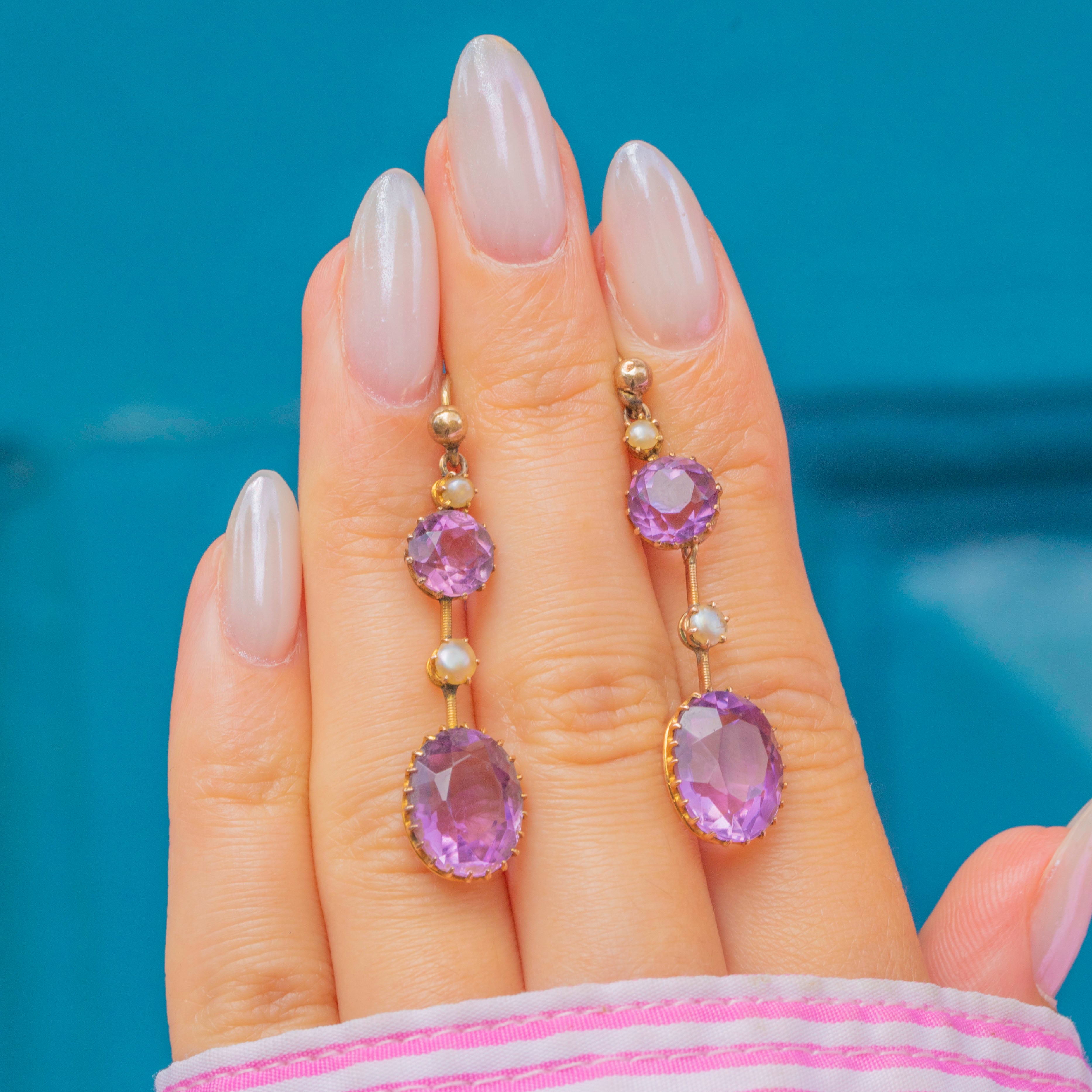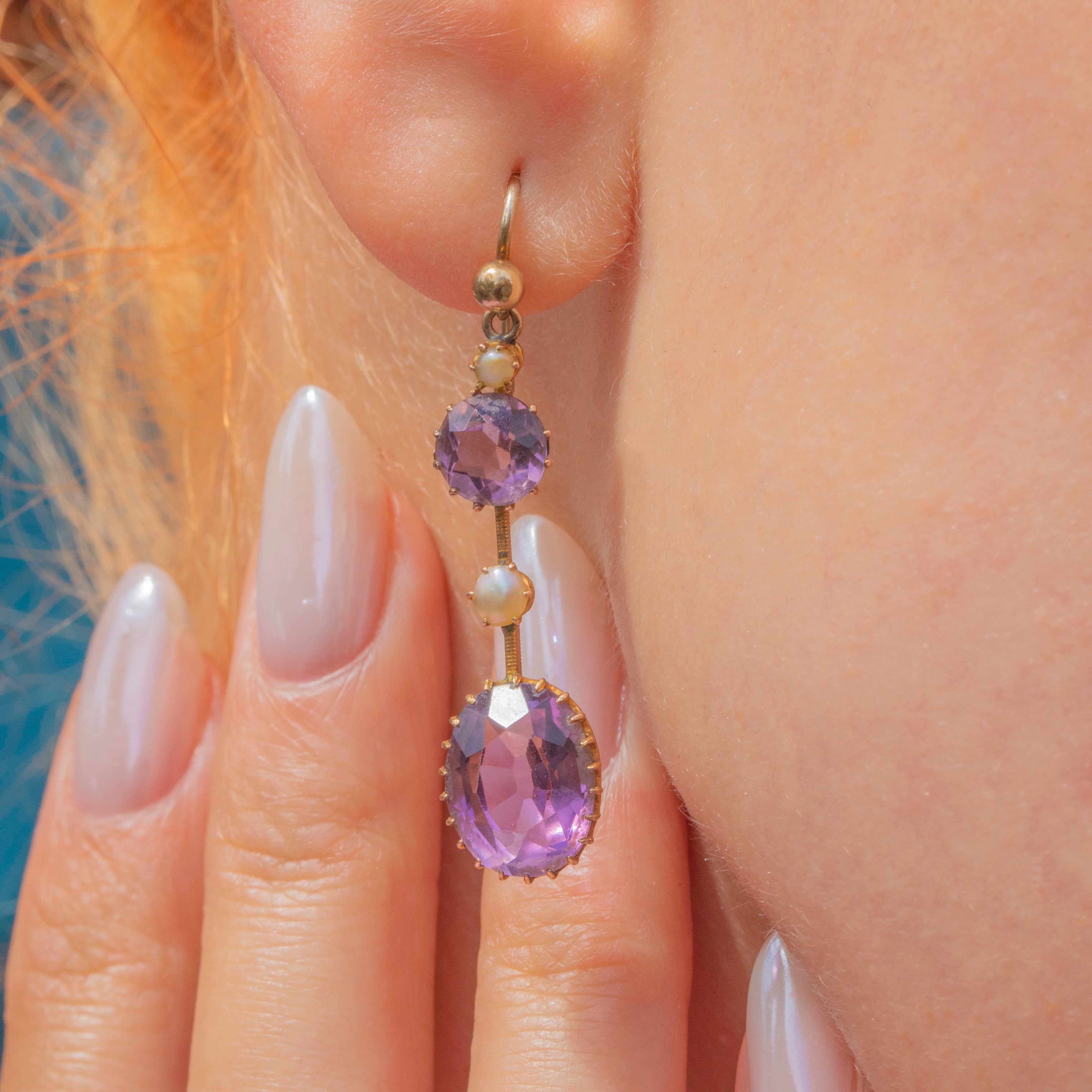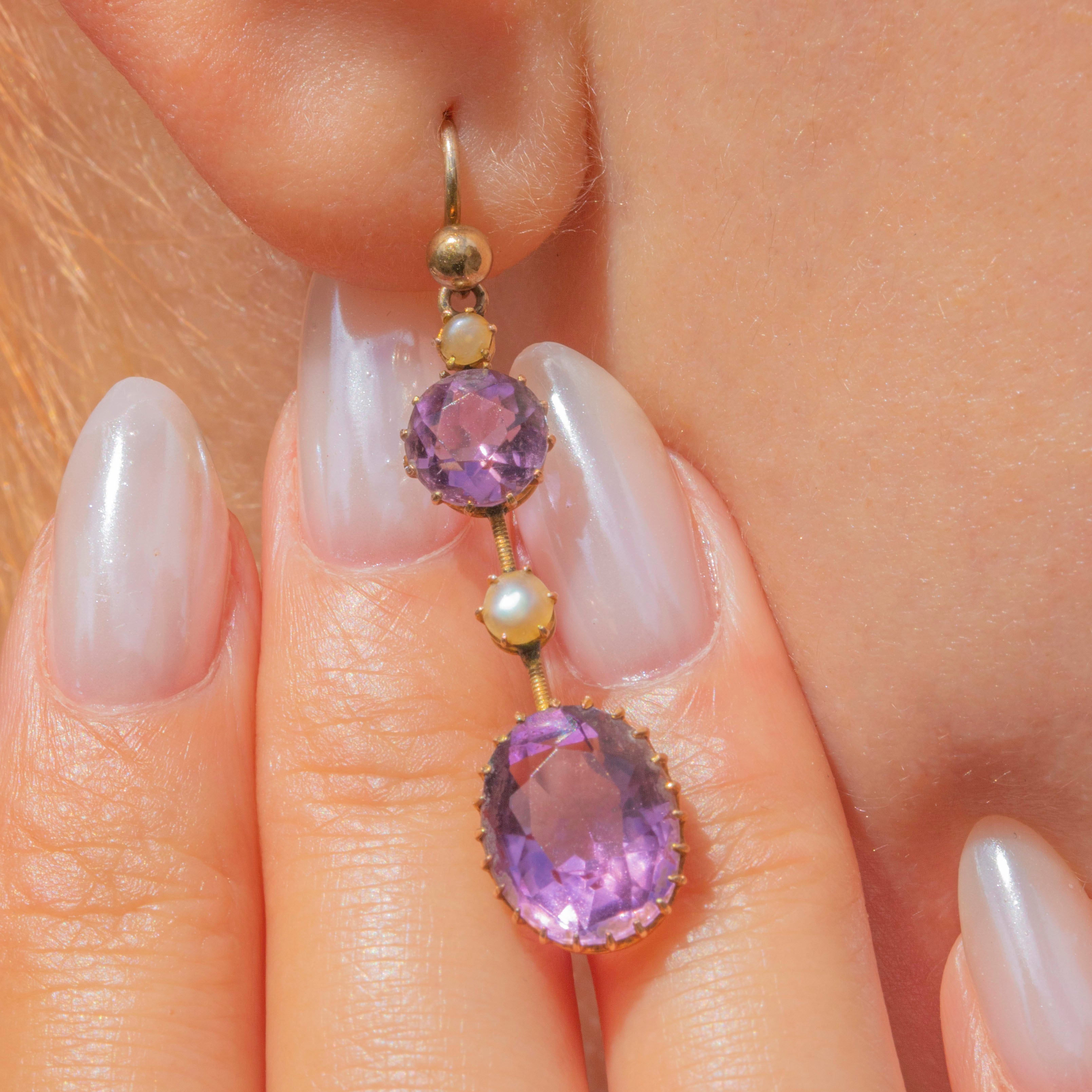 These Victorian earrings are crafted from glossy 9ct Gold, with bar drops that display iridescent Pearls poised in claw settings, followed by a total of 4.55cts of lavender-hued Amethysts.