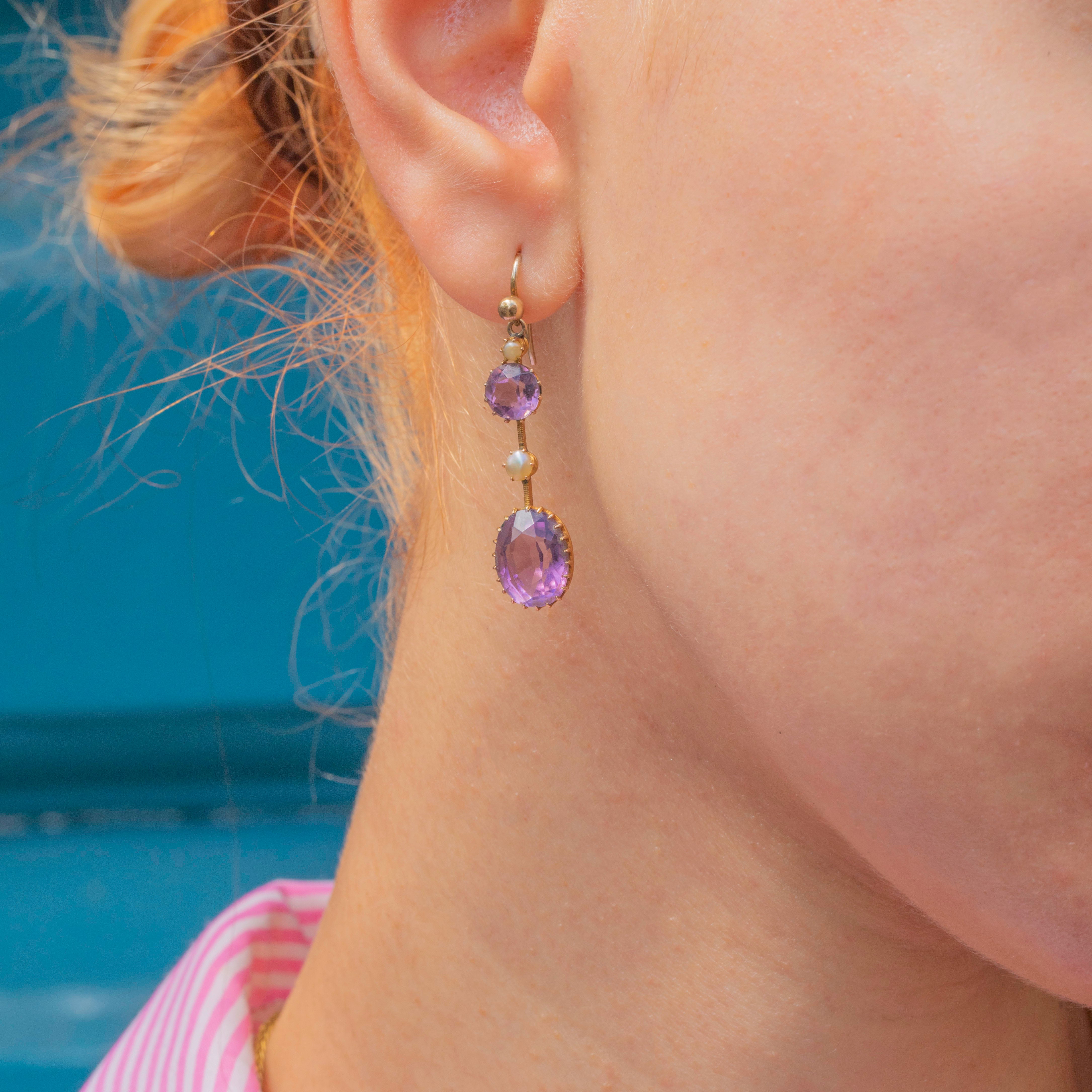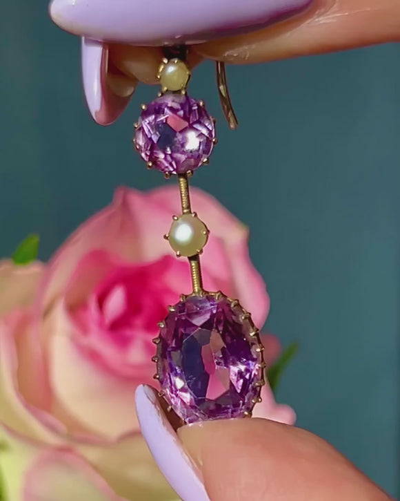Antique 9ct Gold Amethyst Pearl Drop Earrings
