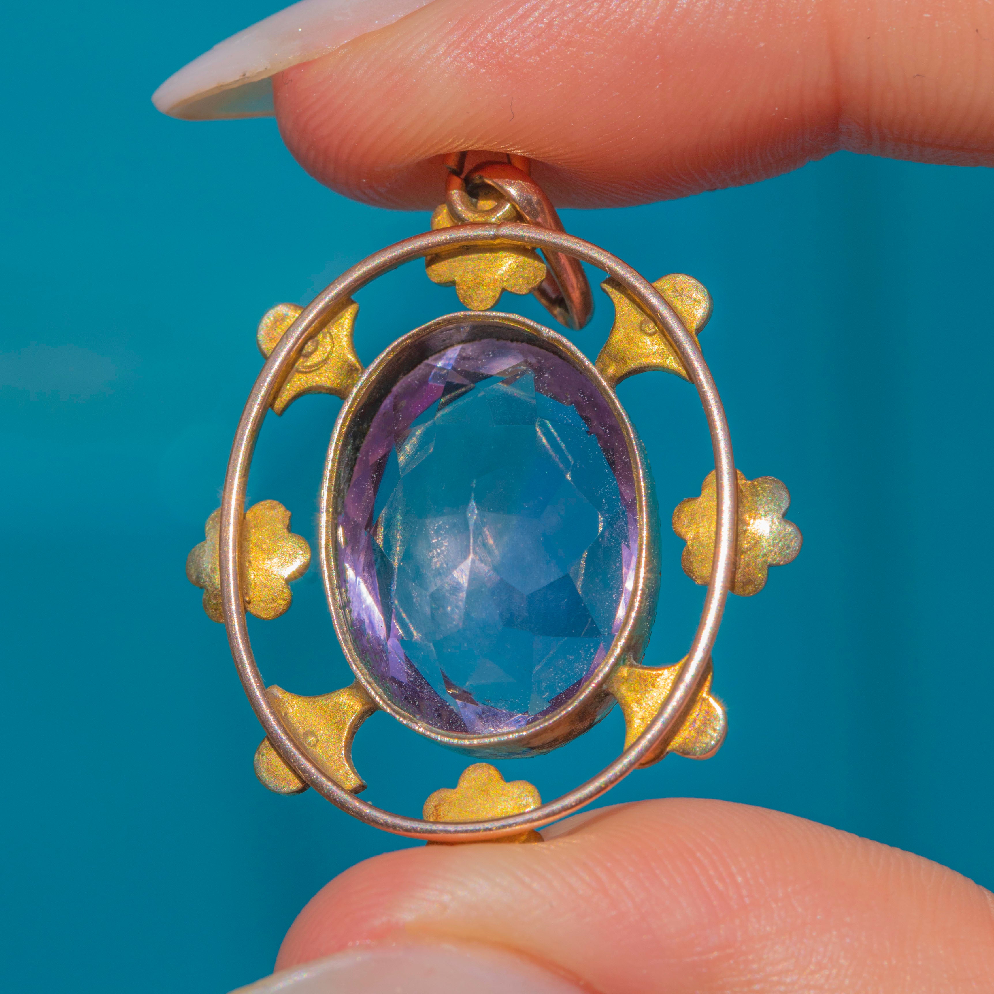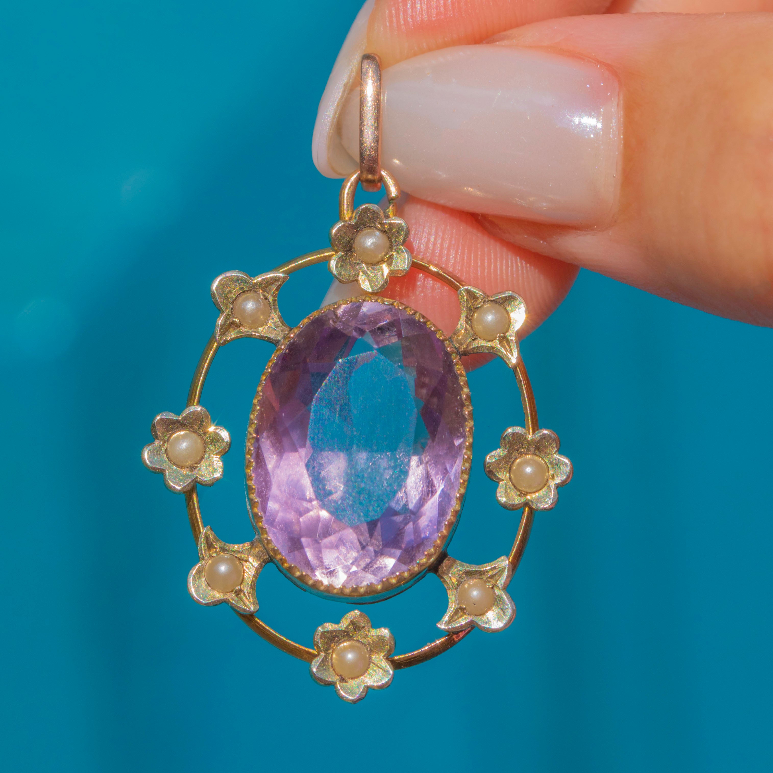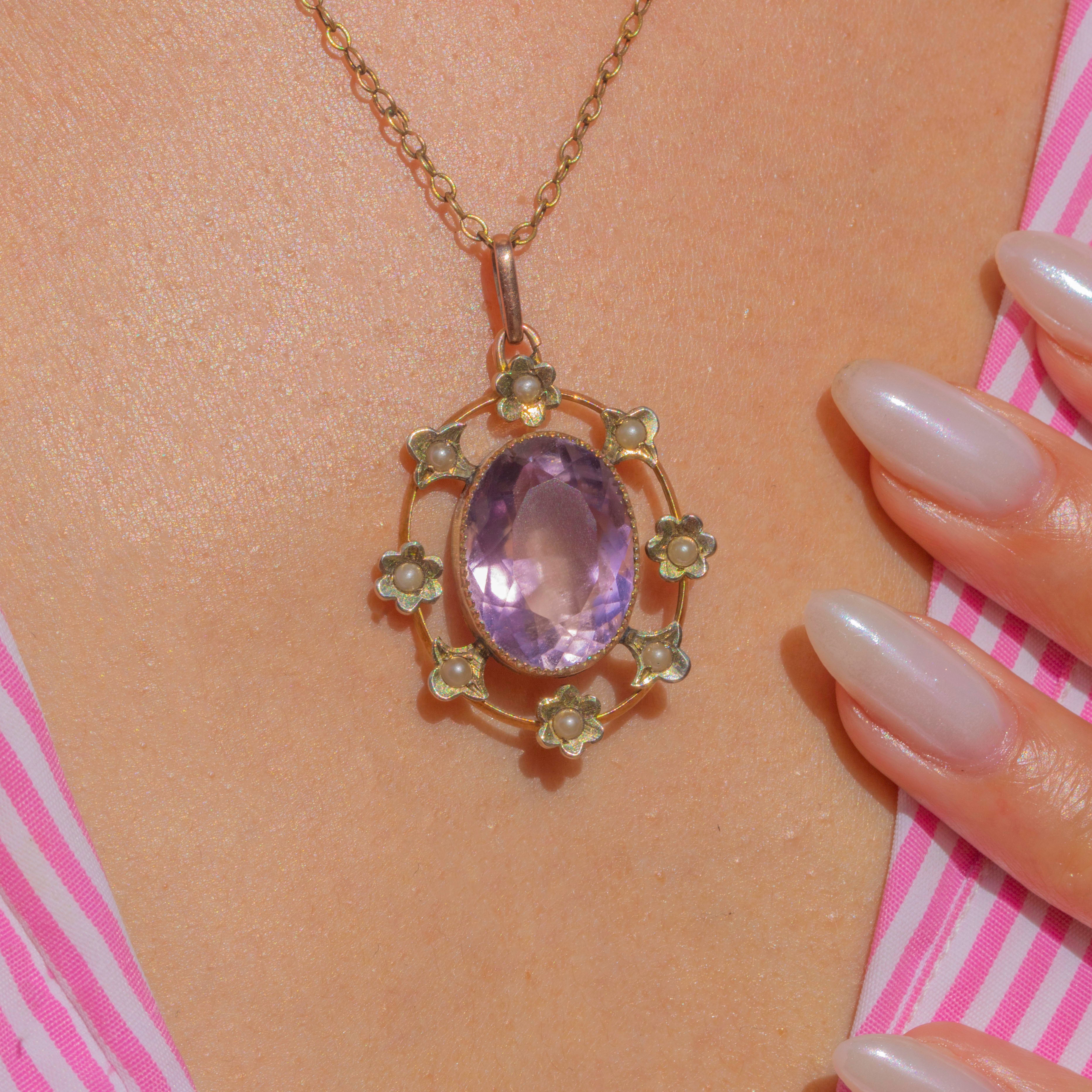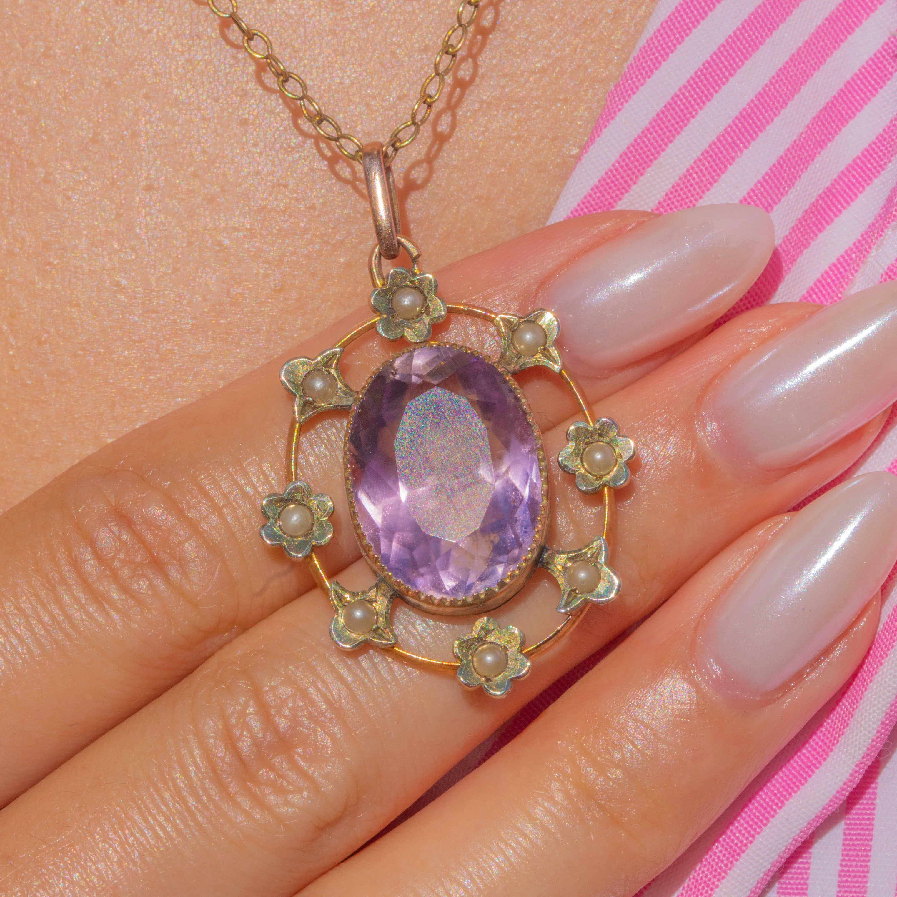 Set with a 9.60ct Amethyst, this antique Gold pendant has a whimsical feel! The lavender-hued Amethyst is haloed by Pearl-set flowers and fleur-de-lys to create a feminine piece that'll pair perfectly with a belcher chain.