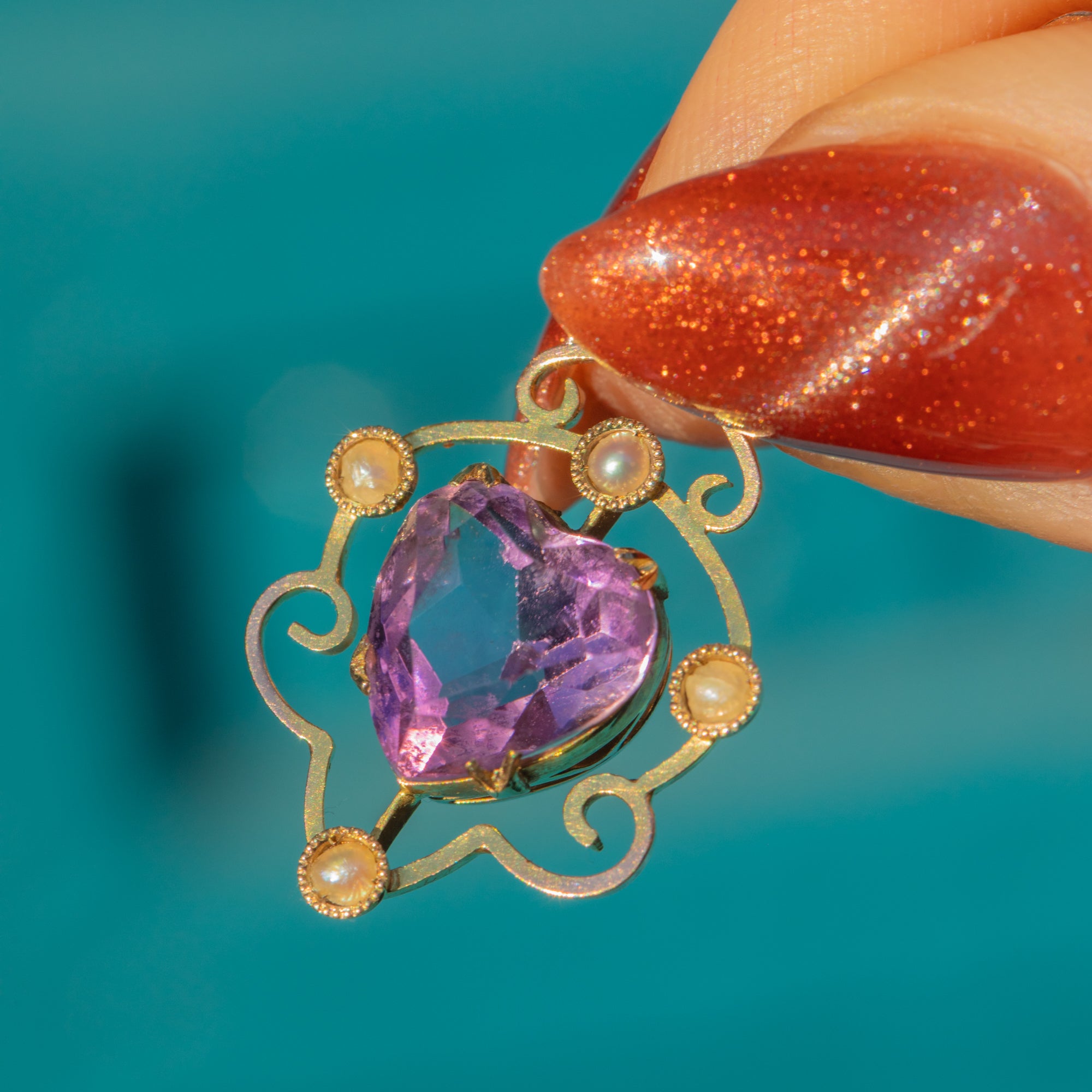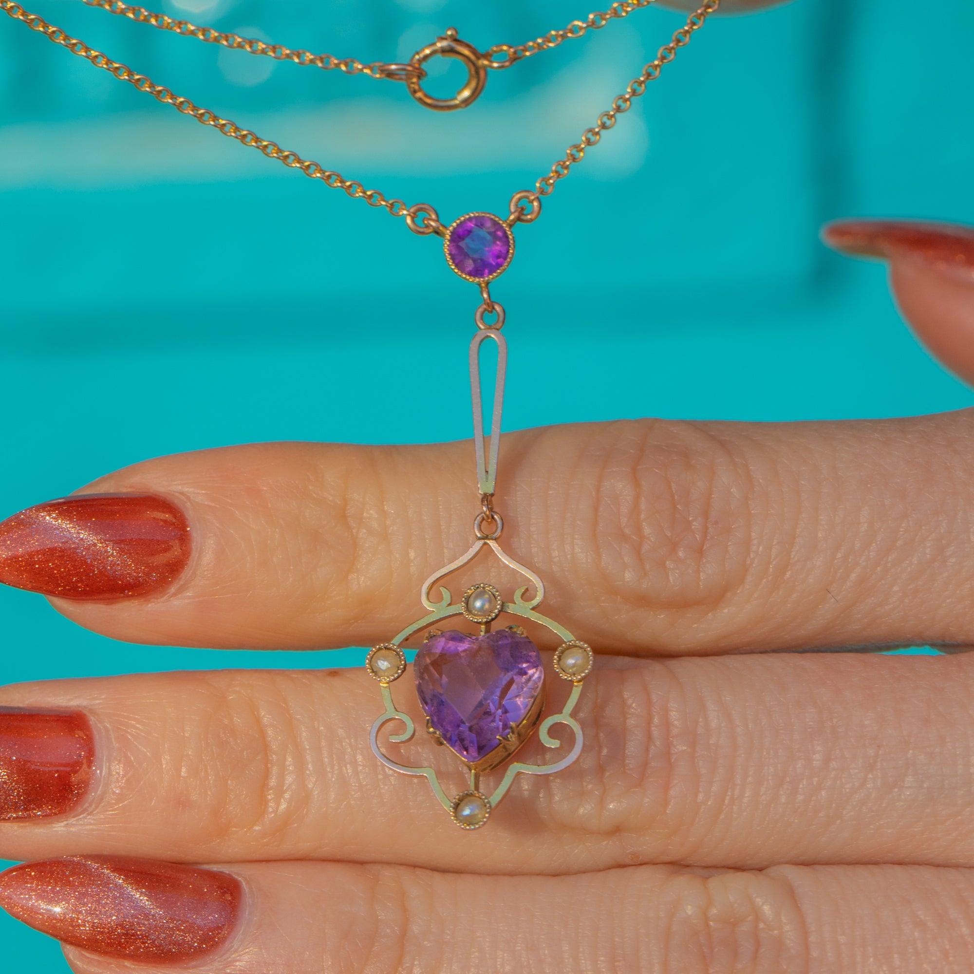 Antique 9ct Gold Amethyst Pearl Heart Necklace, 2.10ct
