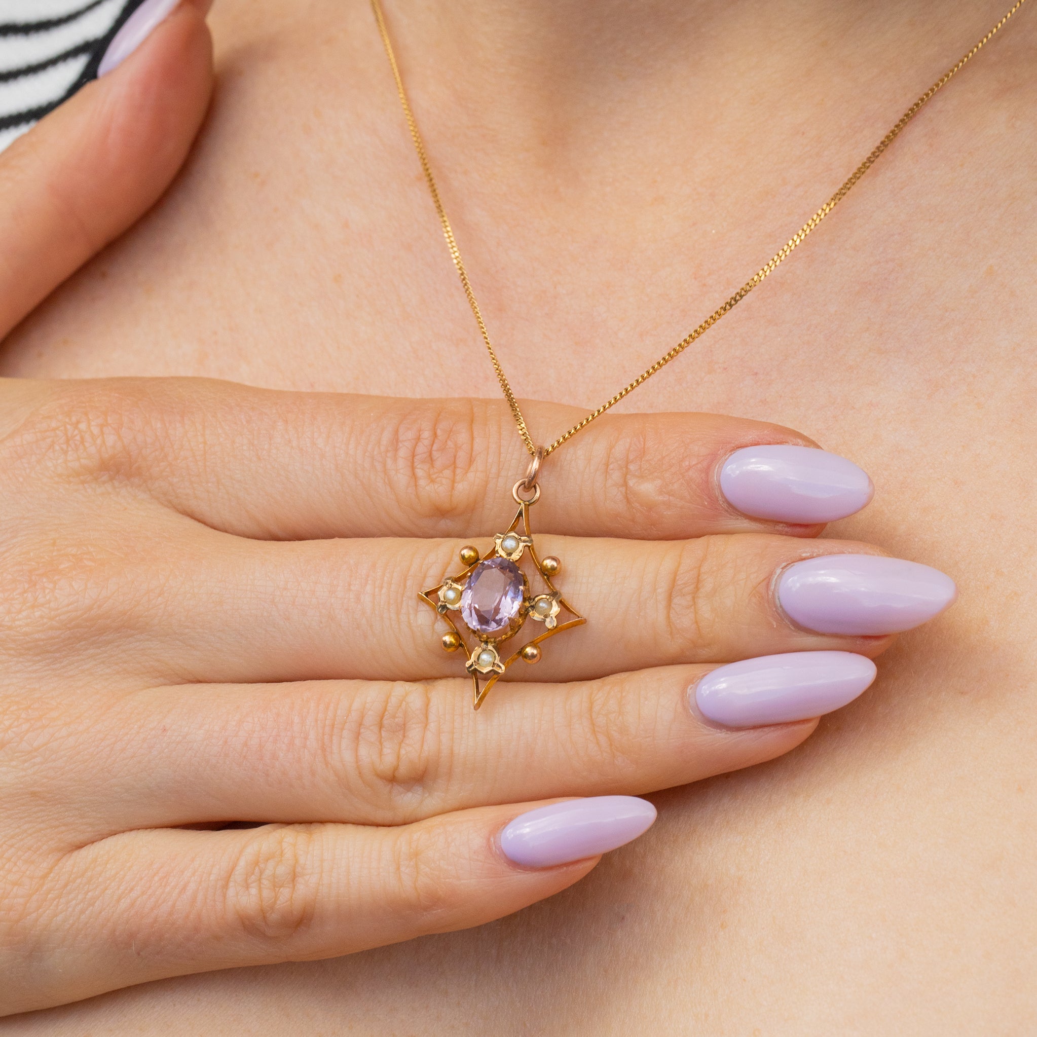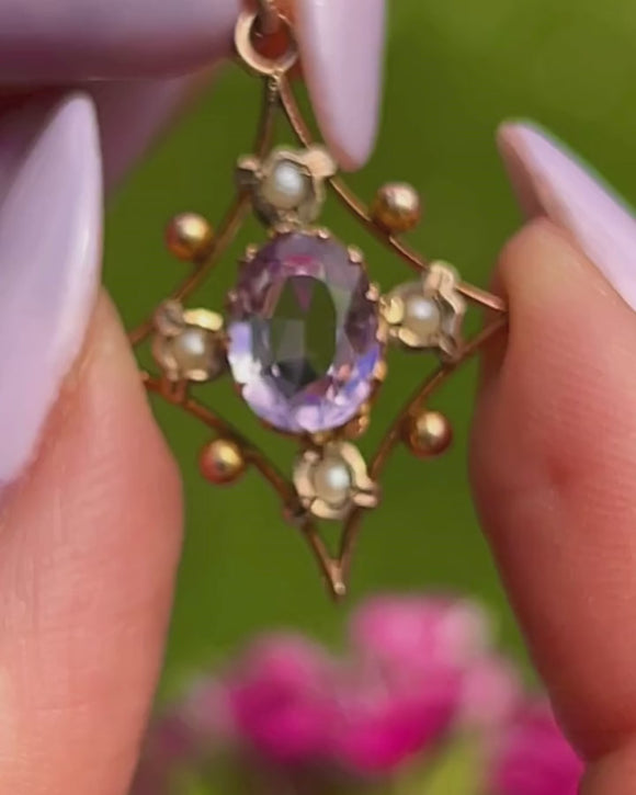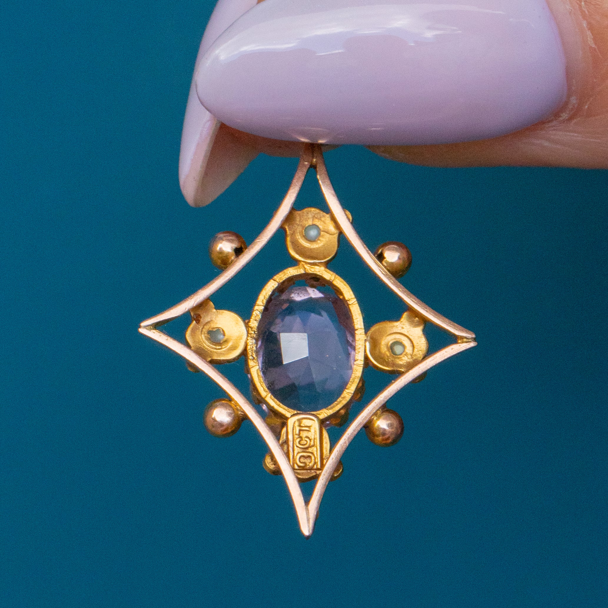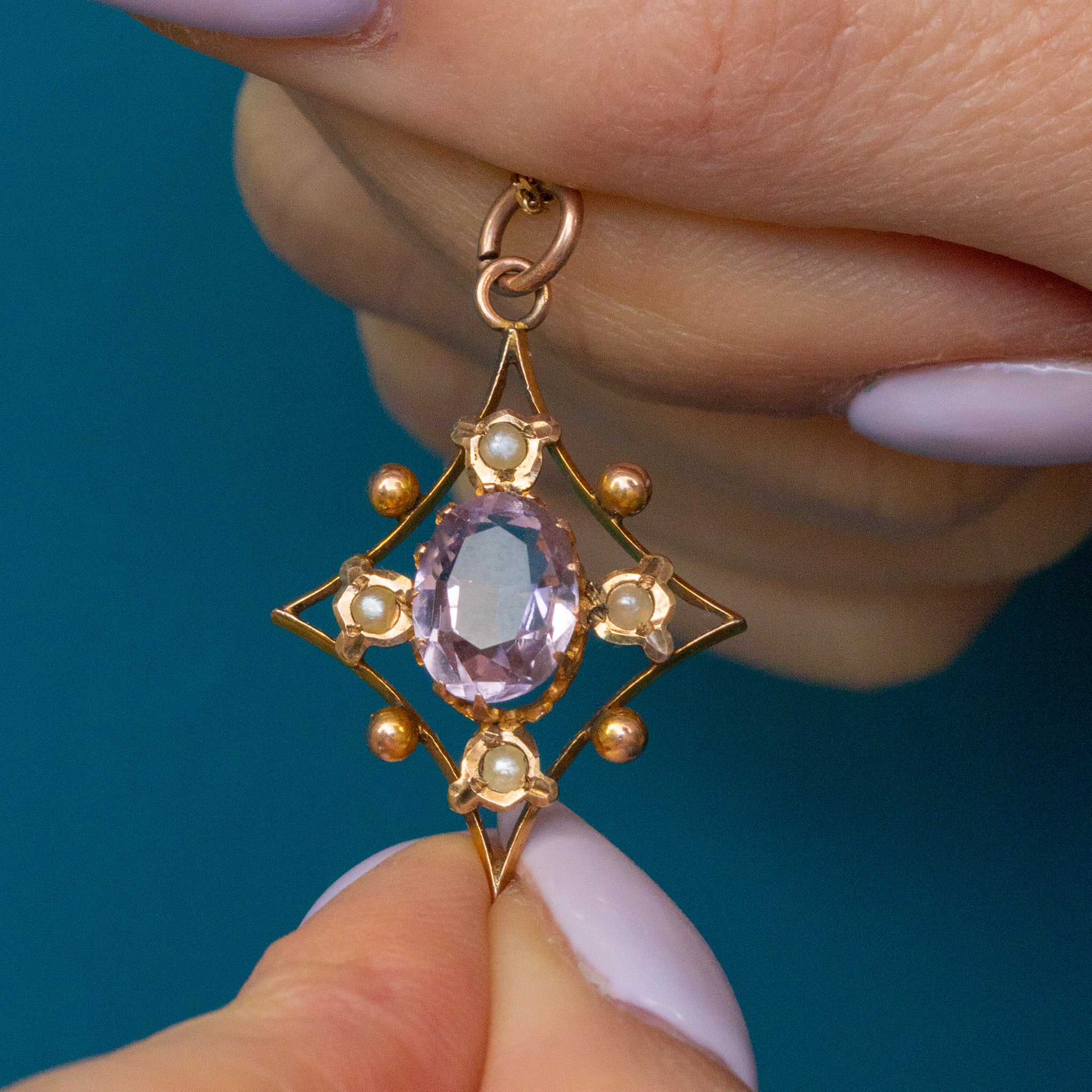 Antique 9ct Gold Amethyst Pearl Pendant, 1.24ct