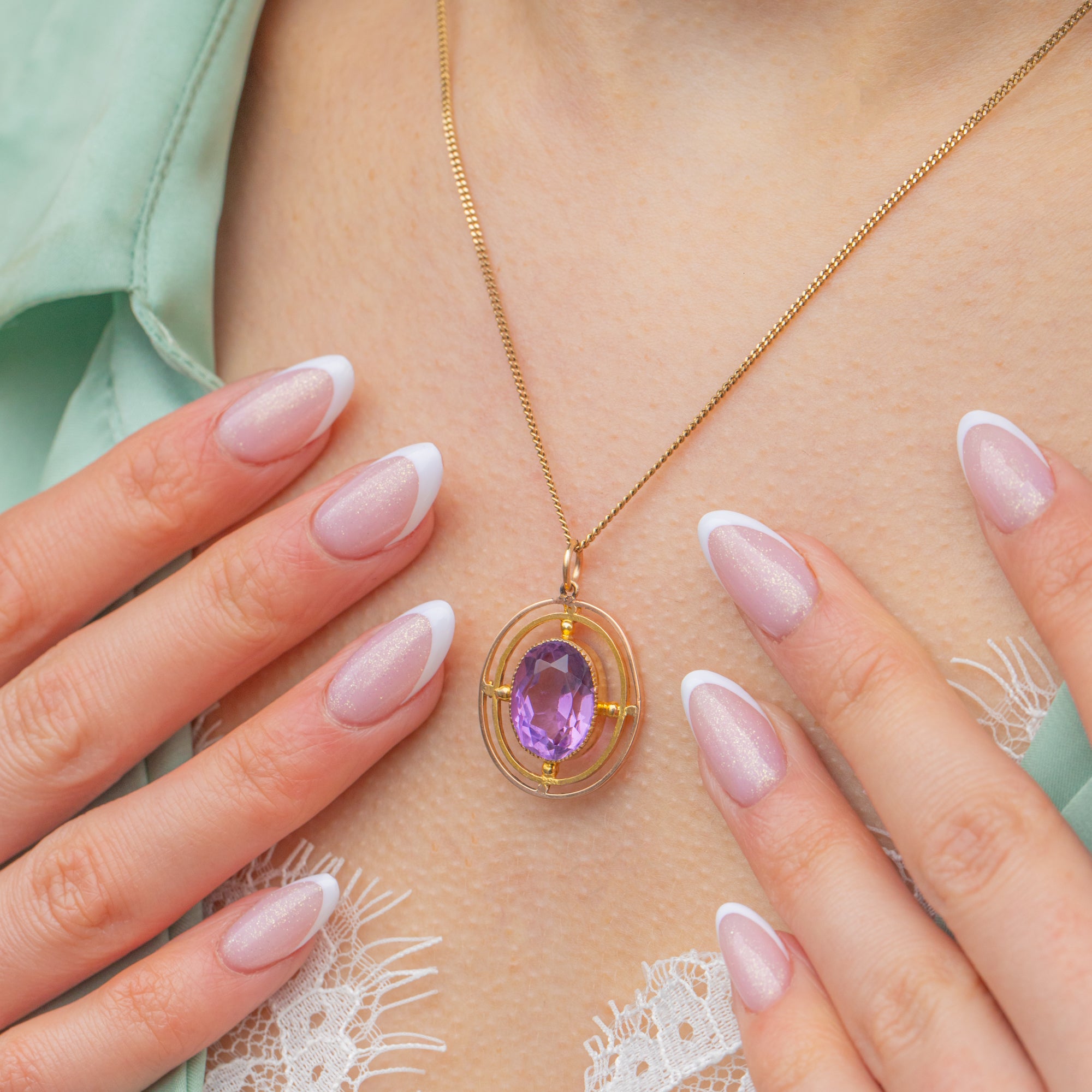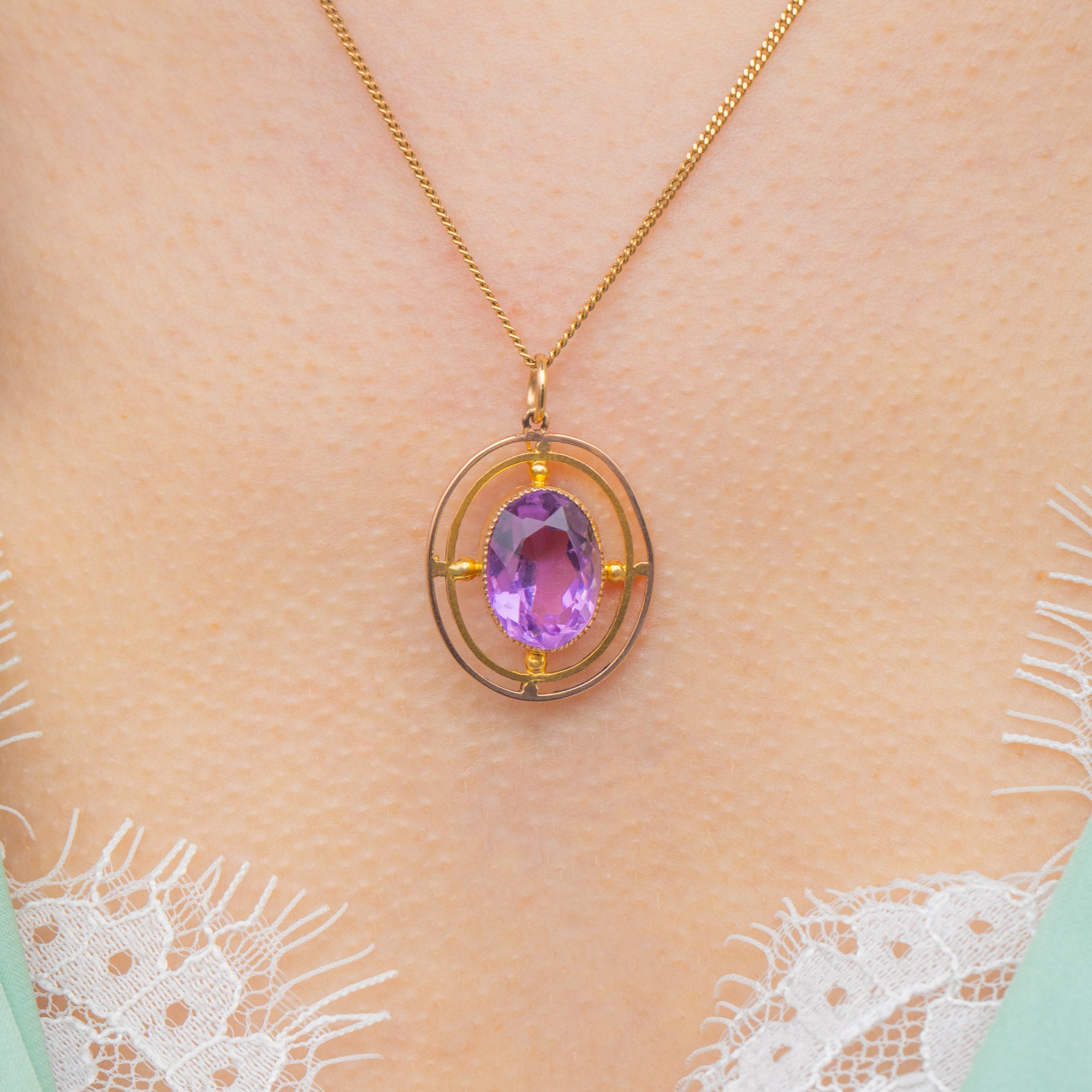 Crafted from buttery 9ct yellow Gold, this Victorian pendant features a 4.05ct Amethyst in her centre, radiating stunning lavender hues. She is encircled by a glossy oval border in a classic target design.