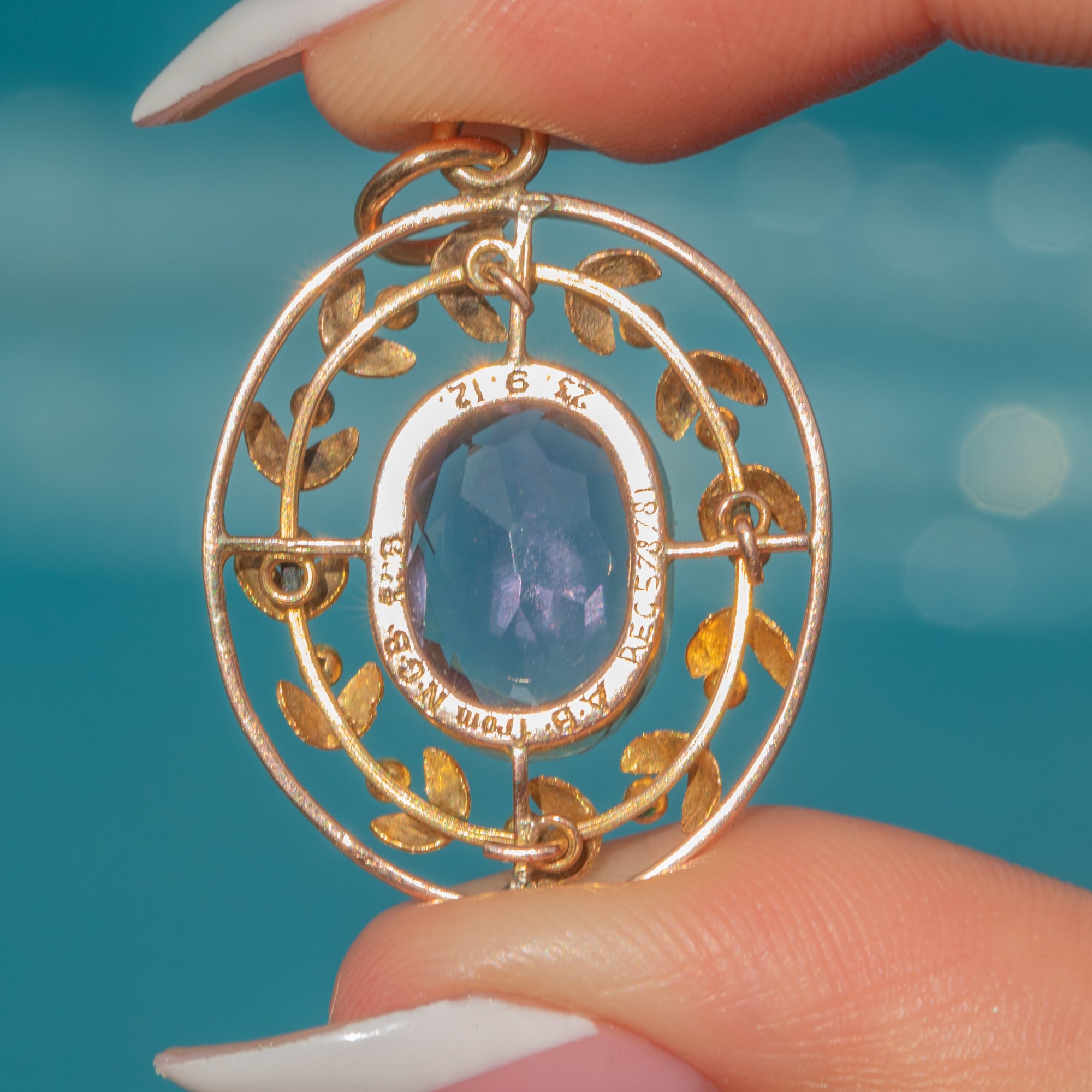 Antique 9ct Gold Amethyst Pendant, Mistletoe Leaf Border