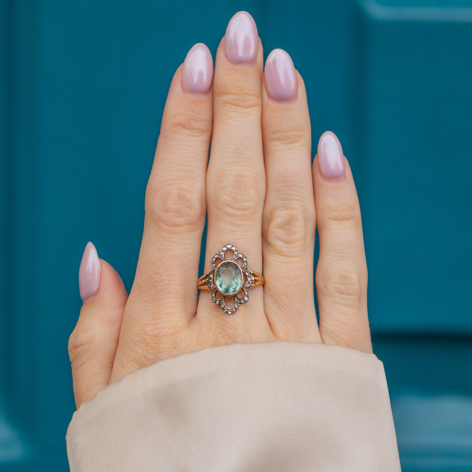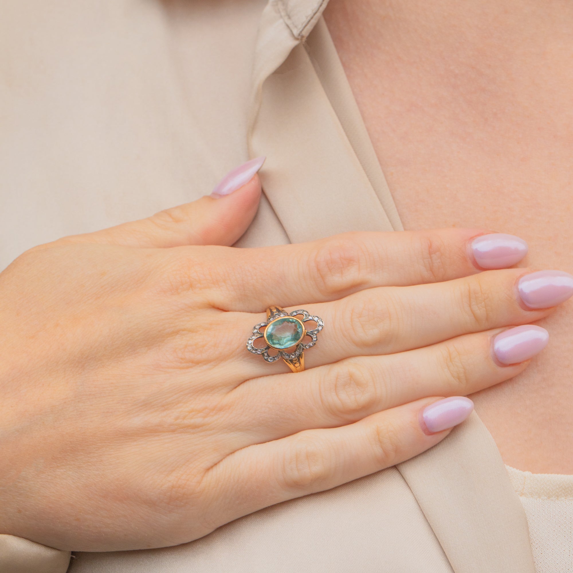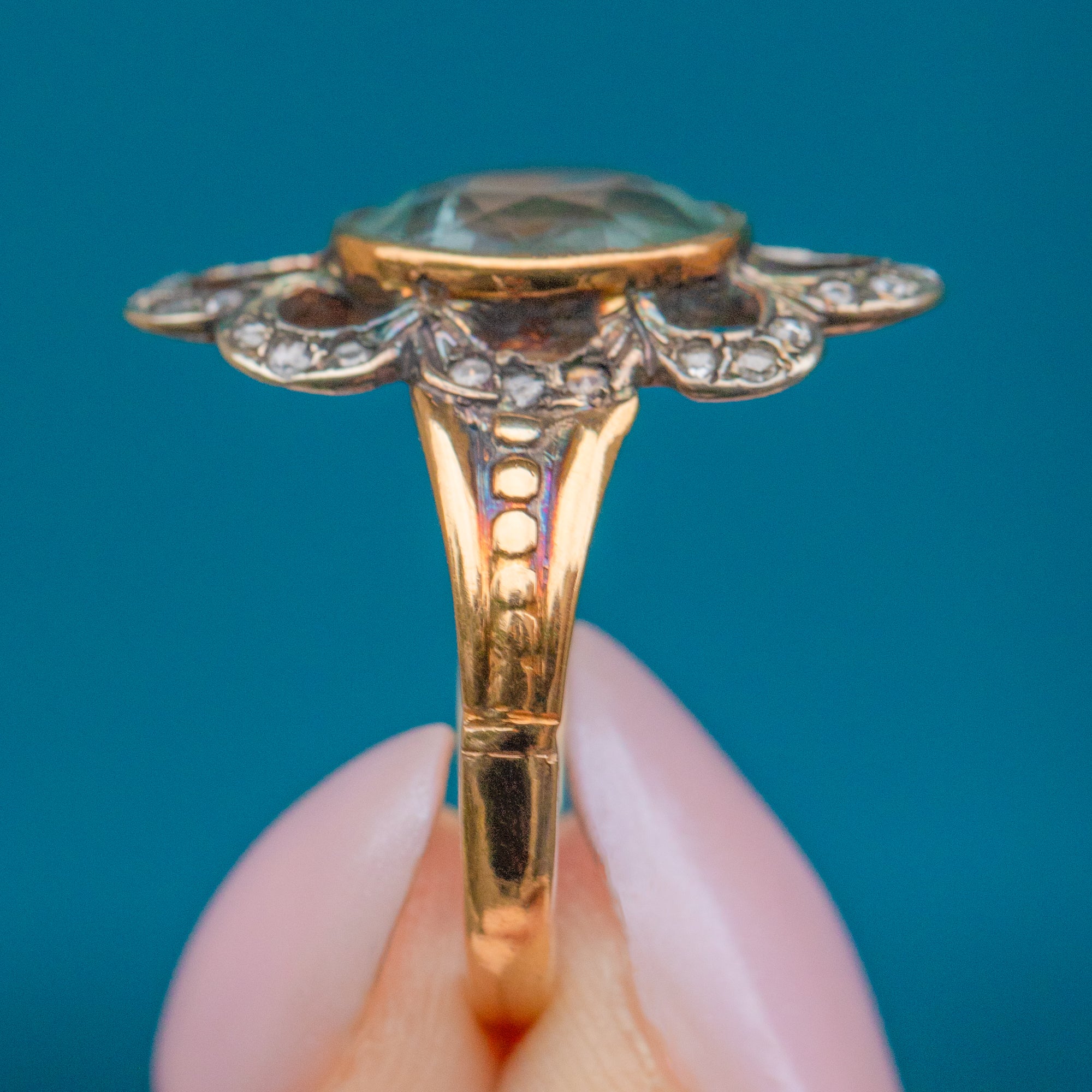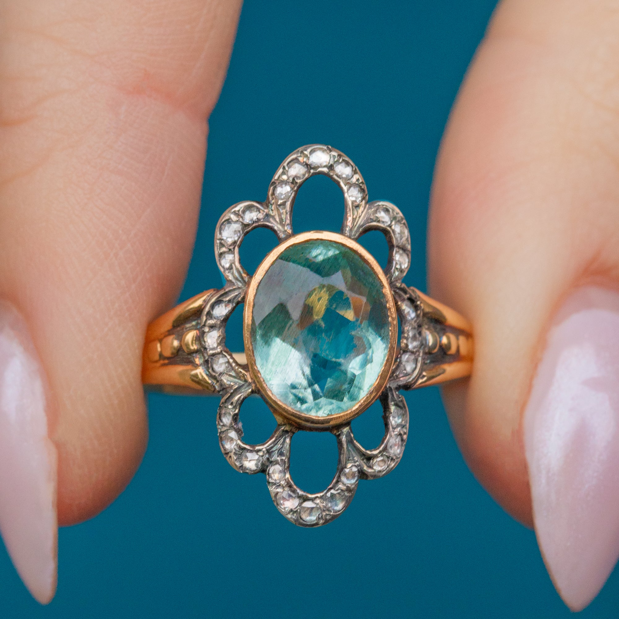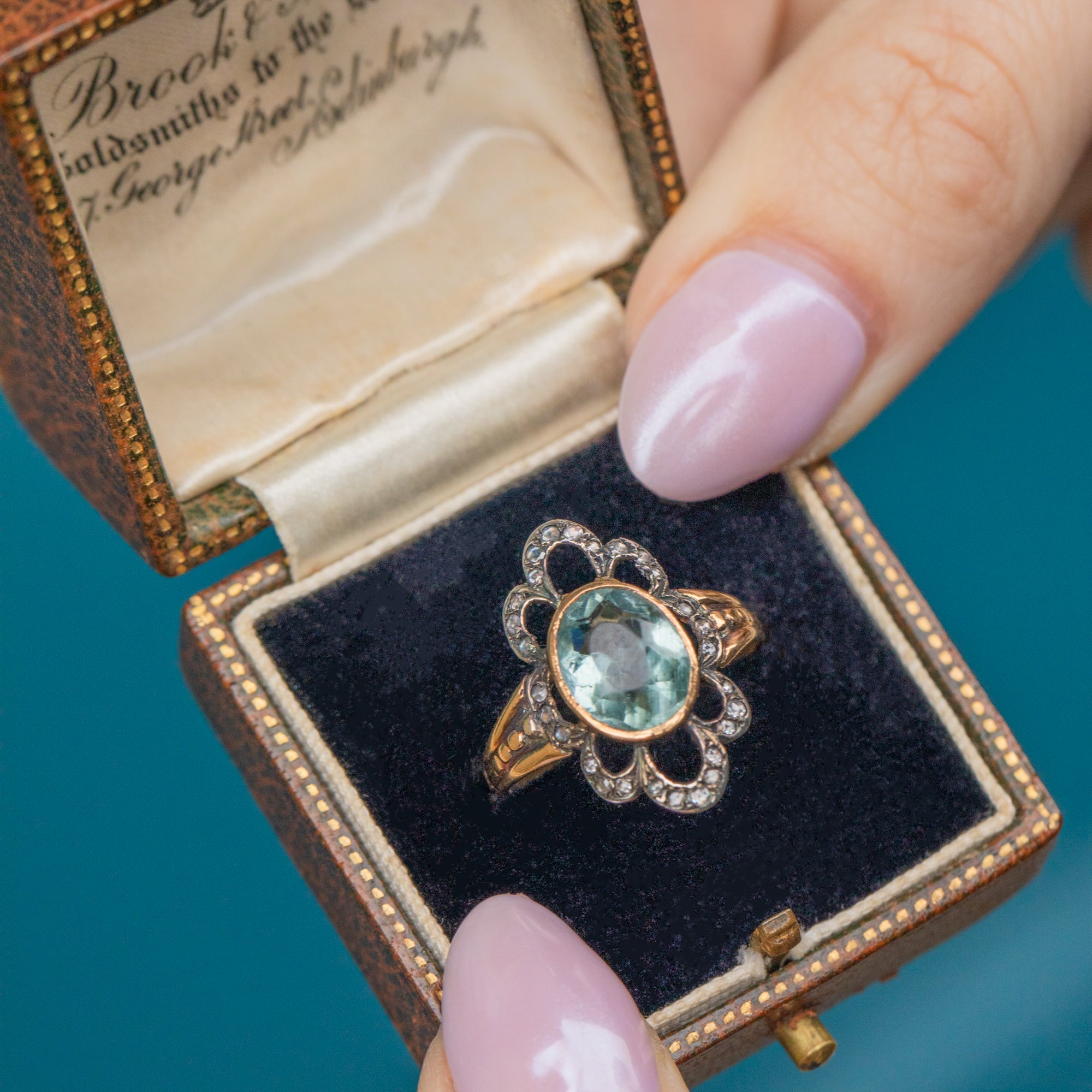 Antique 9ct Gold Aquamarine Diamond Flower Ring, 1.30ct Aquamarine