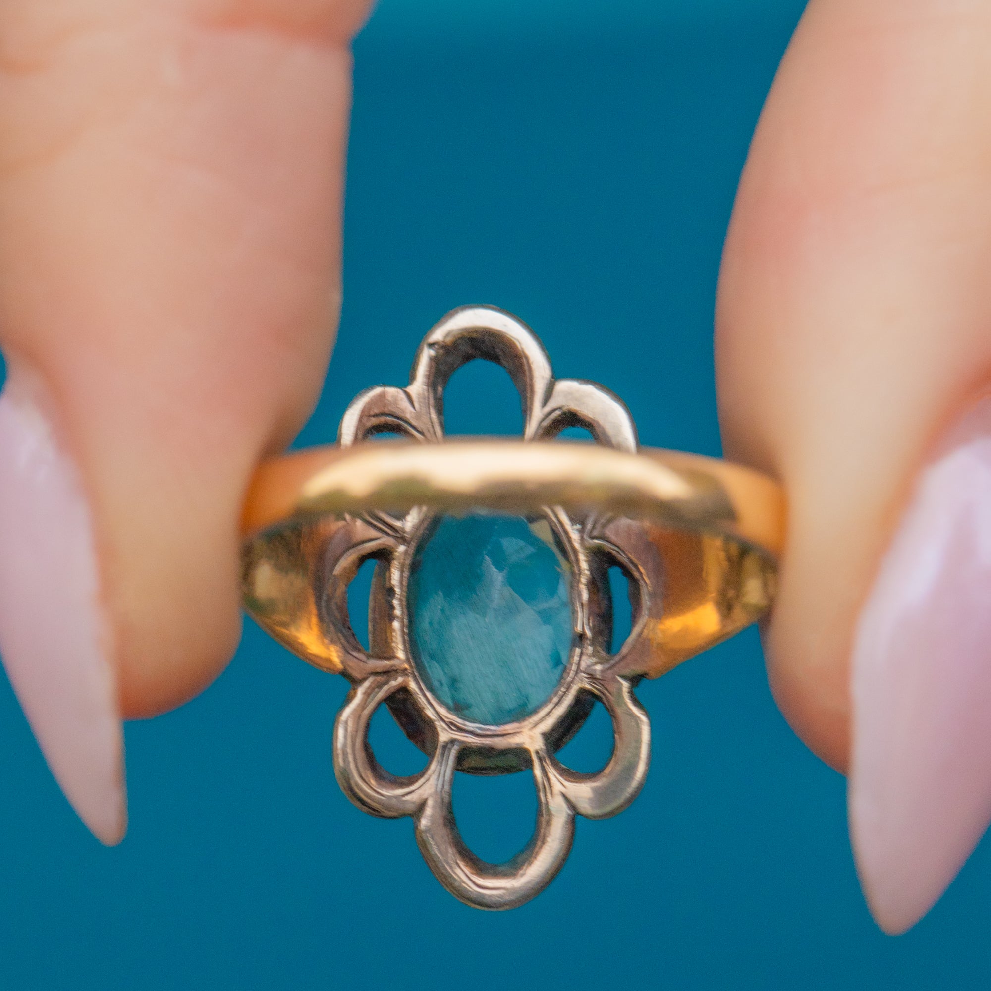 This gorgeous antique 9ct Gold Aquamarine Diamond flower ring will make an impact wherever she goes! This treasure has been crafted from 9ct Gold and is home to a pastel blue Aquamarine at the centre, surrounded by rose-cut Diamond gems set into Silver.