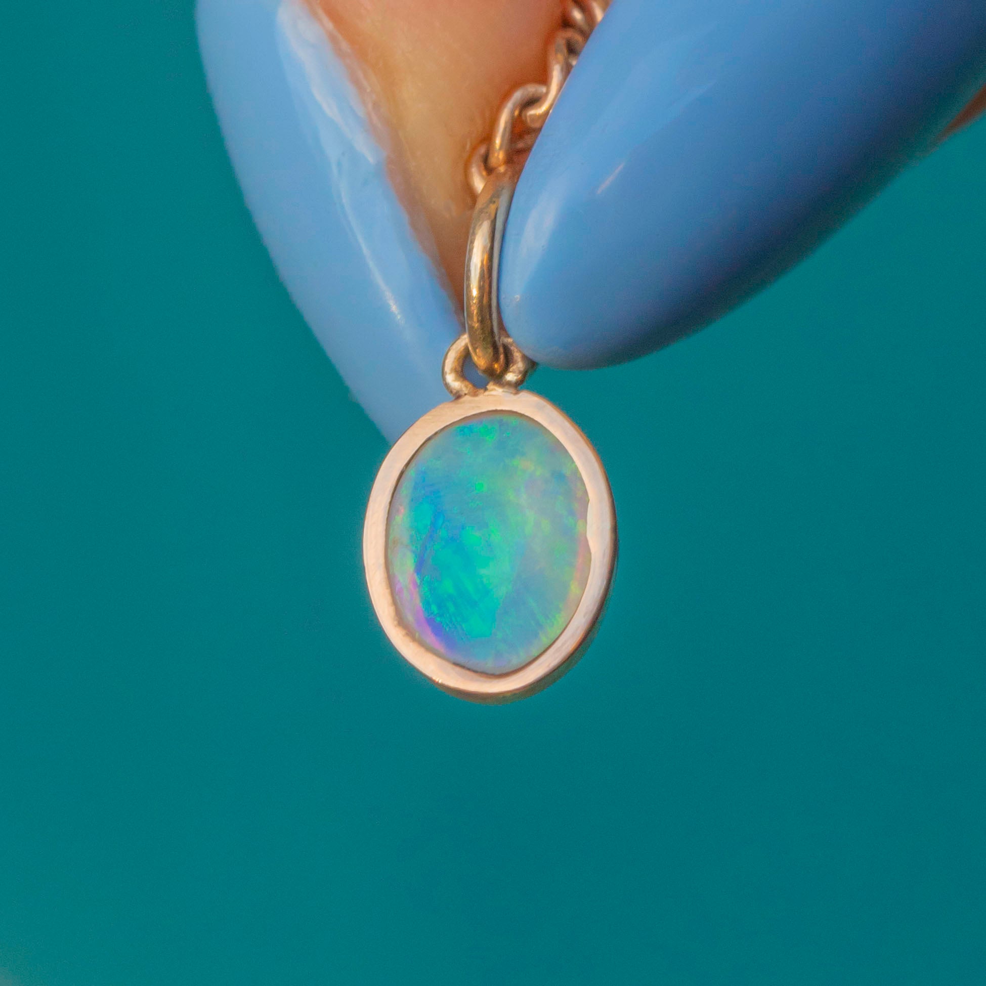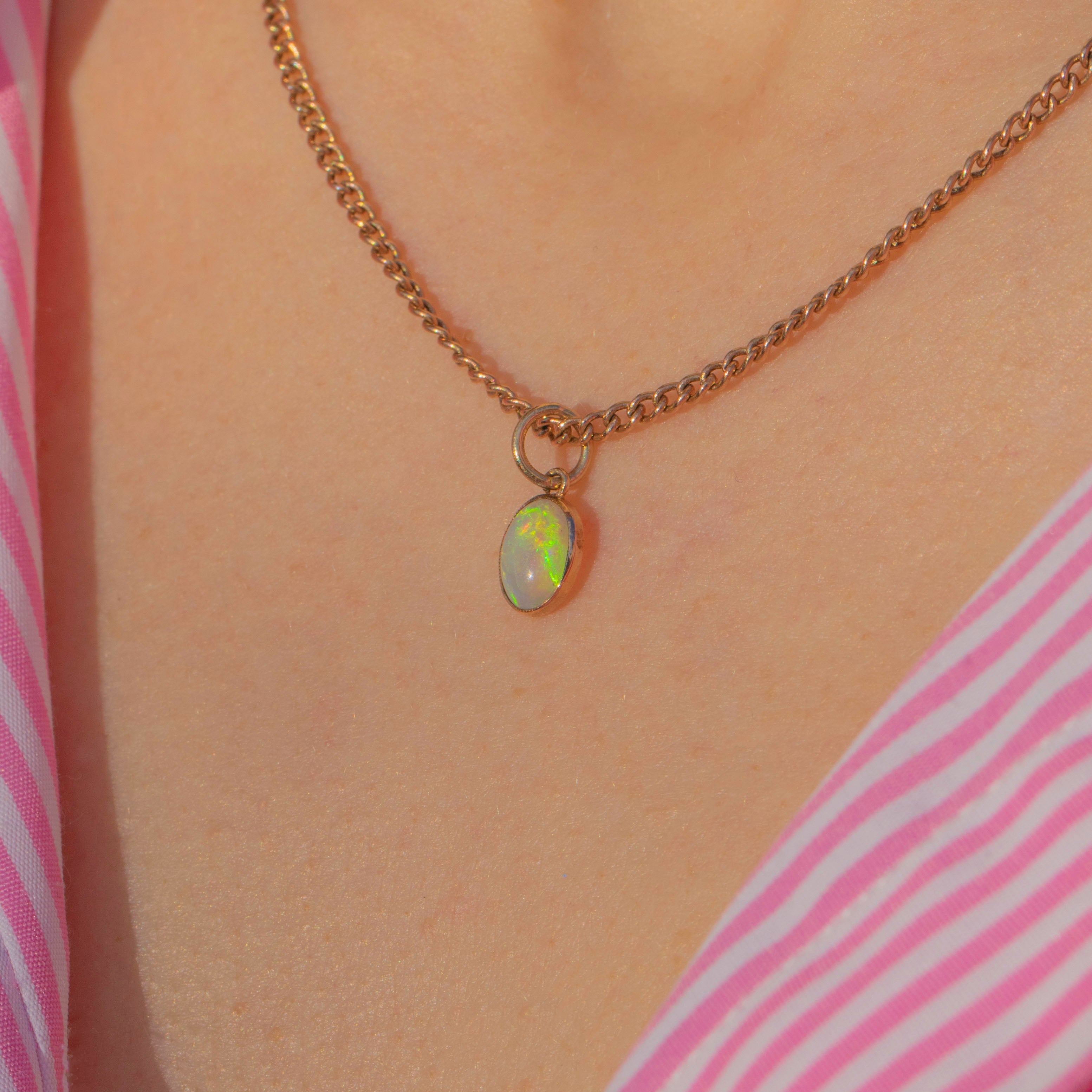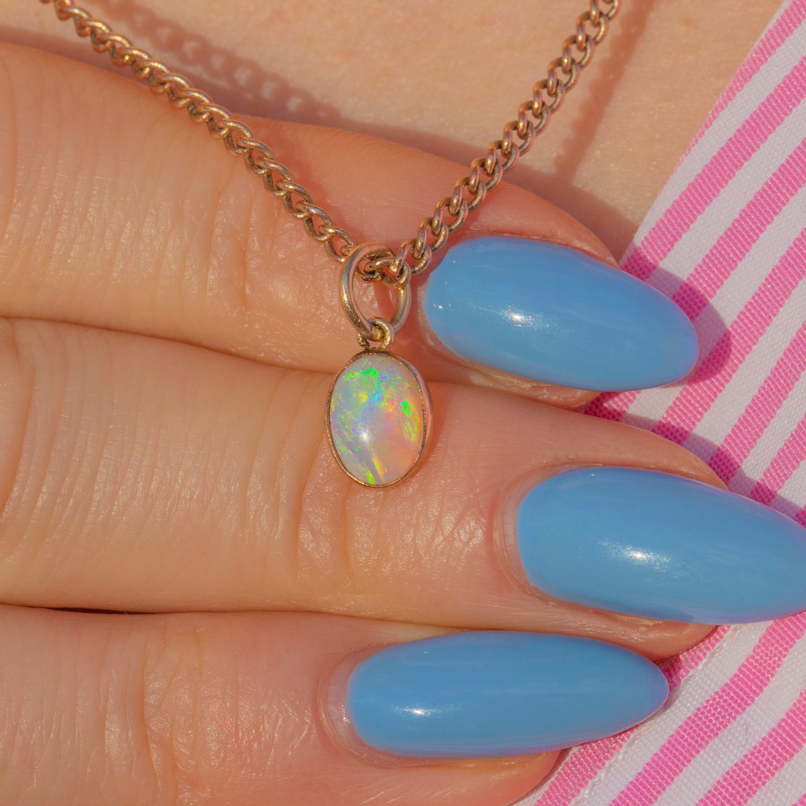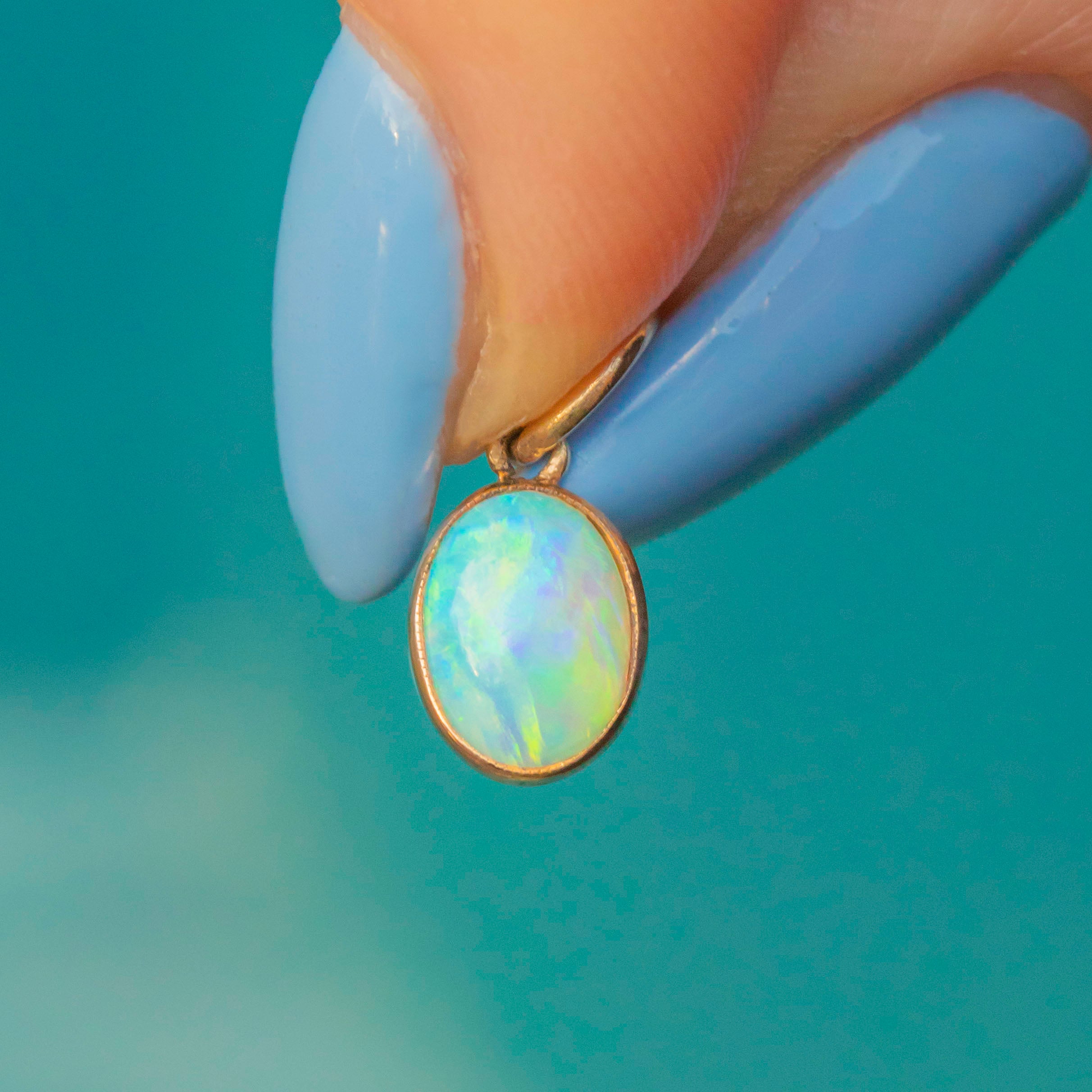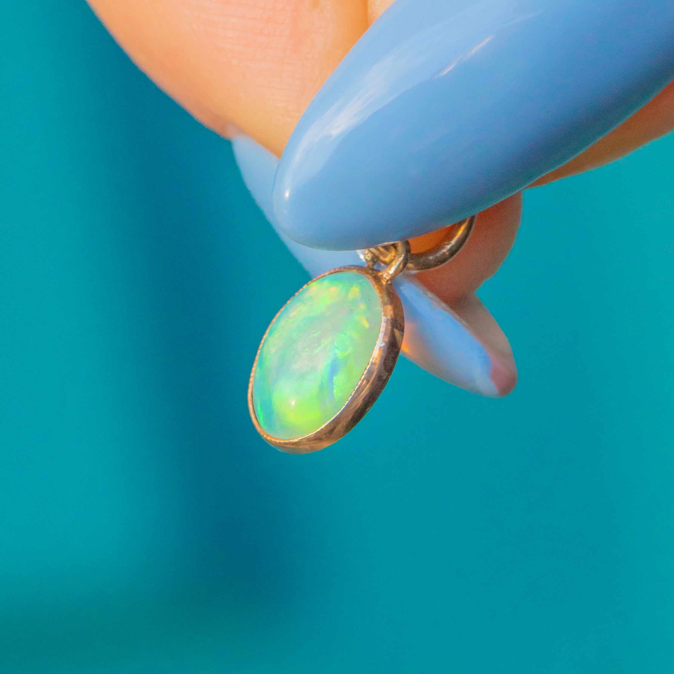 Add a touch of enchantment to your décolletage with this vibrant antique 9ct Gold bezel-set Opal charm! Displaying zingy pops of greens, blues, and oranges, this 0.61ct Opal cabochon thrives beneath the light.