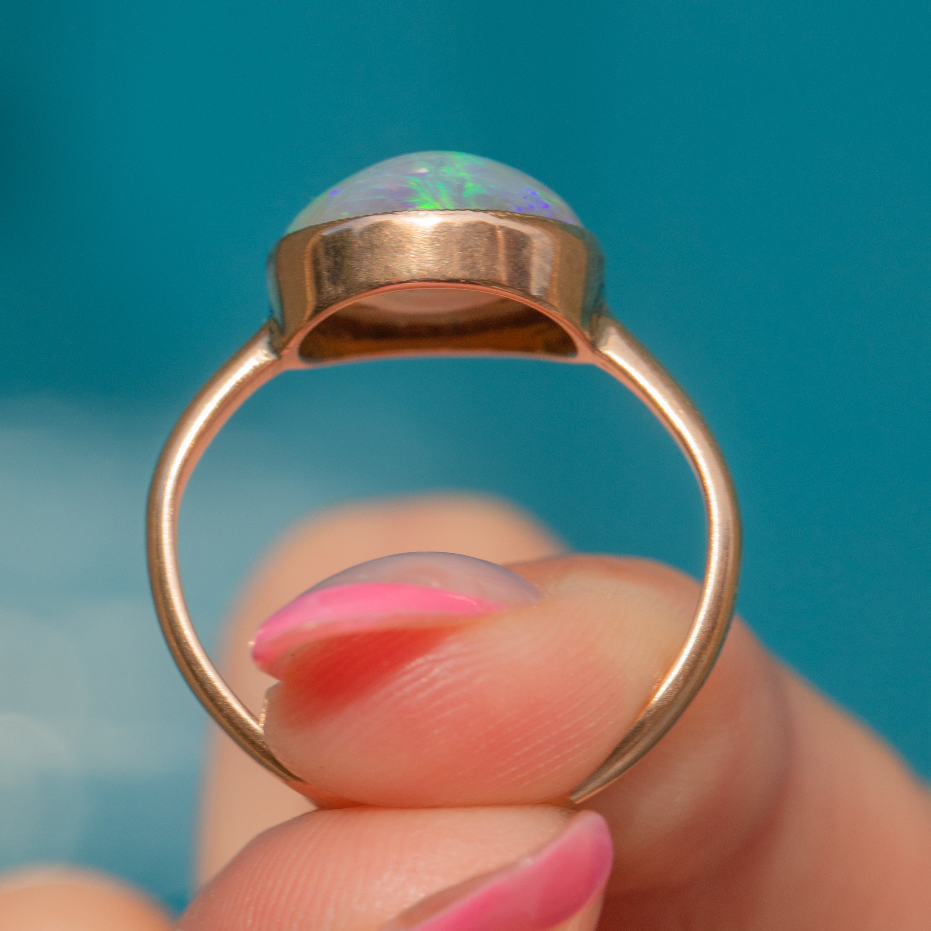 Flaunting a plump 3.10ct Black Opal cabochon, this ring radiates a kaleidoscope of sage greens and lilac hues. She is set within a rosy 9ct Gold bezel, the buttery 9ct Gold effortlessly complementing the cool tones of her stunning natural Black Opal.