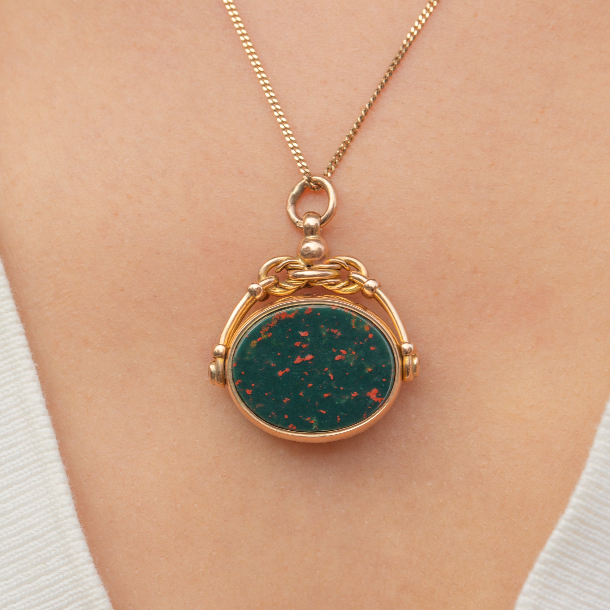 This Edwardian spinning fob pendant is crafted in 9ct Gold and set with two classic hardstones: a deep green Bloodstone flecked with vivid red, and a rich orange-red Carnelian. Each side is flat-polished, offering a smooth surface that captures the light with subtle lustre.