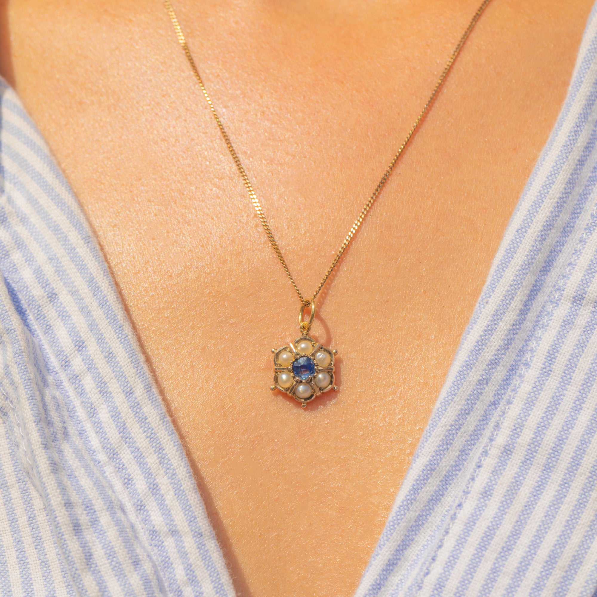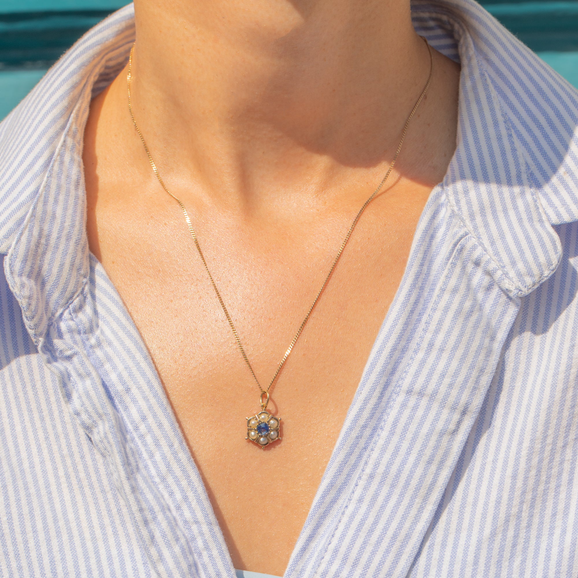 This dainty floral charm is centred by a vibrant Sapphire, encircled by lustrous Pearls which form its petals. Each gemstone is centred by glossy 9ct Gold, the warmth marrying the gemstones together effortlessly.