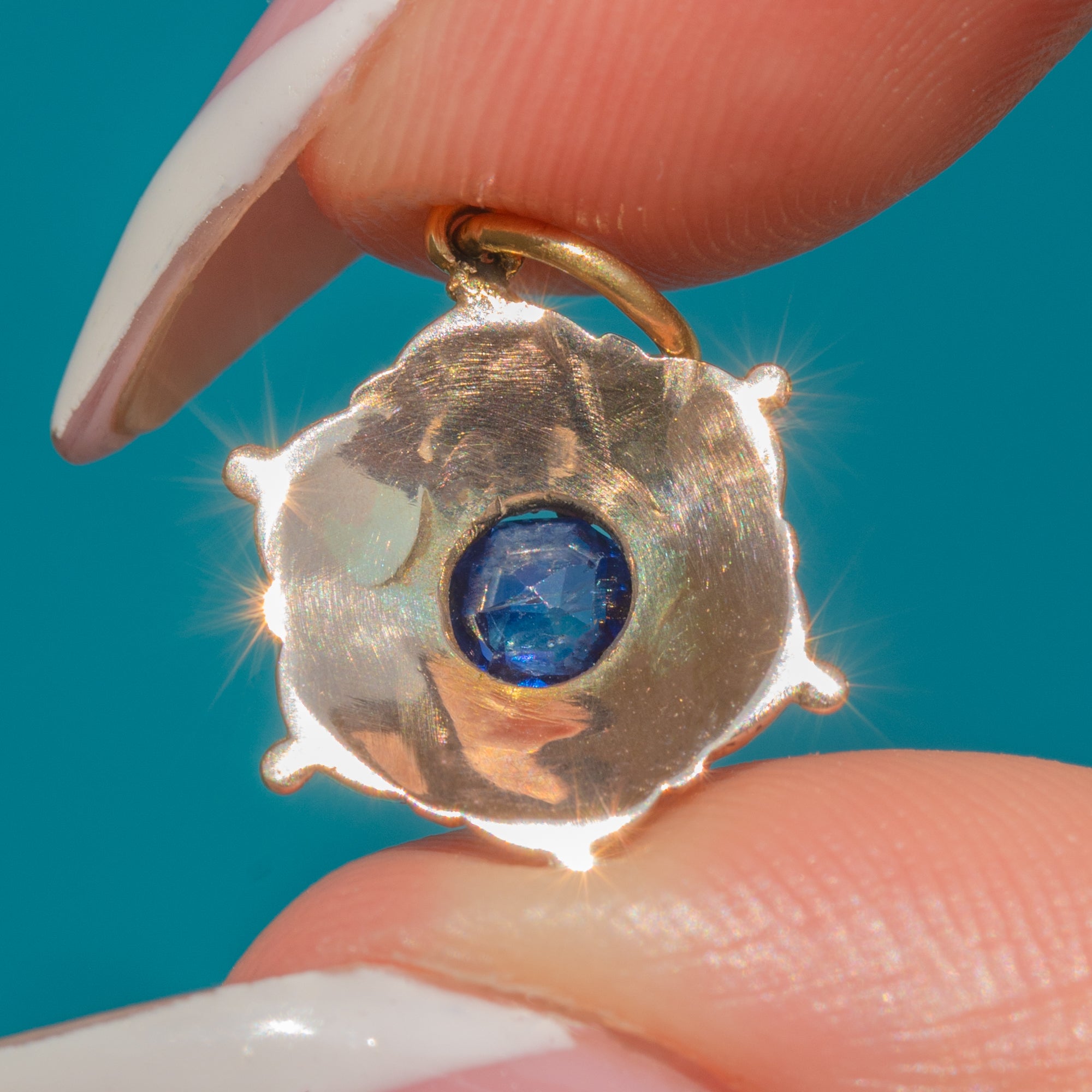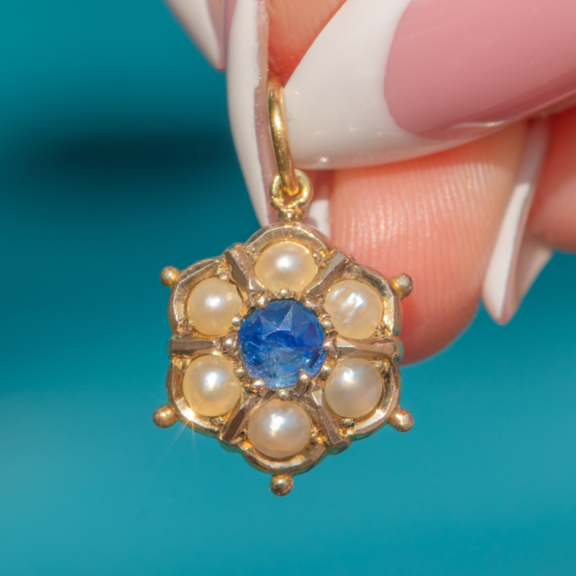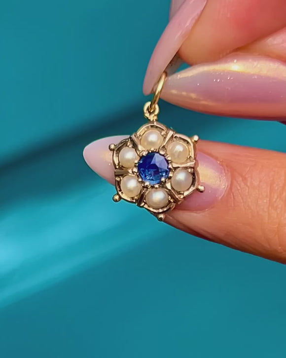 Antique 9ct Gold Blue Sapphire Pearl Flower Charm