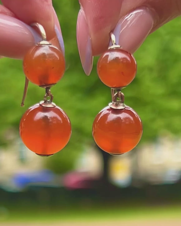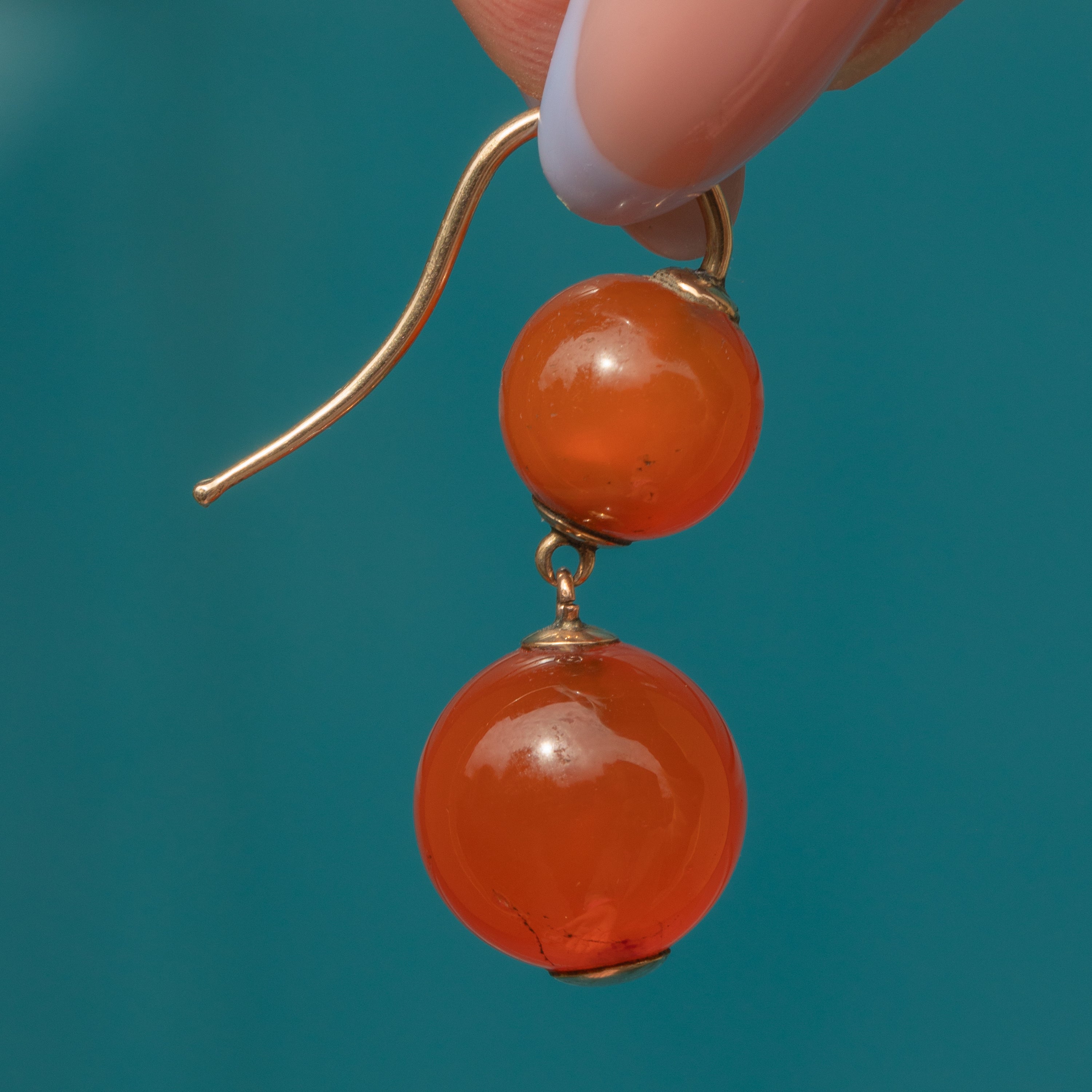 VERY GOOD-EXCELLENT: These antique 9ct Gold Carnelian drop earrings are in fantastic condition. The Carnelian beads are smooth and secure, with only mild wear commensurate with age. The Gold is radiant and the hooks are robust, promising years f wear and enjoyment!