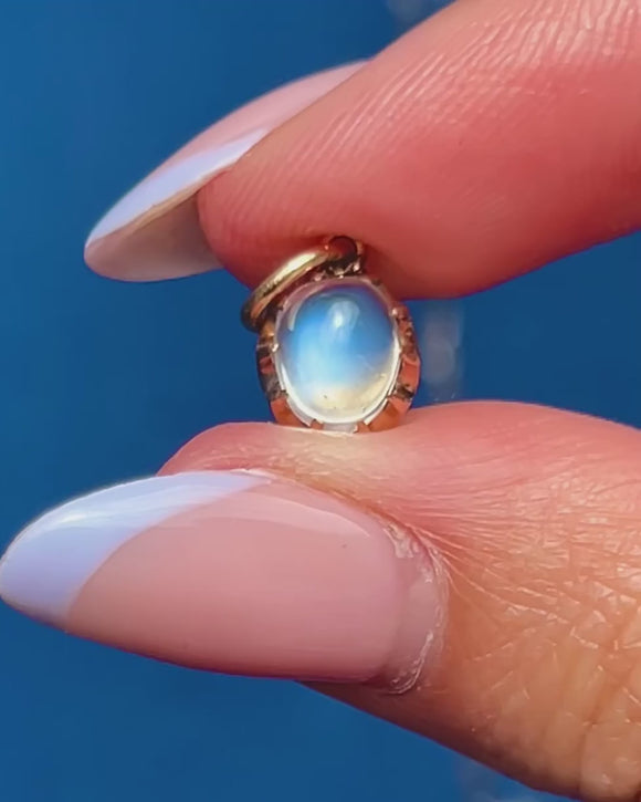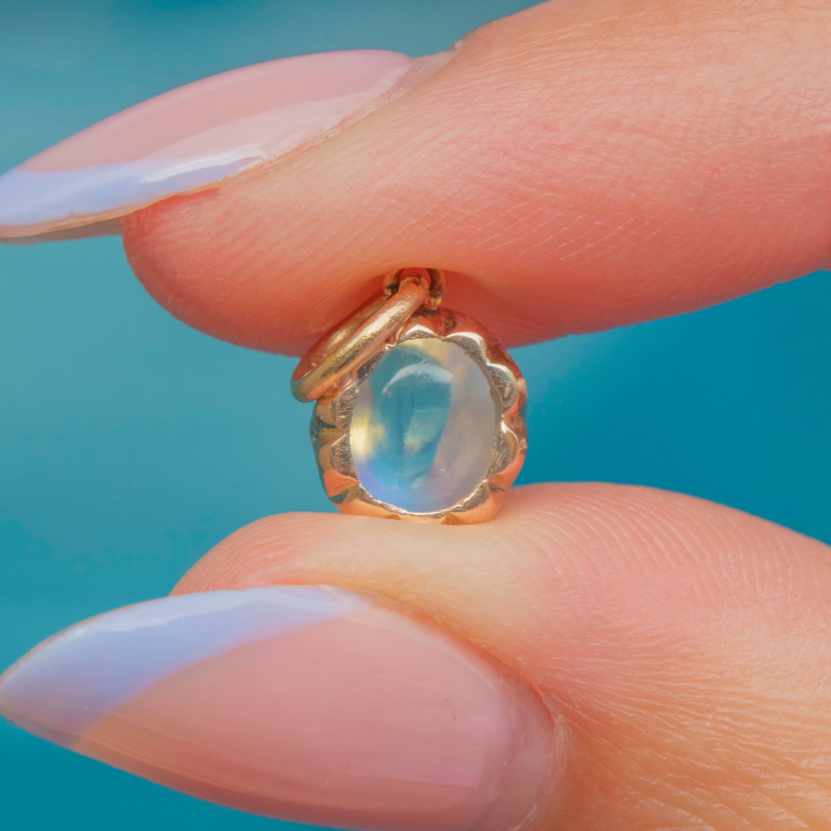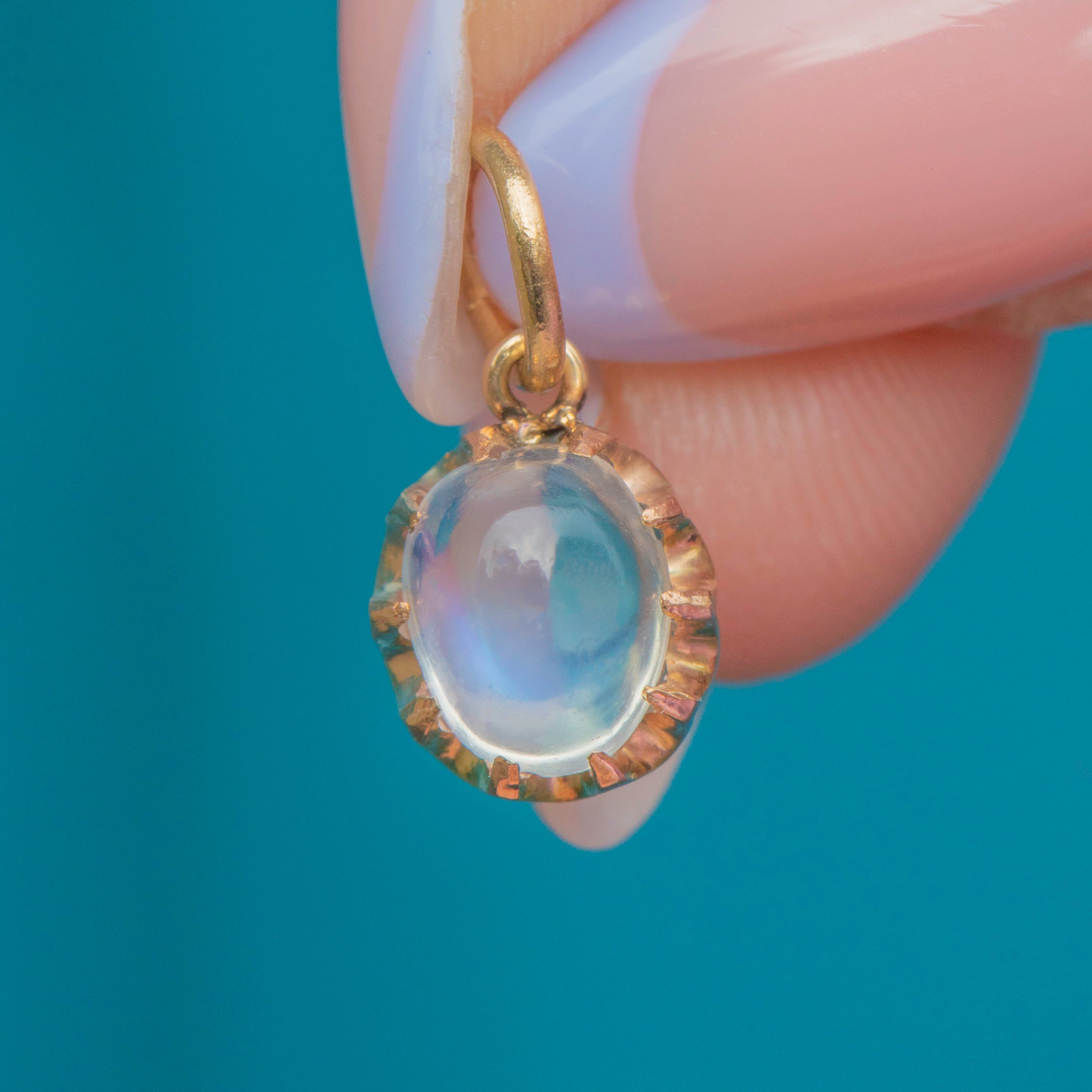 VERY GOOD: This Victorian 9ct Gold Ceylon Moonstone charm is in very good condition. The Moonstone is radiant and set securely within her claw settings. There are some small nibbles to the Moonstone, though this is commensurate with age and only visible under close inspection. With a securely soldered jump ring, you can wear this antique charm with utmost confidence!