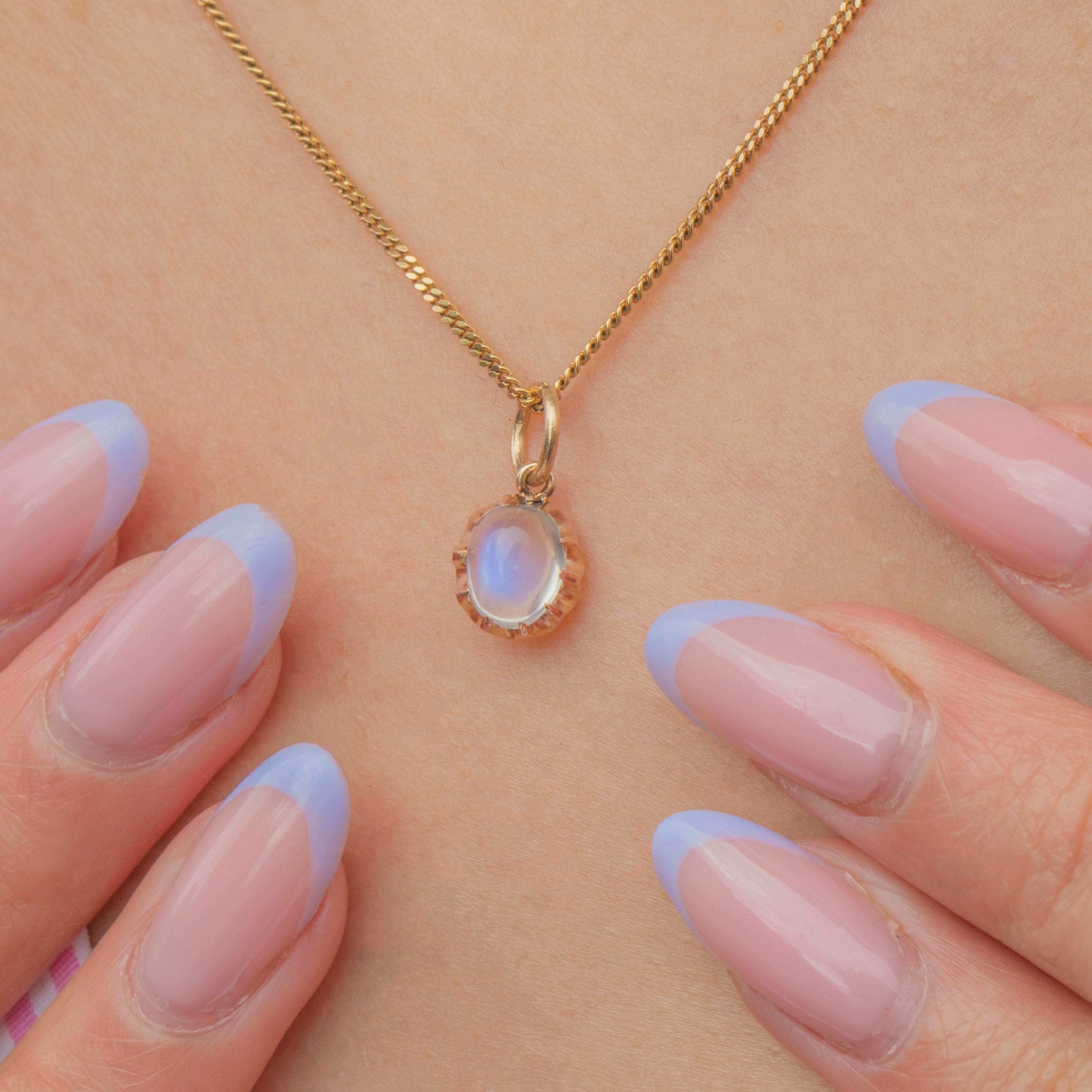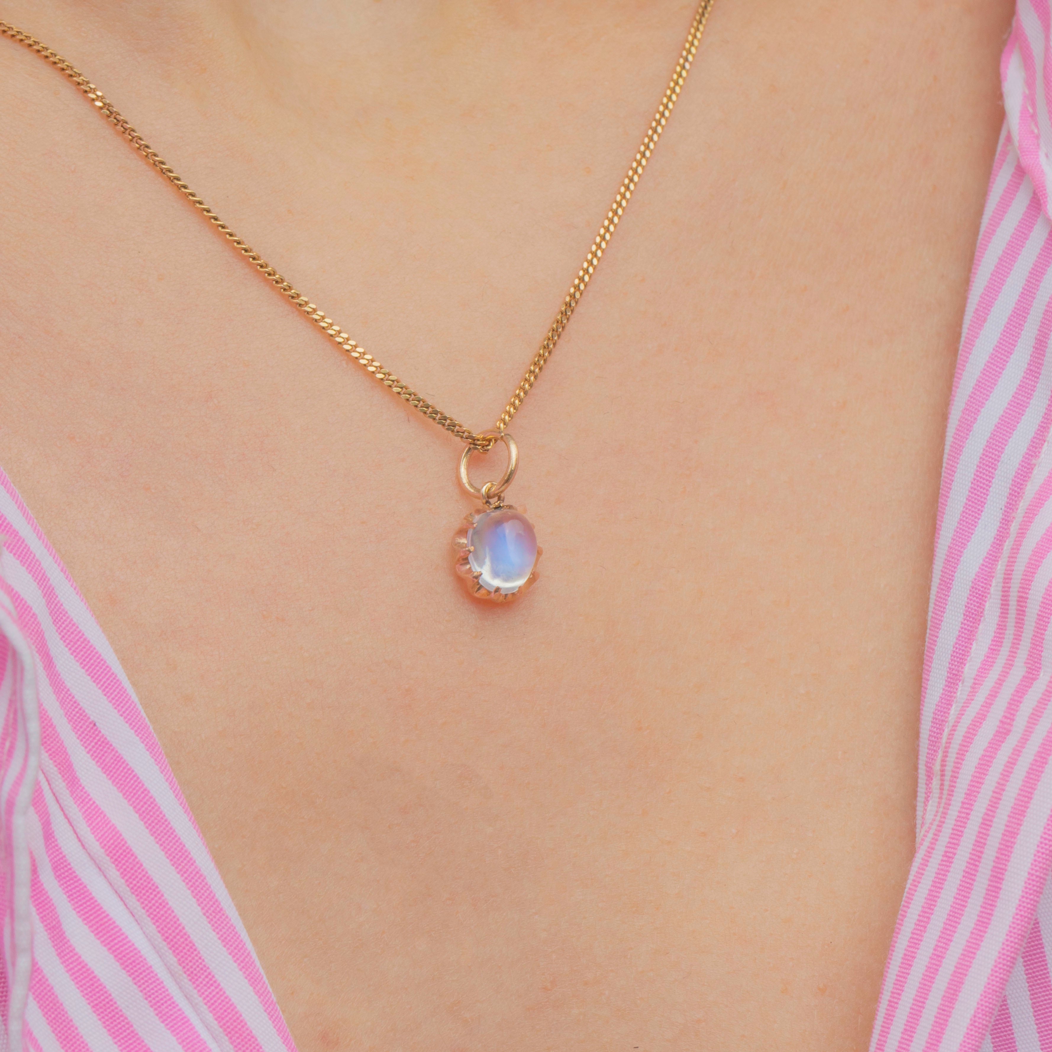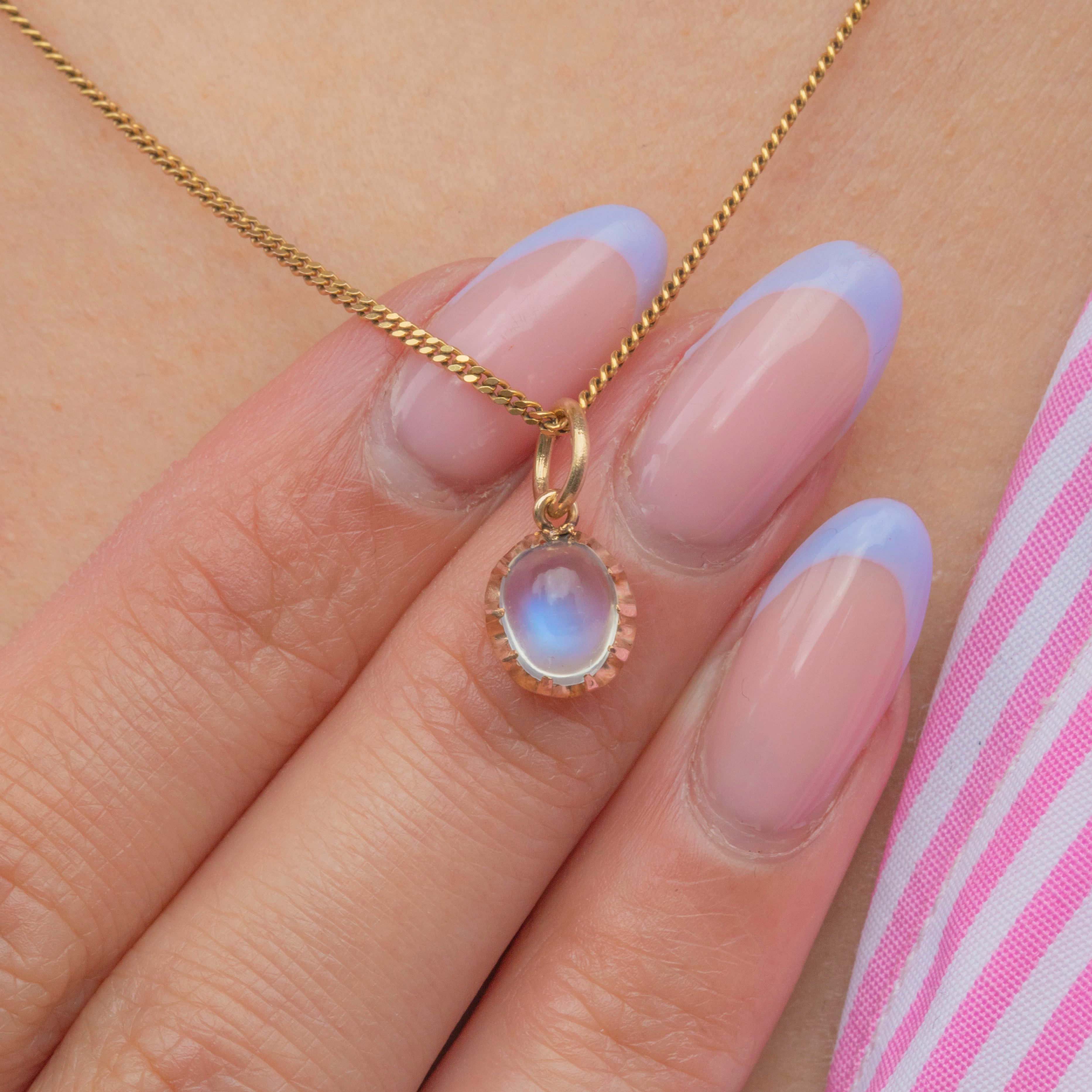 VERY GOOD: This Victorian 9ct Gold Ceylon Moonstone charm is in very good condition. The Moonstone is radiant and set securely within her claw settings. There are some small nibbles to the Moonstone, though this is commensurate with age and only visible under close inspection. With a securely soldered jump ring, you can wear this antique charm with utmost confidence!