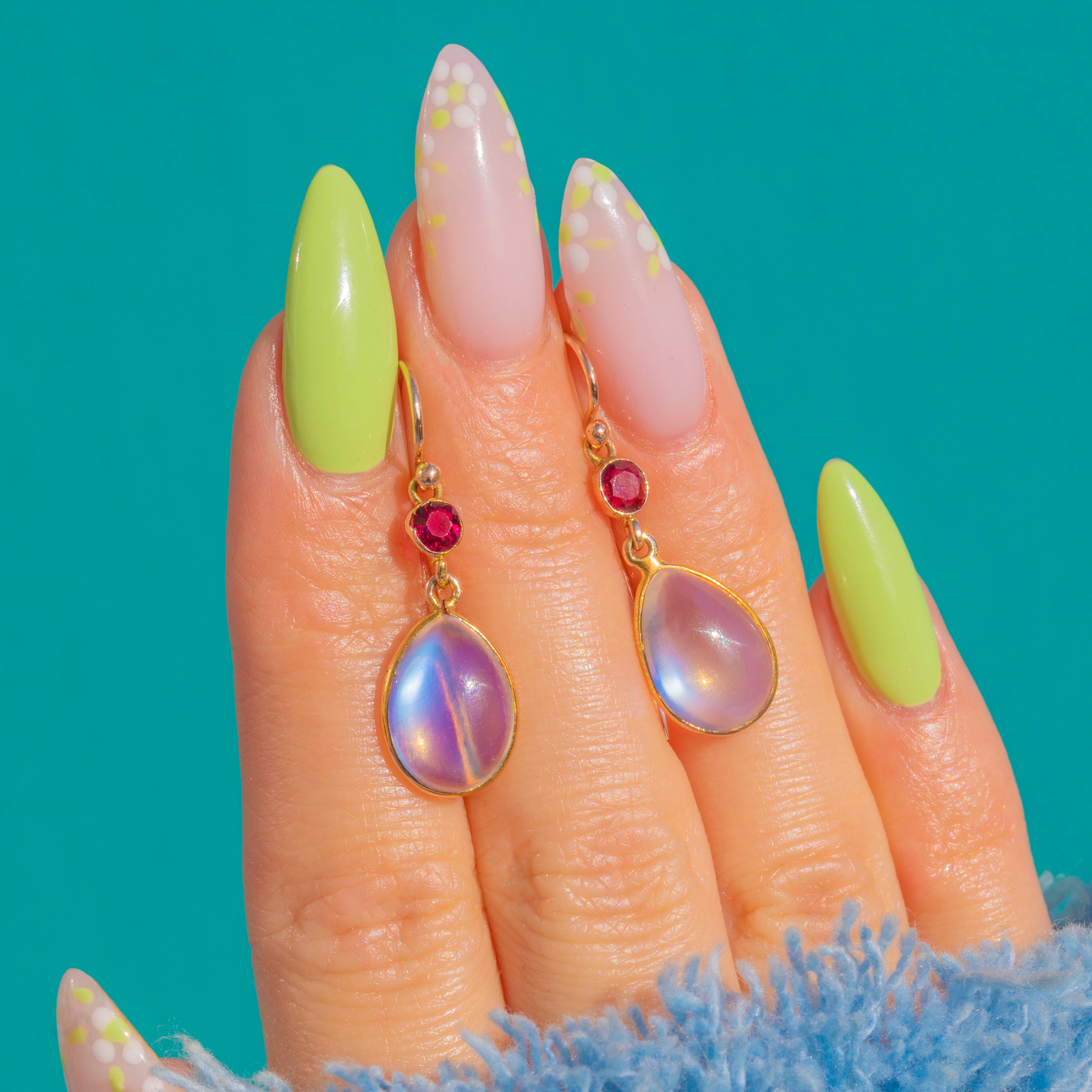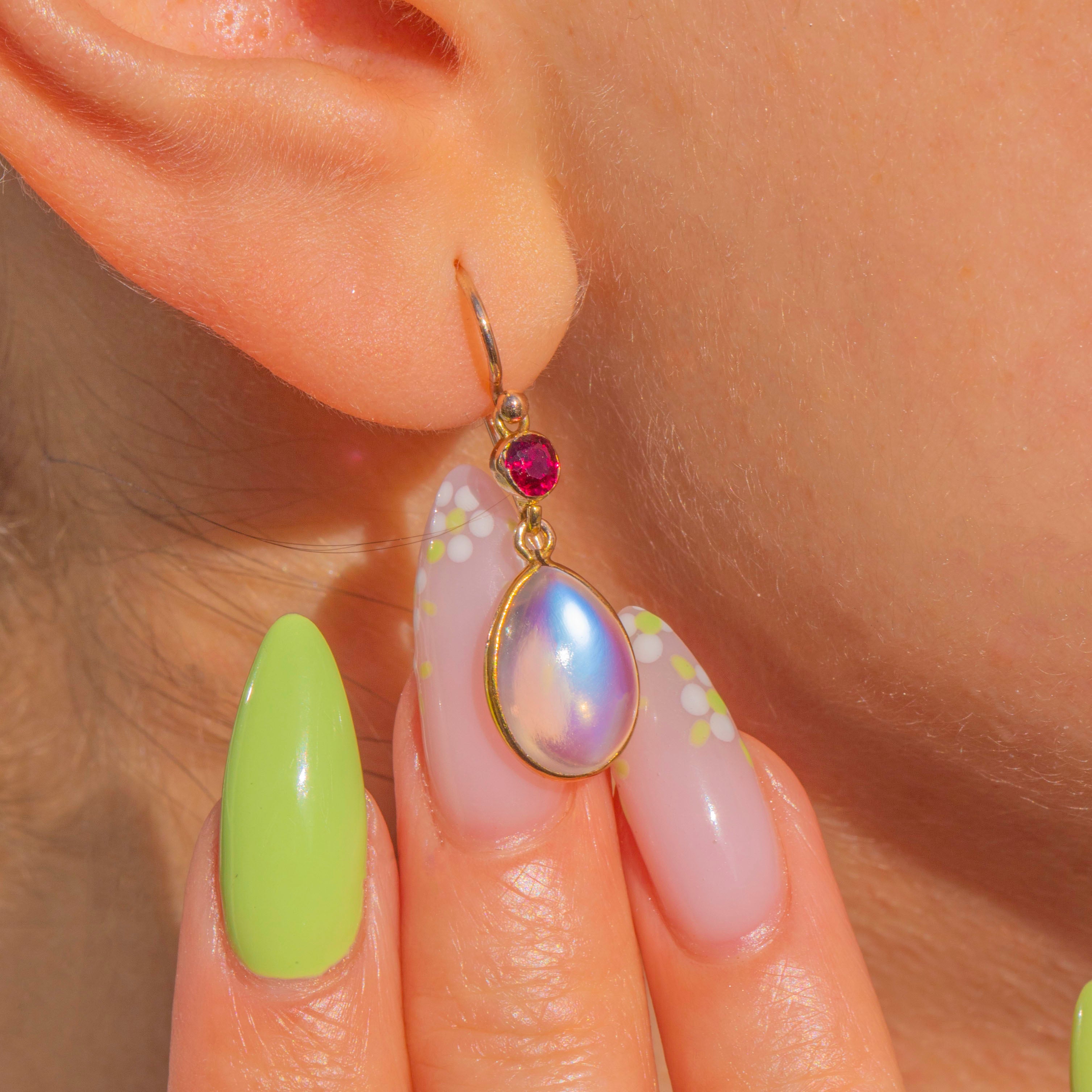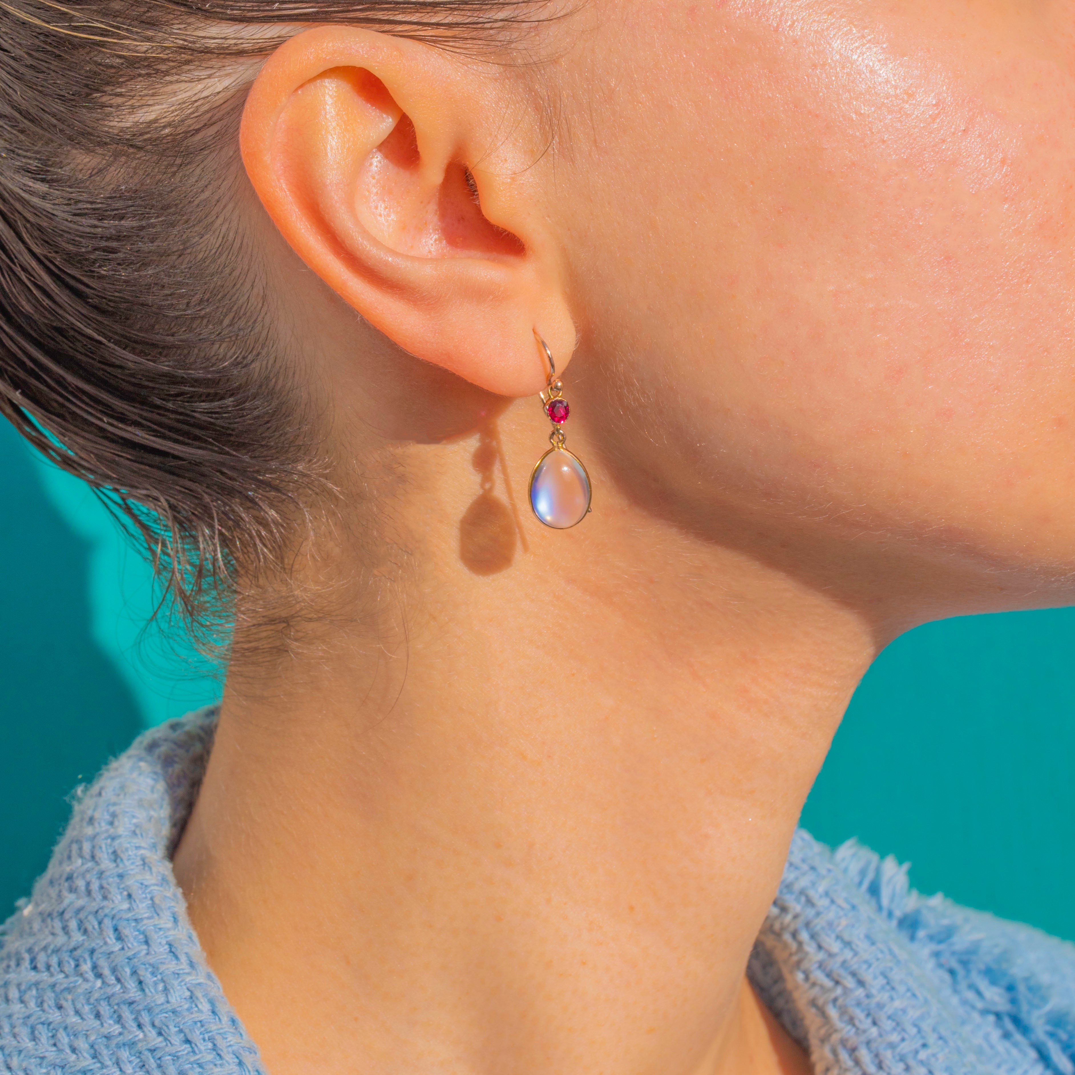 Elegant and romantic, these Edwardian drop earrings marry luminous Moonstone with vivid Rubies in glowing 9ct Gold. Each articulated drop features a domed pear Moonstone cabochon displaying a soft, ethereal sheen, crowned by a bright faceted round Ruby for a delicious pop of colour. Sleek full bezels and graceful French shepherd hooks complete the refined silhouette, allowing the stones to sway and catch the light with every movement.