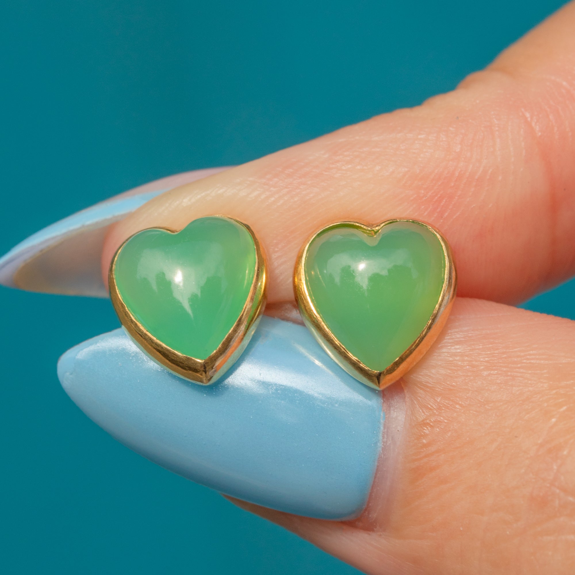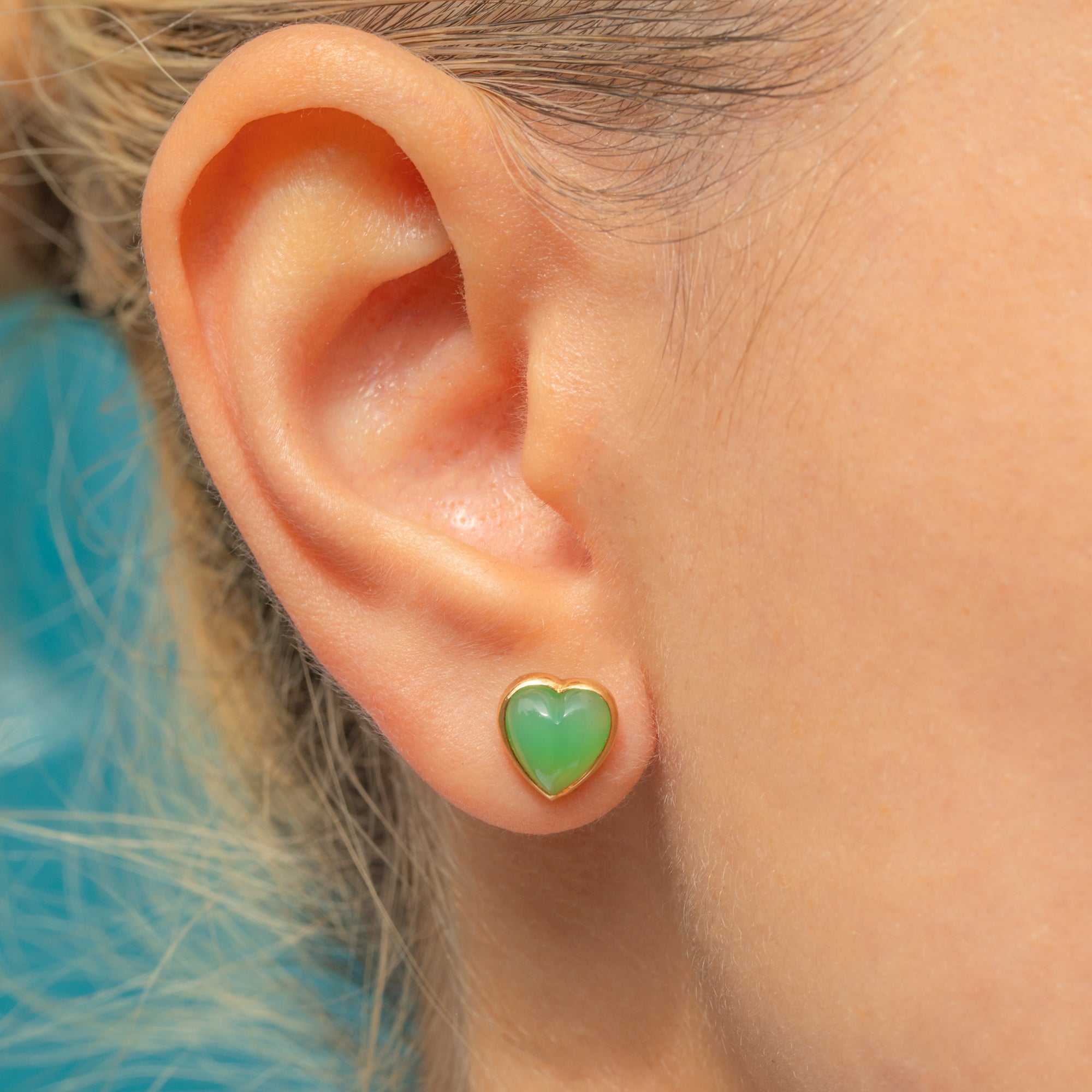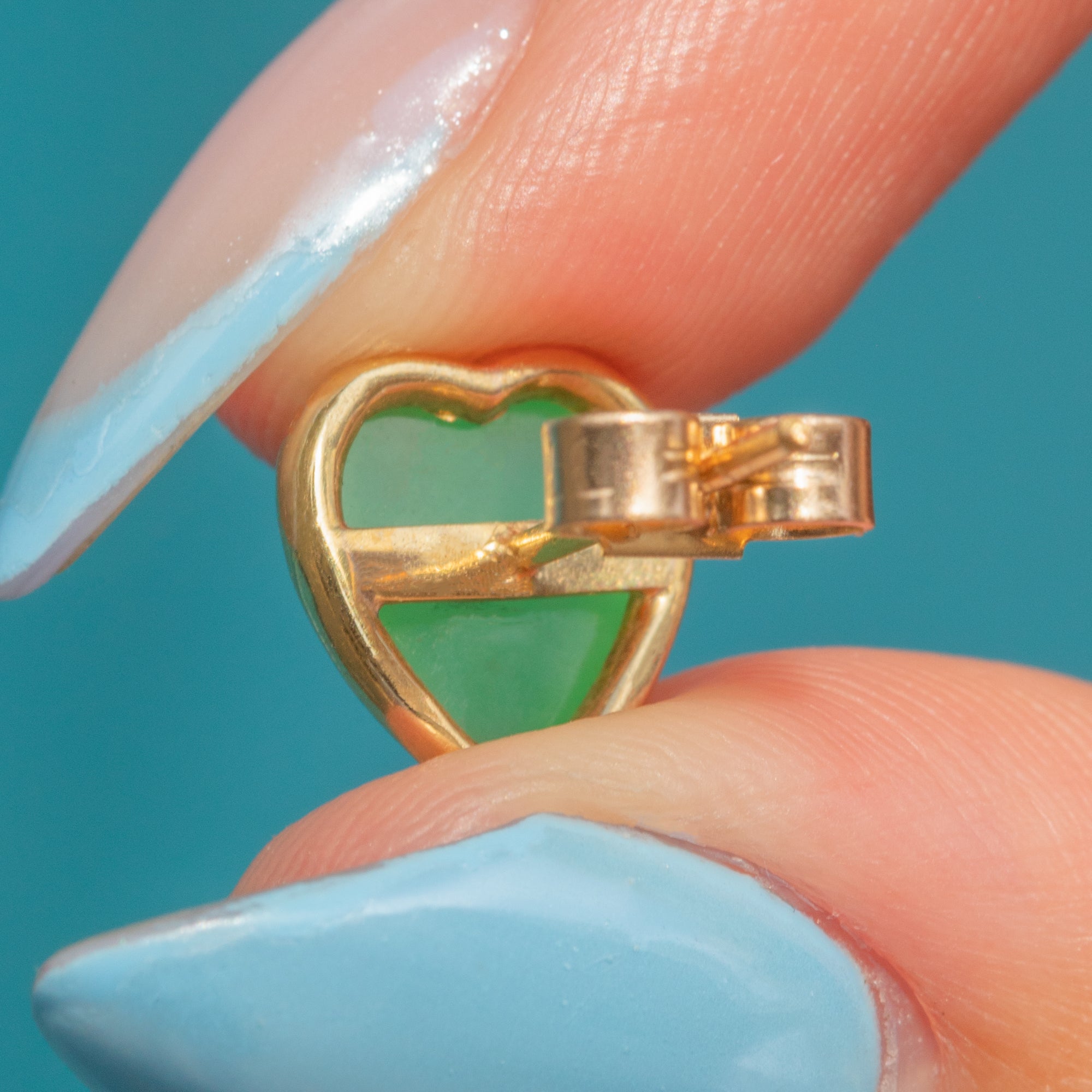Each displaying a soft green Chrysoprase (Chalcedony) cabochon cut into a romantic heart shape, these antique studs are the perfect charming pair for everyday wear.