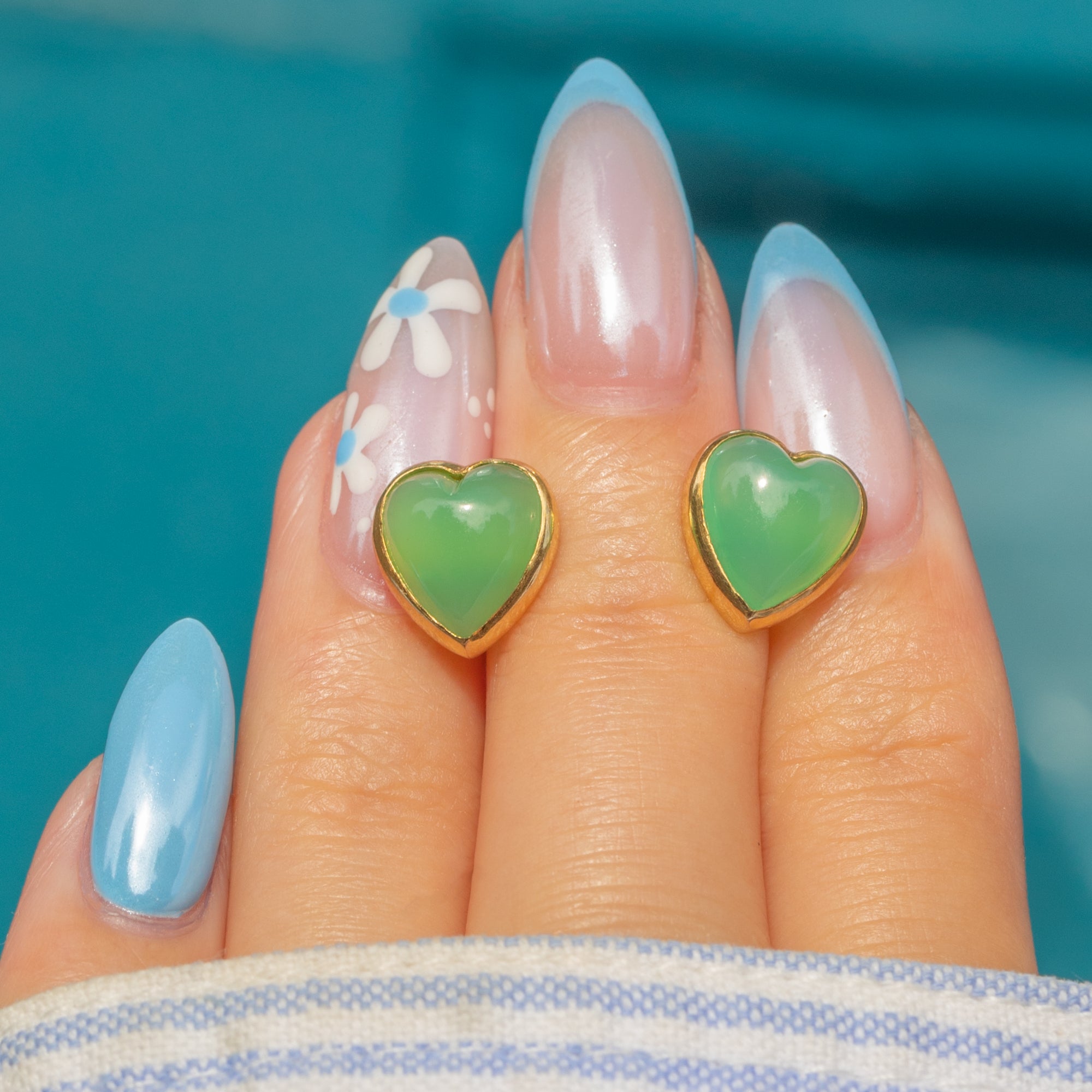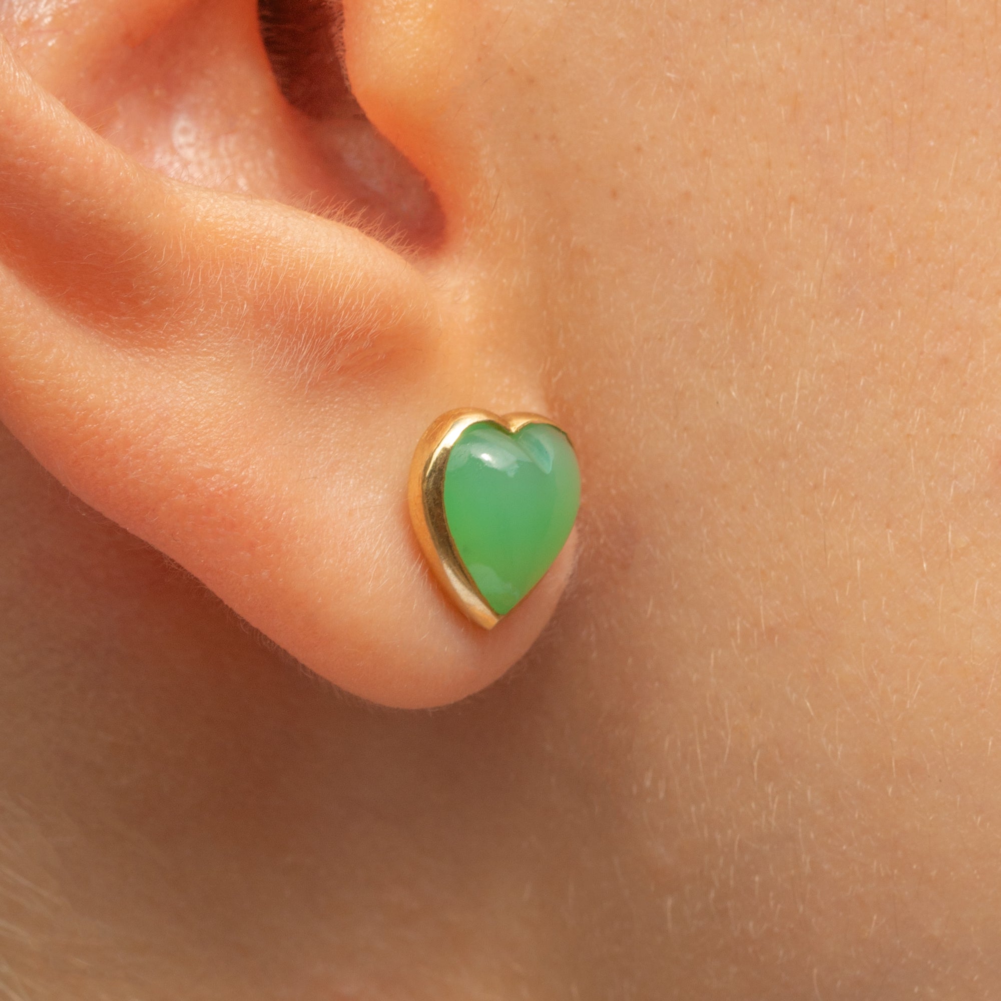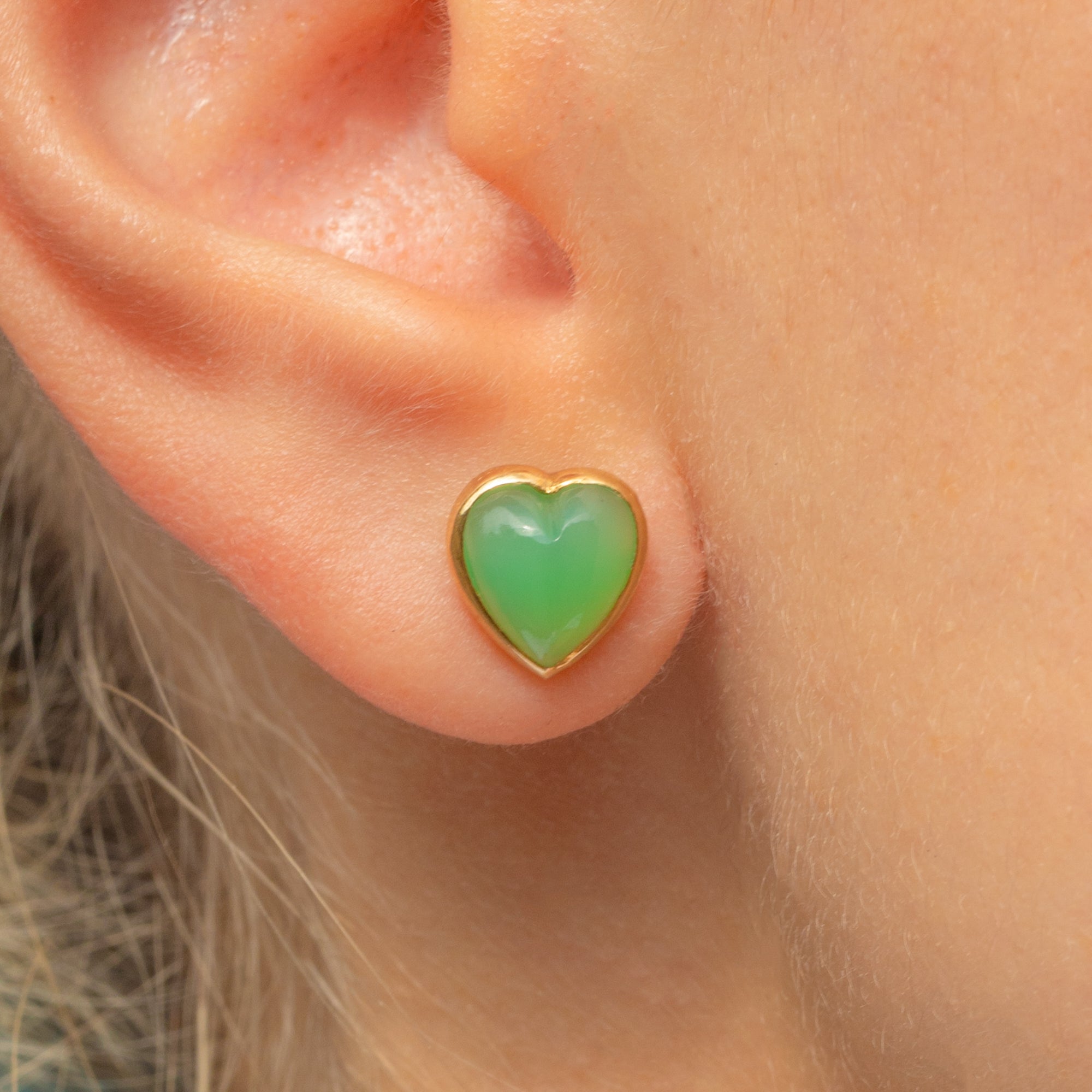 Each displaying a soft green Chrysoprase (Chalcedony) cabochon cut into a romantic heart shape, these antique studs are the perfect charming pair for everyday wear.