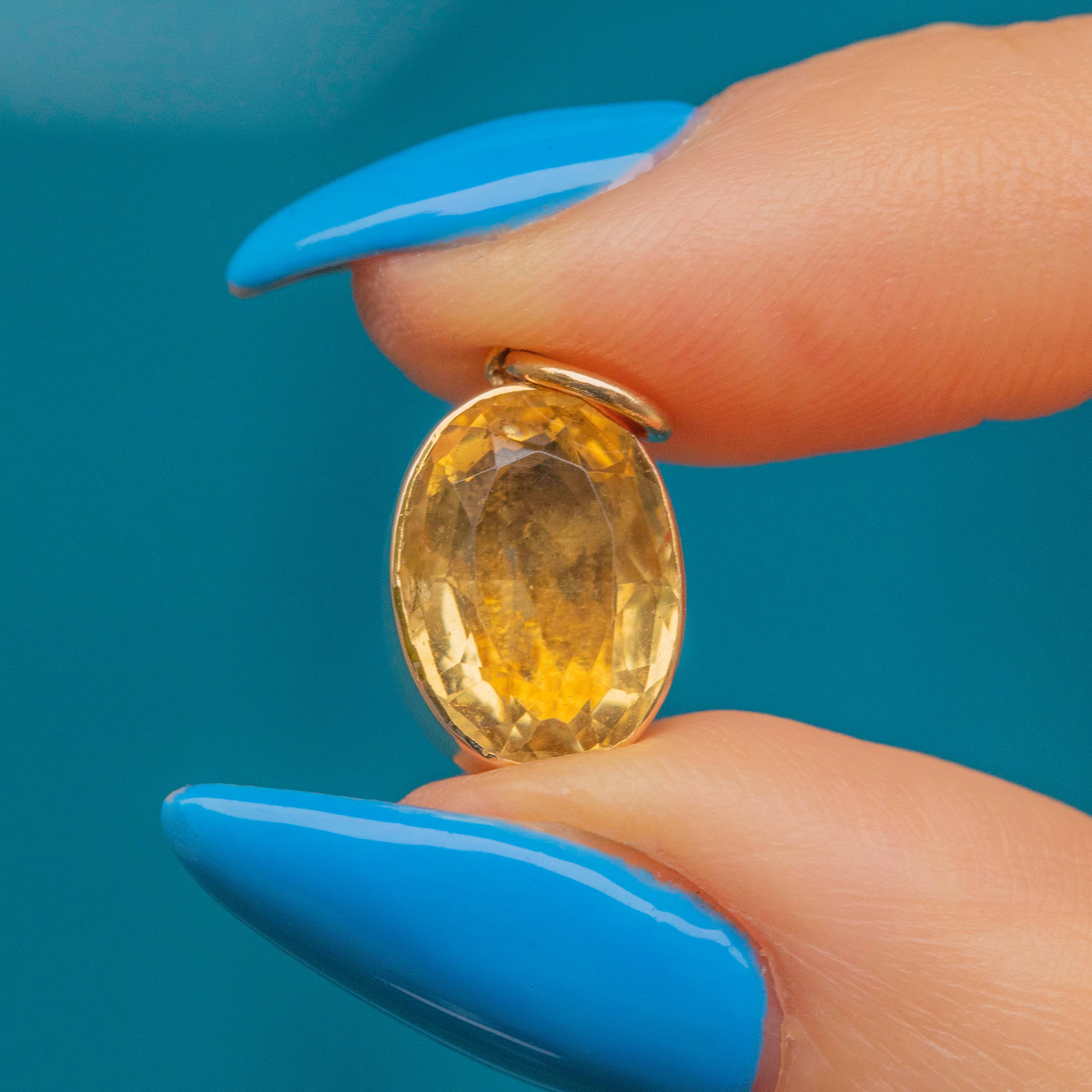 Embraced by a closed-back sun-kissed 9ct Gold bezel setting, this Victorian pendant will sit comfortably against your décolletage whilst radiating warmth. You will brighten up any room you enter with this antique Citrine charm adorning your neck!