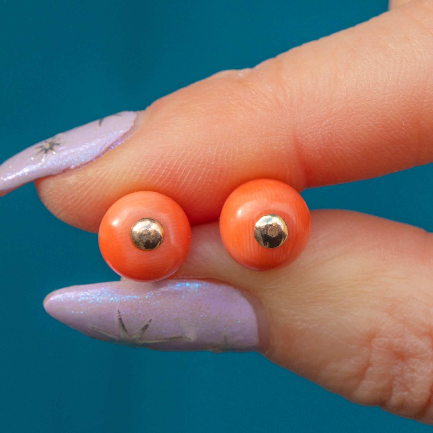 EXCELLENT. A stunning pair of antique 9ct Gold Coral stud earrings! In excellent condition, these earrings wear securely with butterfly backs and have smooth Coral gemstones that have lasted incredibly well through time.