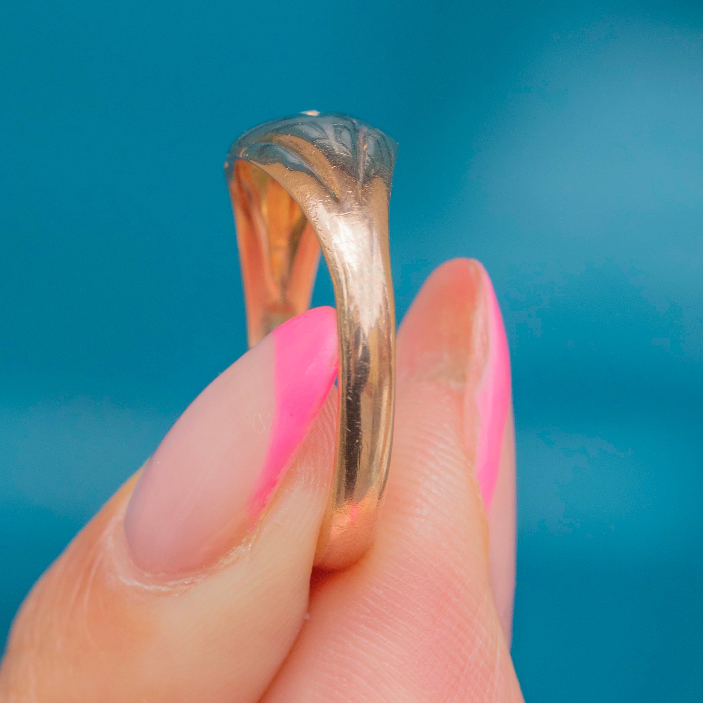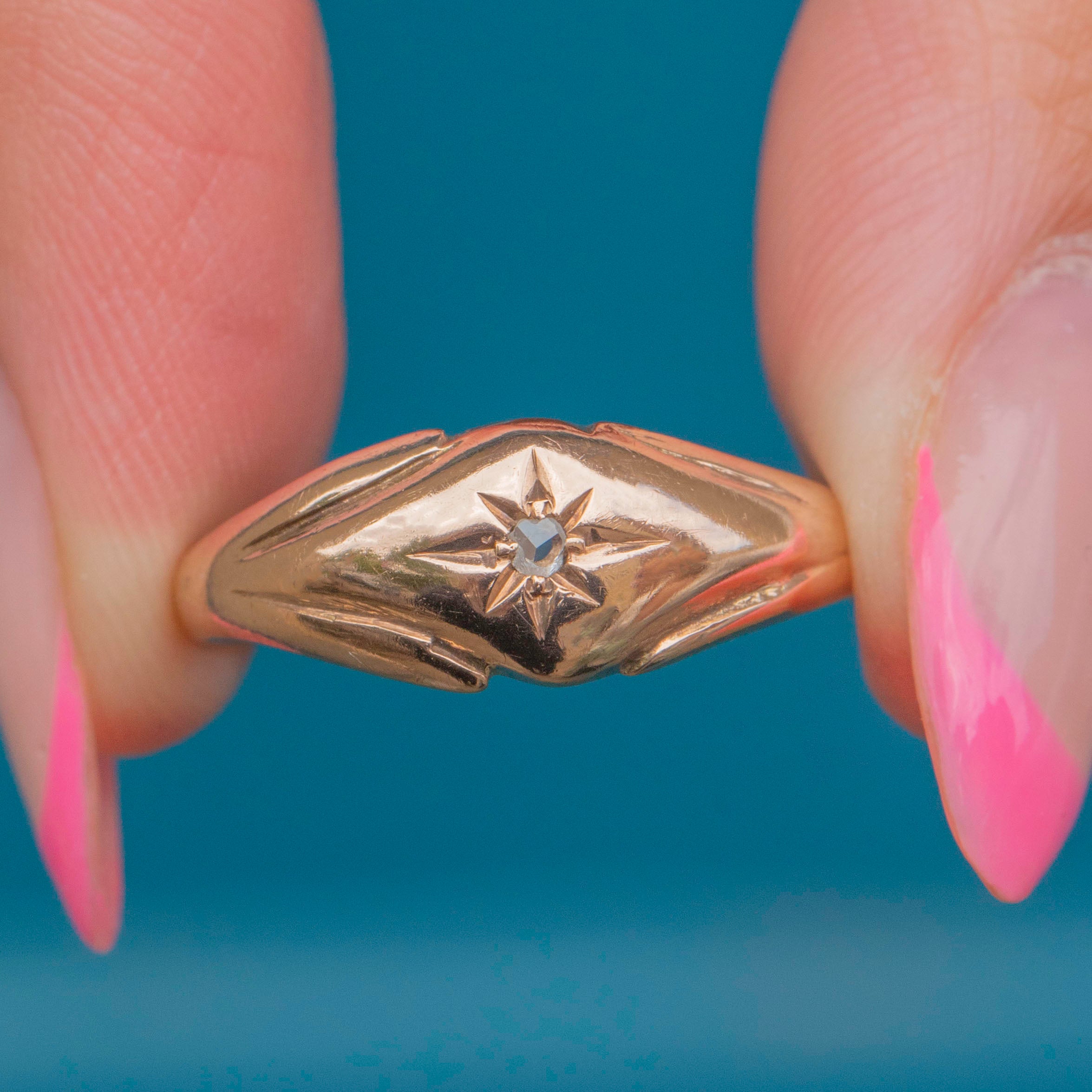 VERY GOOD: This 9ct Gold Diamond star set gypsy ring is in very good condition. She is an exemplar of antique craftsmanship and has retained a wonderful glossy sheen. There are some signs of surface wear to the Gold, including light scratches as well as evidence of a previous resize, though this is difficult to spot without a loupe. The band is not perfectly round, however, this does not affect the wearability of the ring. Her Diamond is securely set meaning you can wear this antique gypsy ring with confidence.