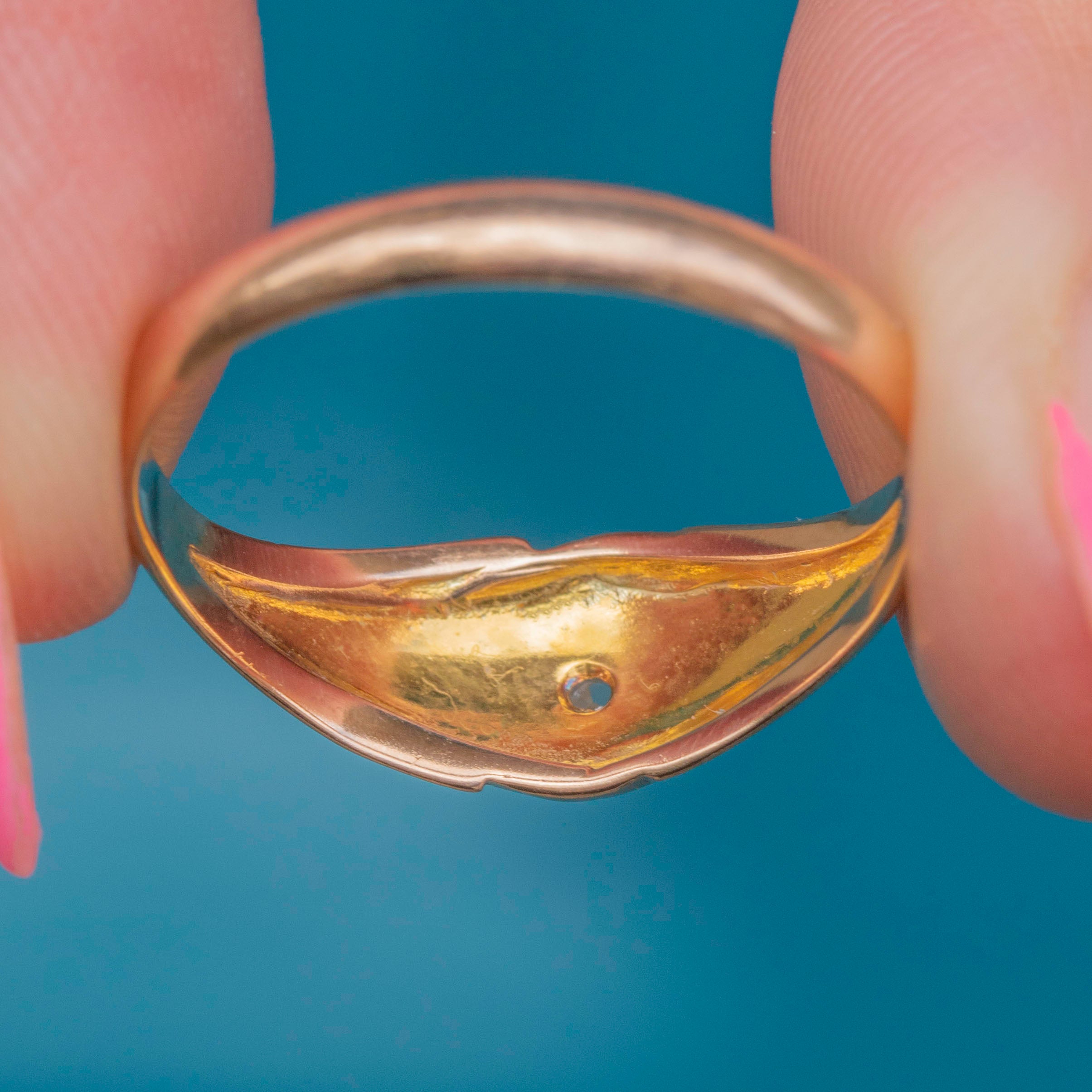 Crafted from rosy 9ct Gold and adorned by a central scintillating rose-cut Diamond, this antique ring dazzles from every angle! Gypsy rings are a fabulous option for stacking, and with a smooth form and glossy sheen, this piece is no exception!
