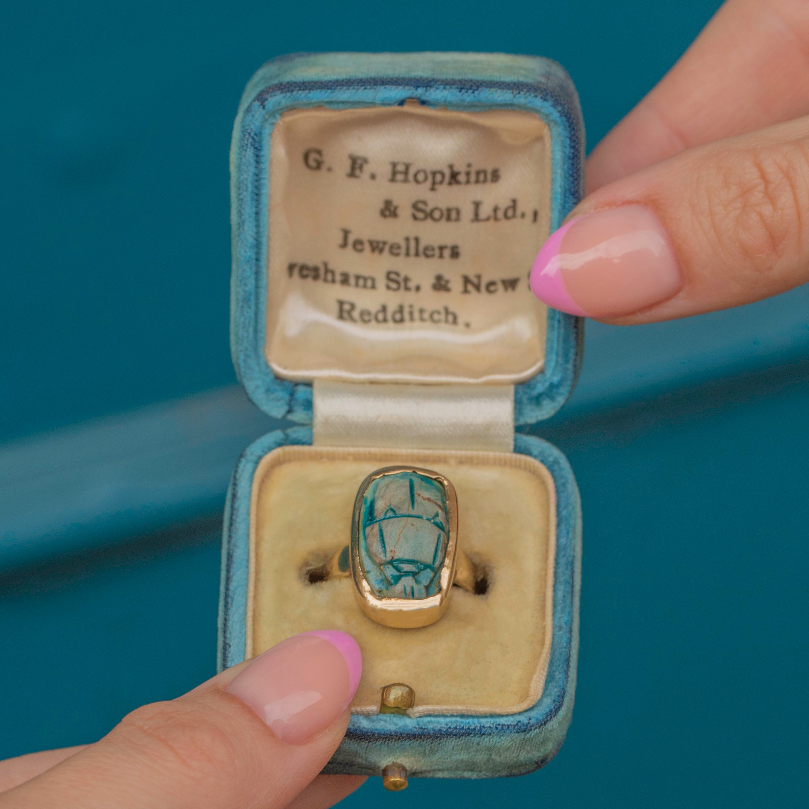 This antique 9ct Gold Egyptian faience scarab ring is a fabulous find! A captivating artefact from the Art Deco era, this Egyptian revival ring reflects the period's fascination with ancient Egyptian motifs.
