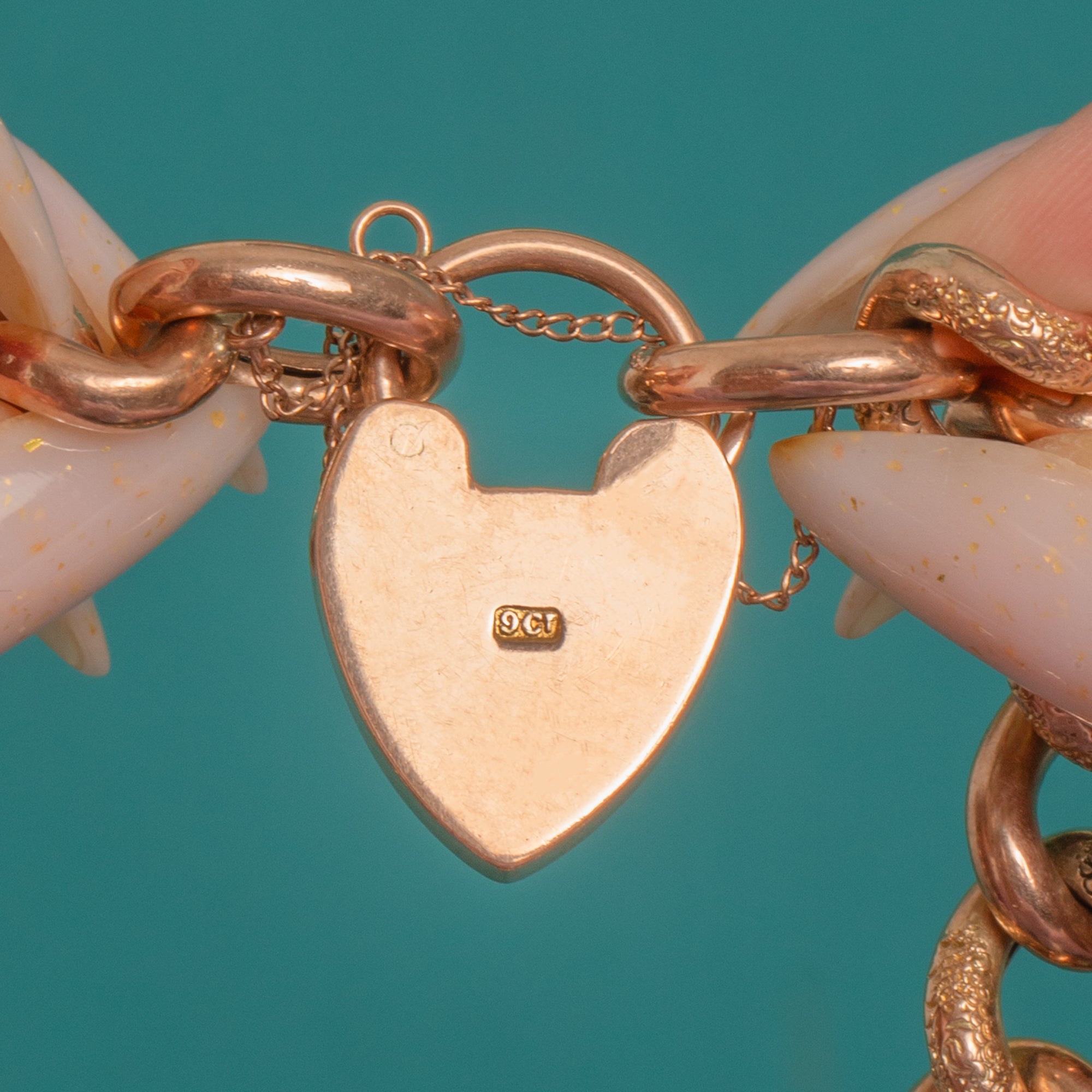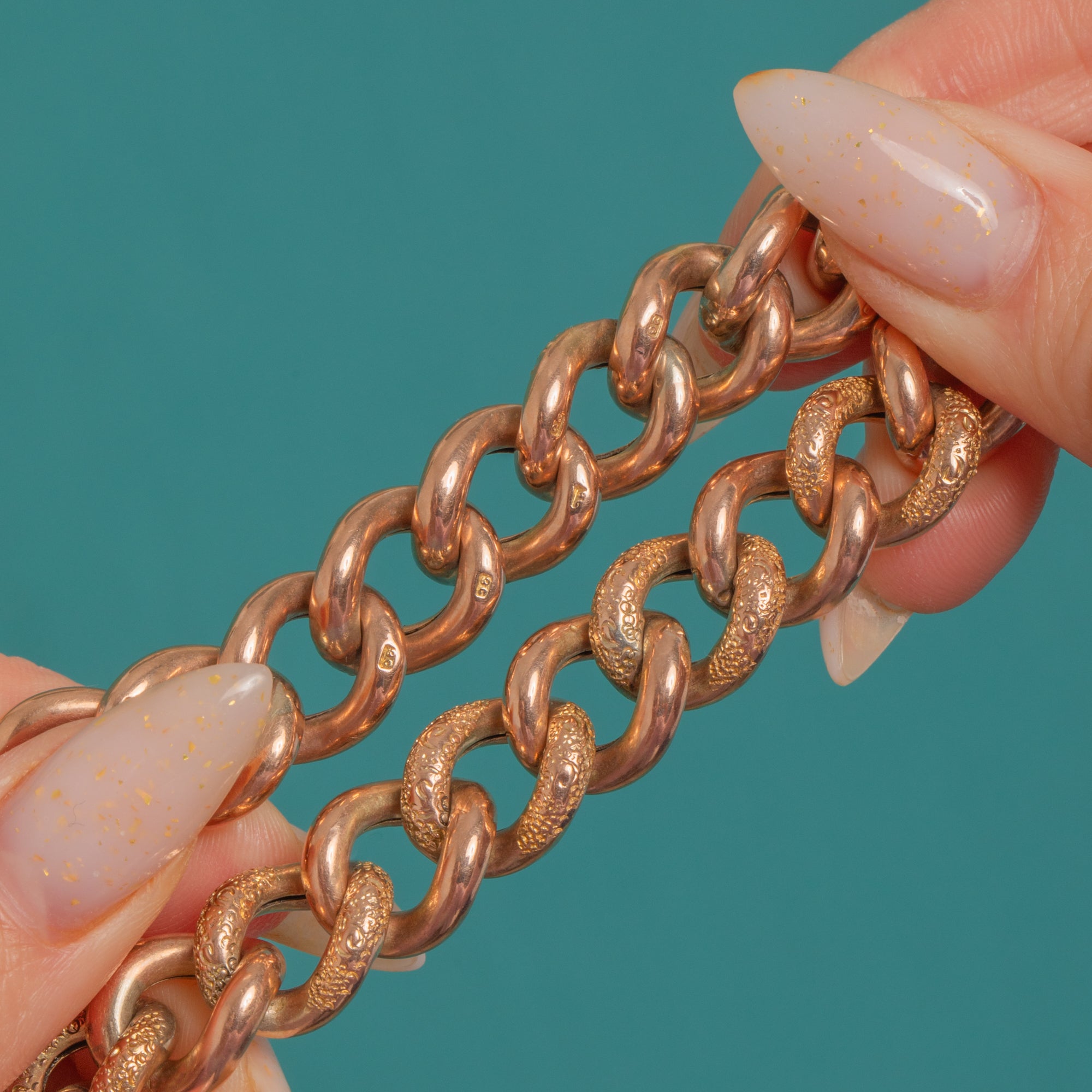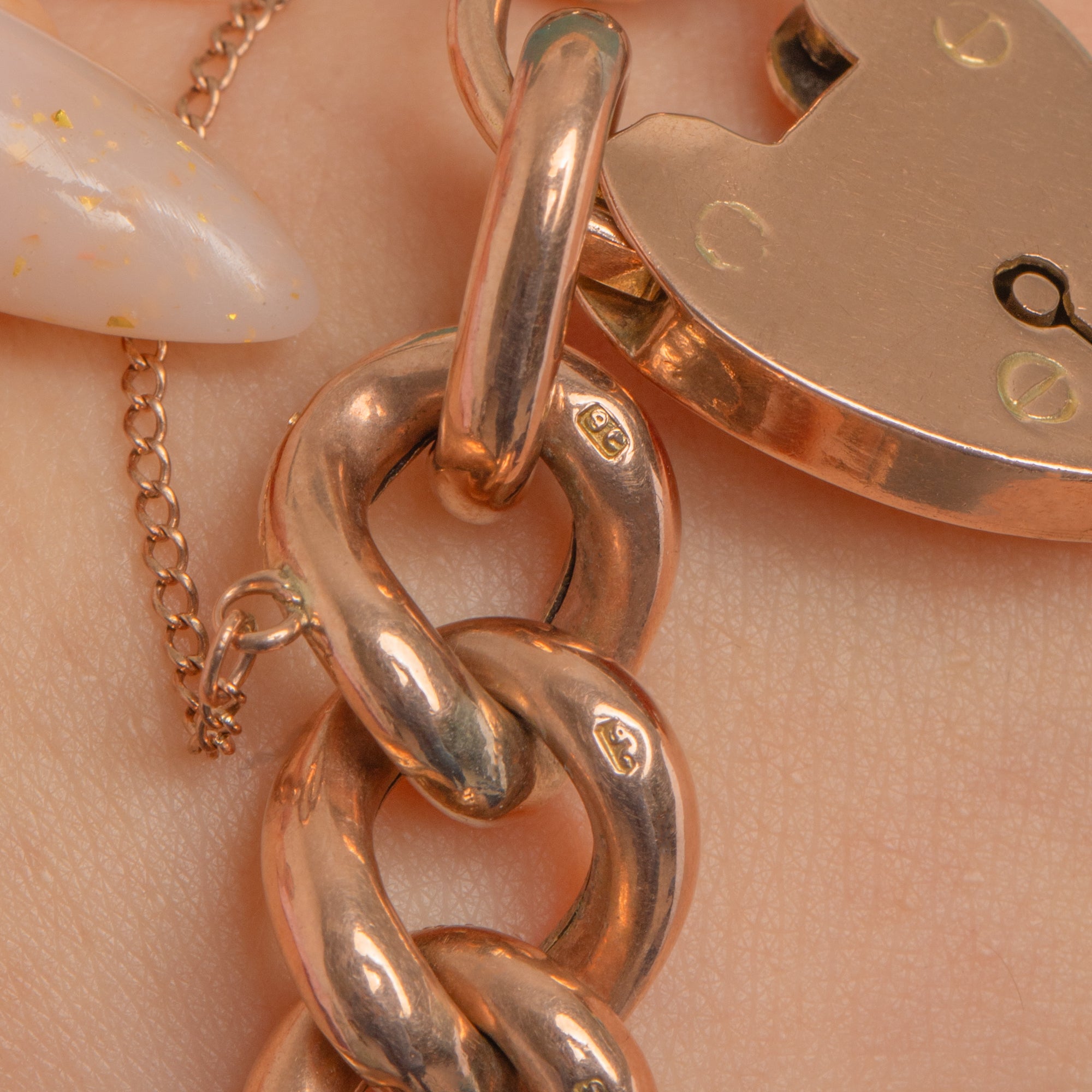 The articulated curb links offer a reversible look—one face sleek and high-polished, the other with a tactile, stippled “nugget” texture that catches the light beautifully. Individually made links flow smoothly around the wrist, and the padlock is stamped 9CT with 9C stamps to the links. A substantial 20.5g, it’s a timeless piece of Victorian sentiment with modern versatility.