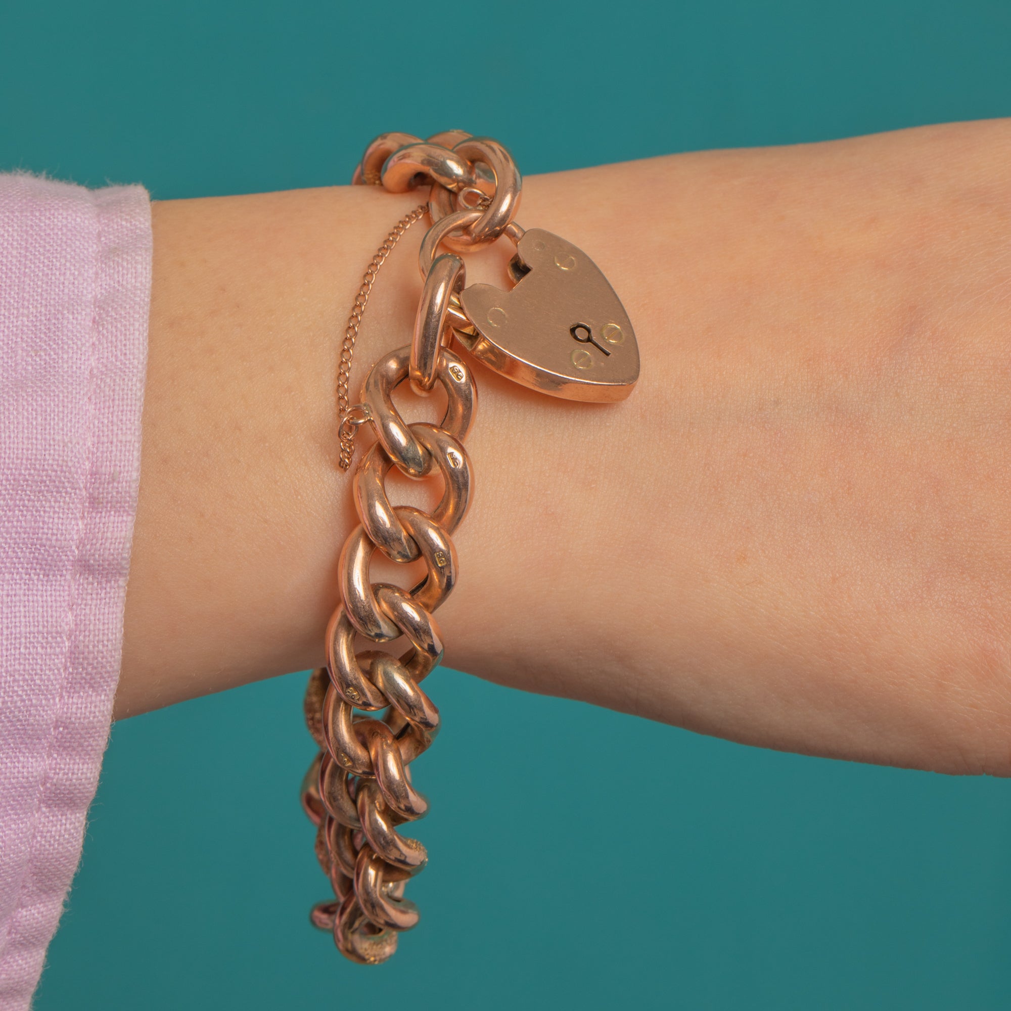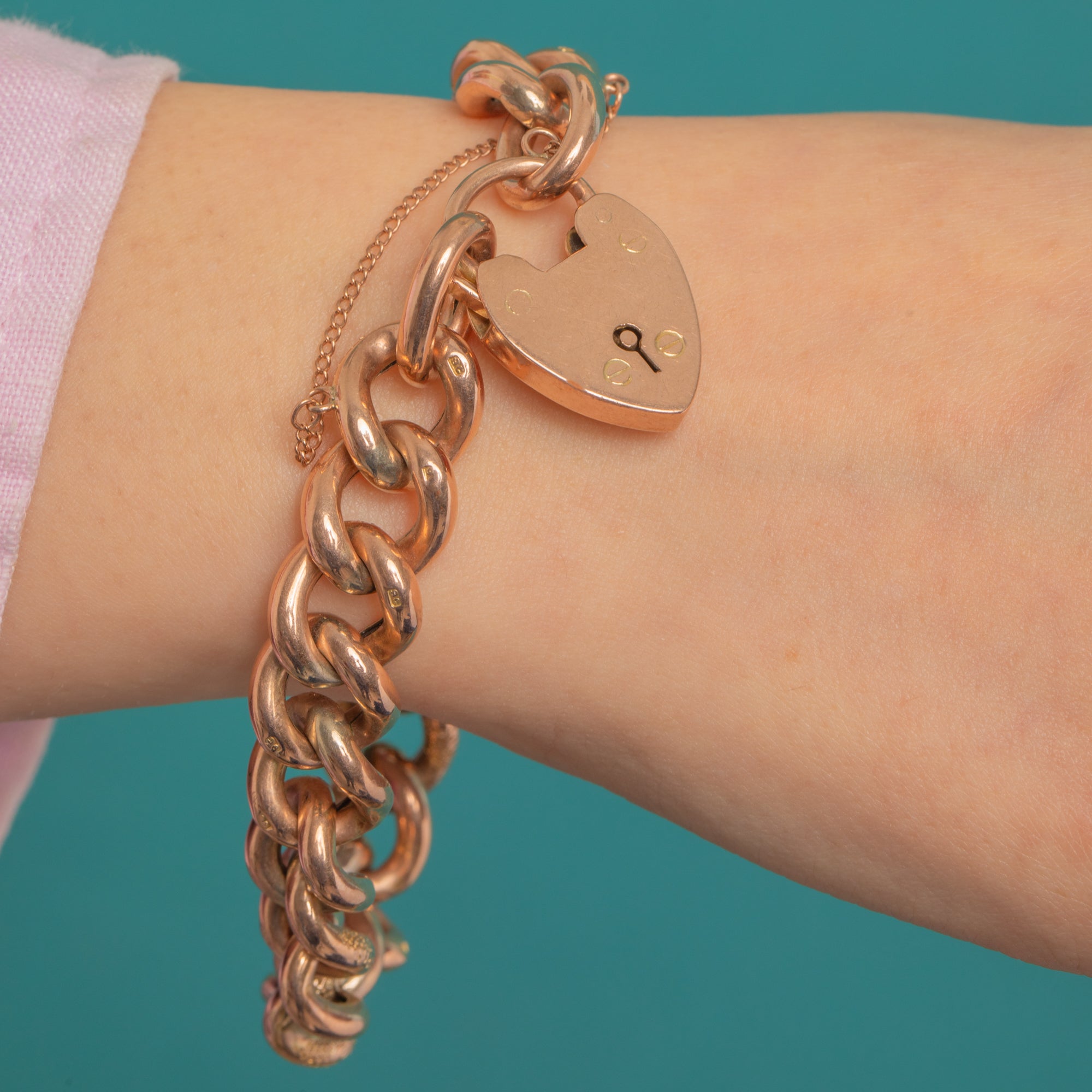 Romance and texture in one beautifully wearable treasure: this Victorian “sweetheart” curb bracelet is crafted in richly rosy 9ct Gold and secures with a heart-shaped padlock clasp and fine safety chain. Its medium–chunky profile and warm glow feel luxurious on the wrist, while the classic silhouette ensures effortless styling day to night.