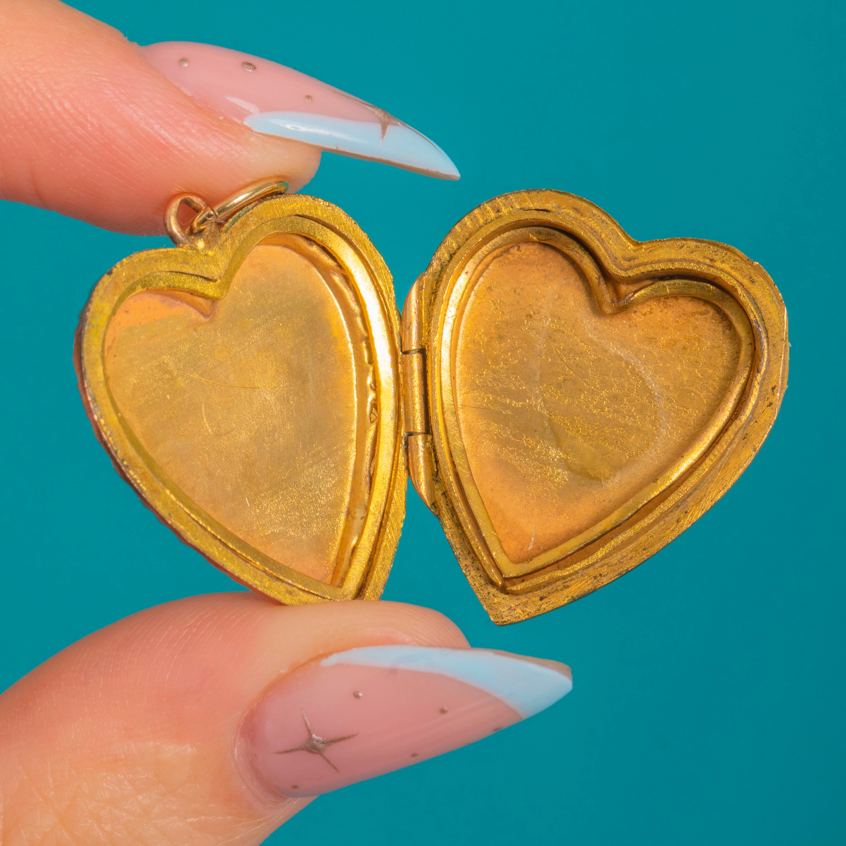 EXCELLENT: The Gold surfaces retain a bright polish with minimal wear, and the design remains crisp. The hinge and closing mechanism are secure; the locket closes tight and stays closed, with interiors clean and complete with two original frames. No notable dents, deep scratches or damage observed.