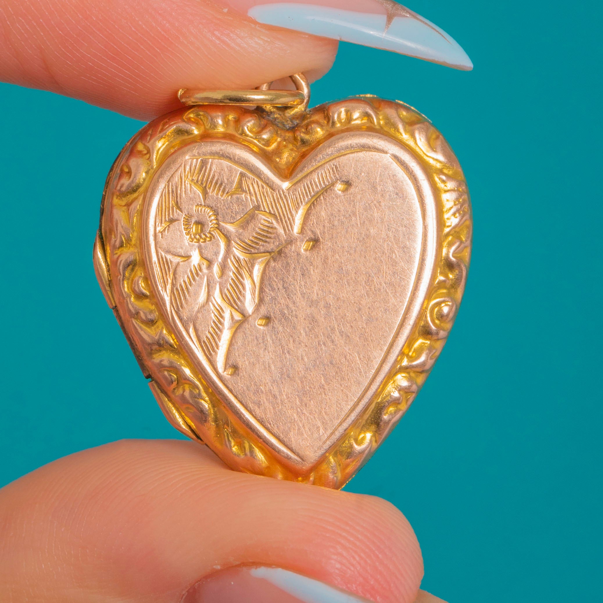 Petite, romantic and beautifully preserved, this Edwardian heart locket is crafted in 9ct Gold back & front with a traditional embossed and engraved design. The raised scrolling border catches the light with a soft glow, while the central heart offers a timeless canvas for personalisation—perfect for adding an initial or two.