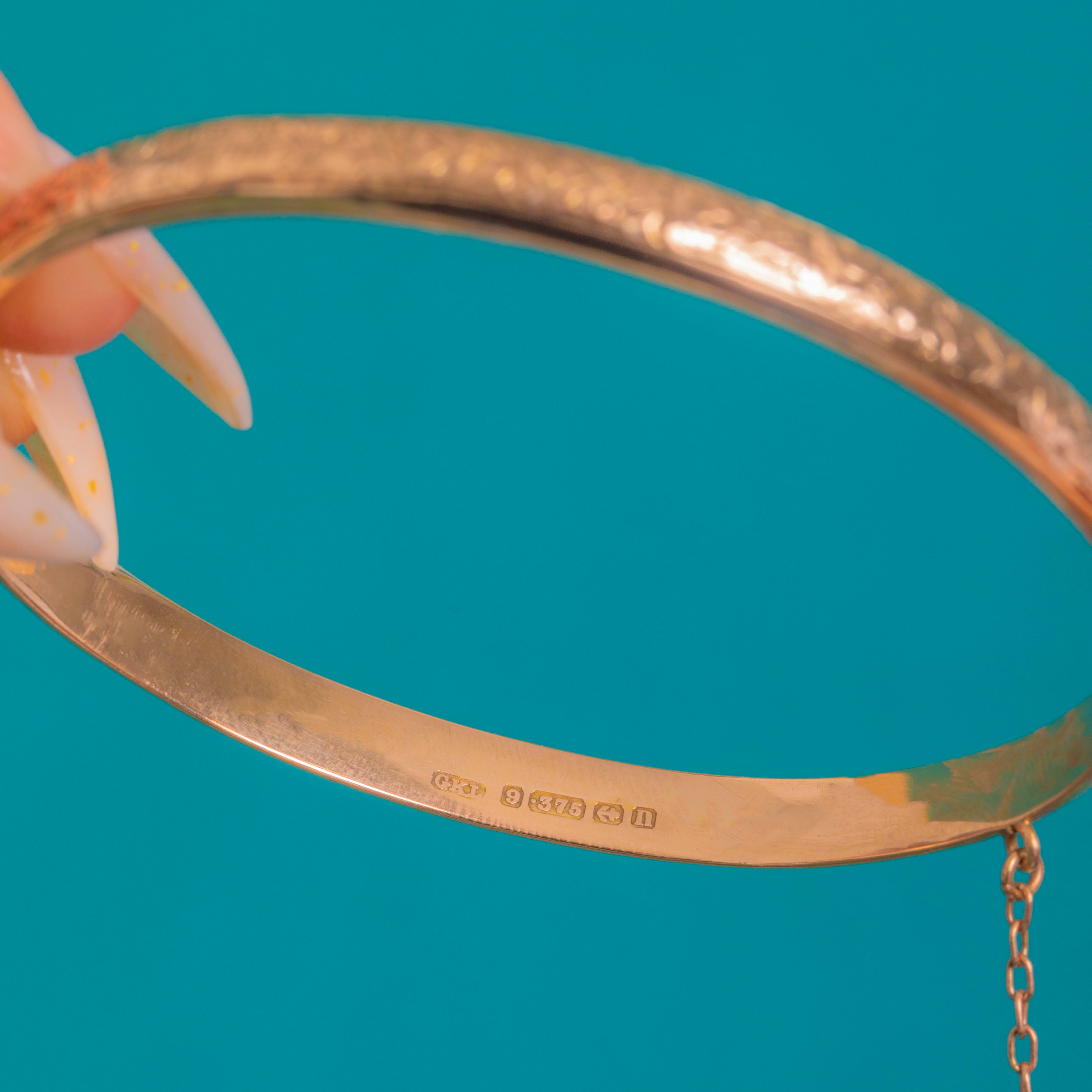 Delicately engraved and beautifully refined, this 9ct Gold hinged bangle dates to c.1912 and brims with charm. The outer face is bright-cut with trailing foliate scrolls, framed by fine polished borders that catch the light against its warm yellow-to-rosy glow. Its oval, D-section profile offers an elegant, timeless silhouette.