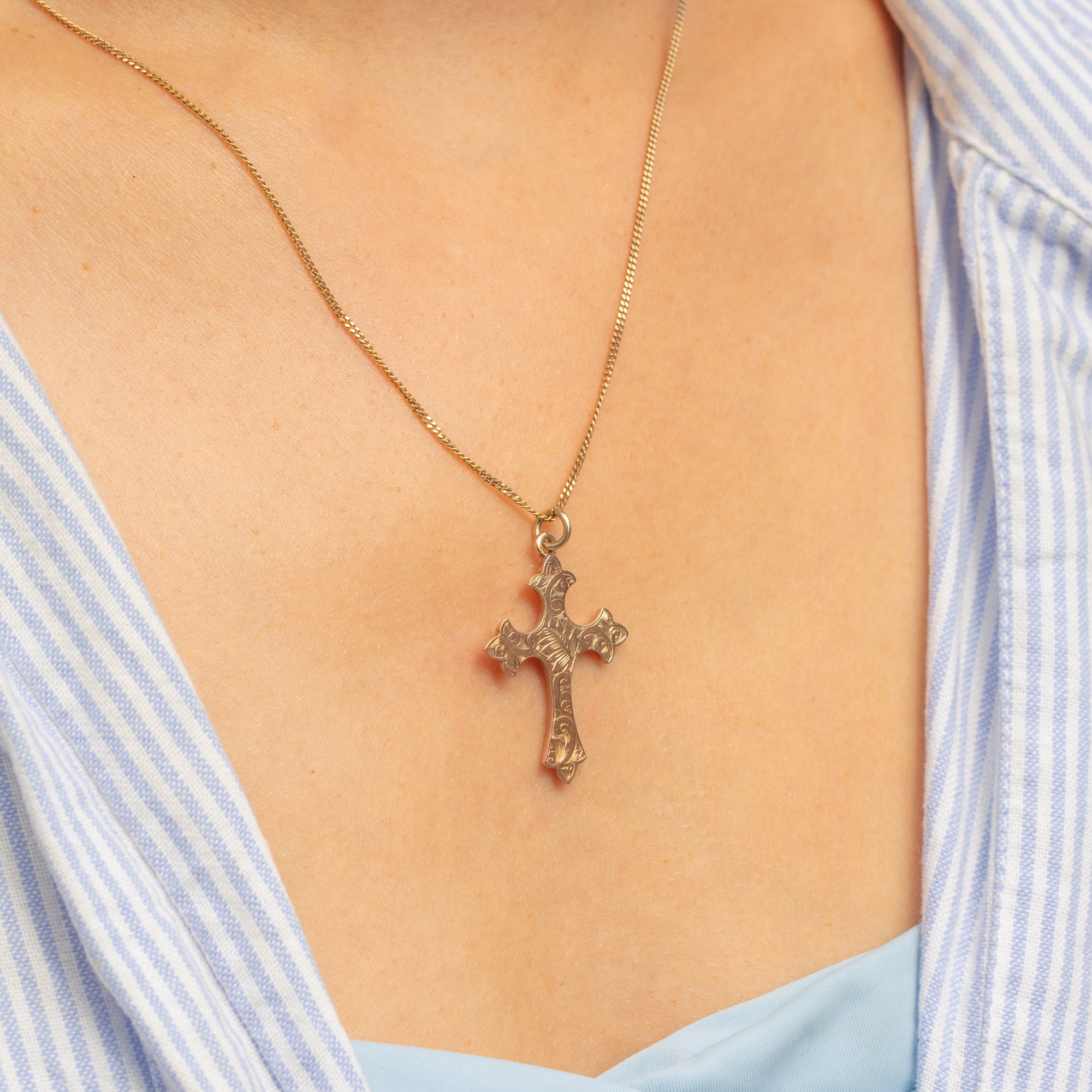 This Victorian cross pendant has been beautifully engraved with swirling Acanthus leaves, and resembles the 'cross fleury' with its distinctive fleur-de-lys edges.