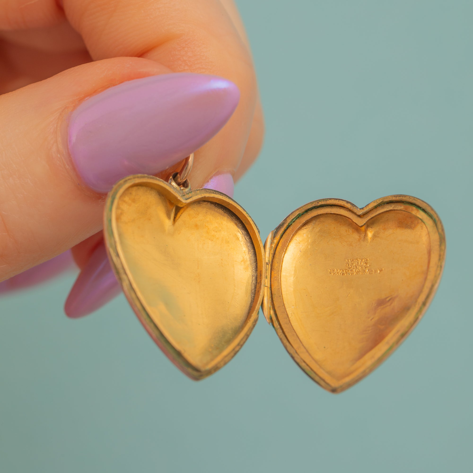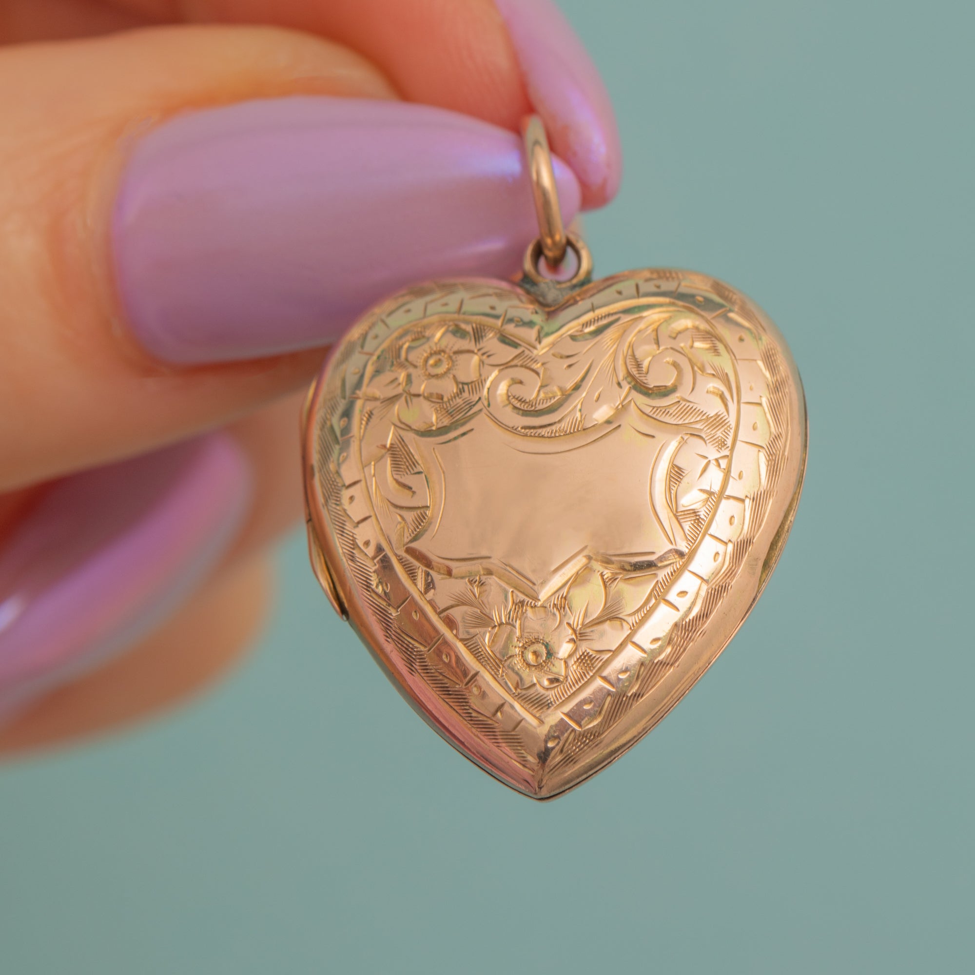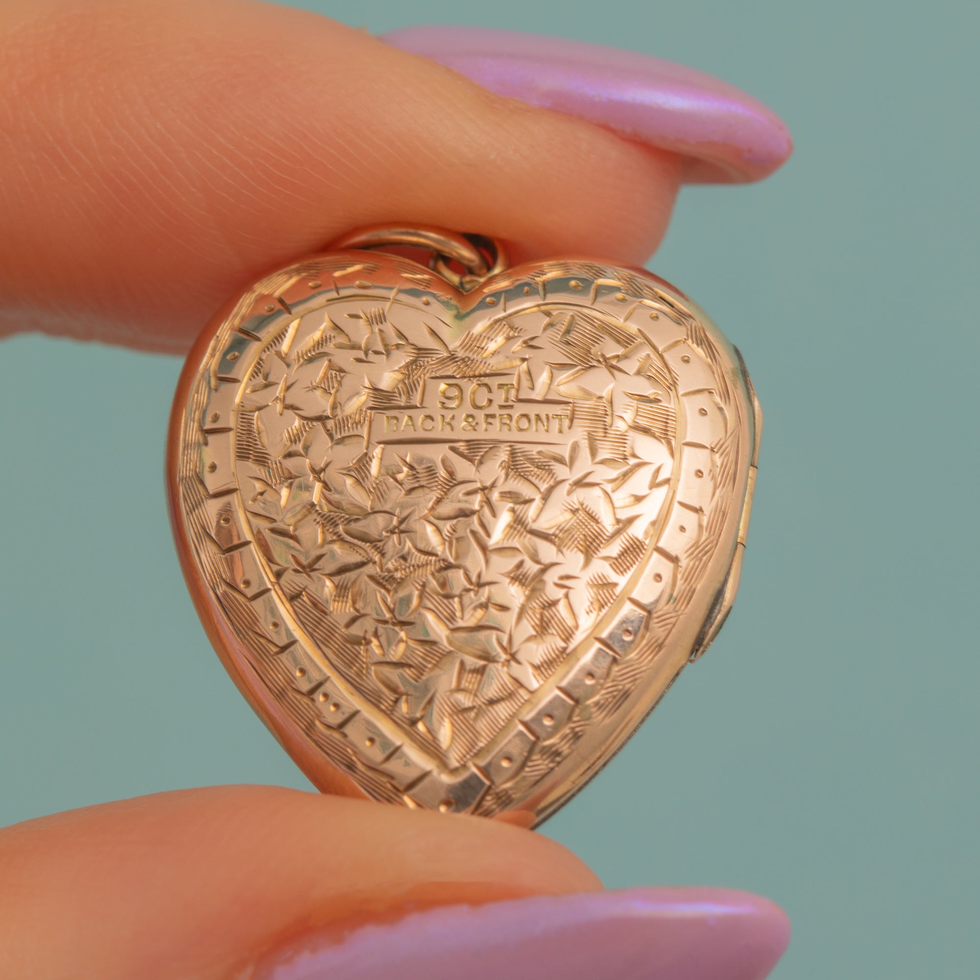 VERY GOOD-EXCELLENT. This antique 9ct Gold engraved heart locket is in wonderful condition. Her engravings are crisp and detailed, and her Gold is lustrous and warm. There are some signs of wear to the Gold commensurate with age, particularly inside the locket, however this does not detract from her beauty. Closing with a nice 'click', this Edwardian locket can be worn with confidence!