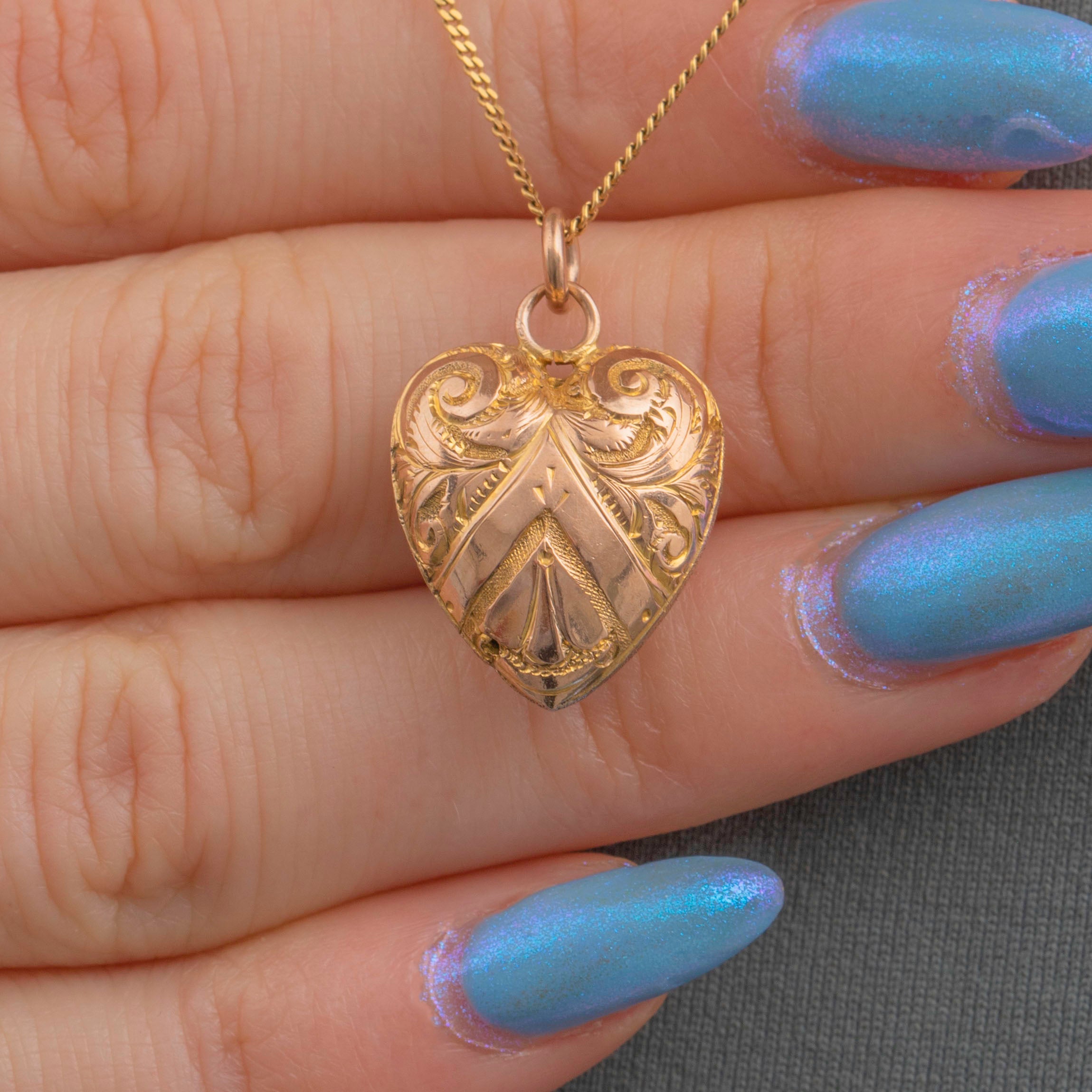 EXCELLENT. This antique 9ct Gold engraved puffy heart pendant is in excellent condition. The Gold is luminous with a rosy finish and the engraved details have remained defined. With so much wear potential, this antique heart pendant will make a lovely addition to your collection!