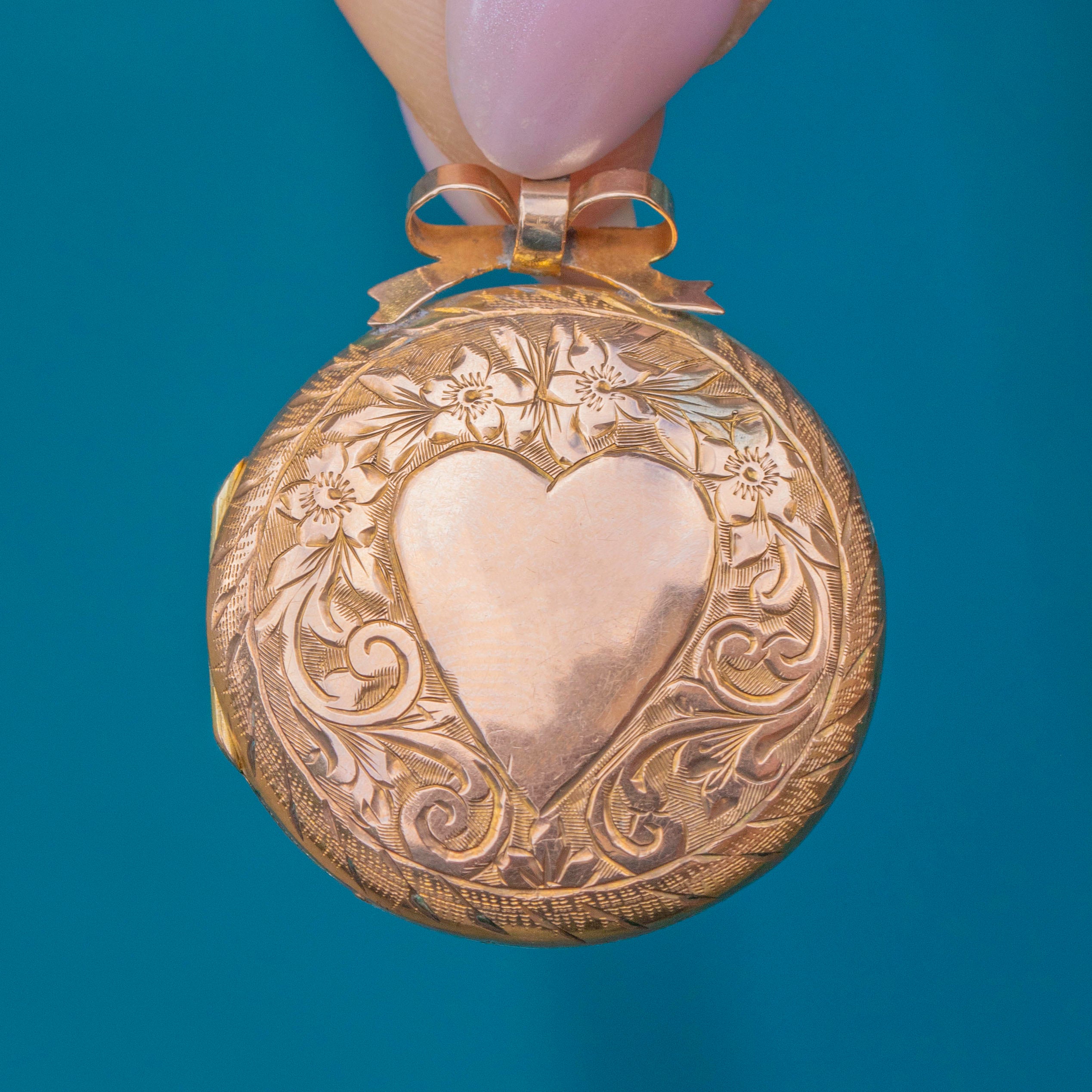 Antique 9ct Gold Engraved Round Locket with Ribbon Top