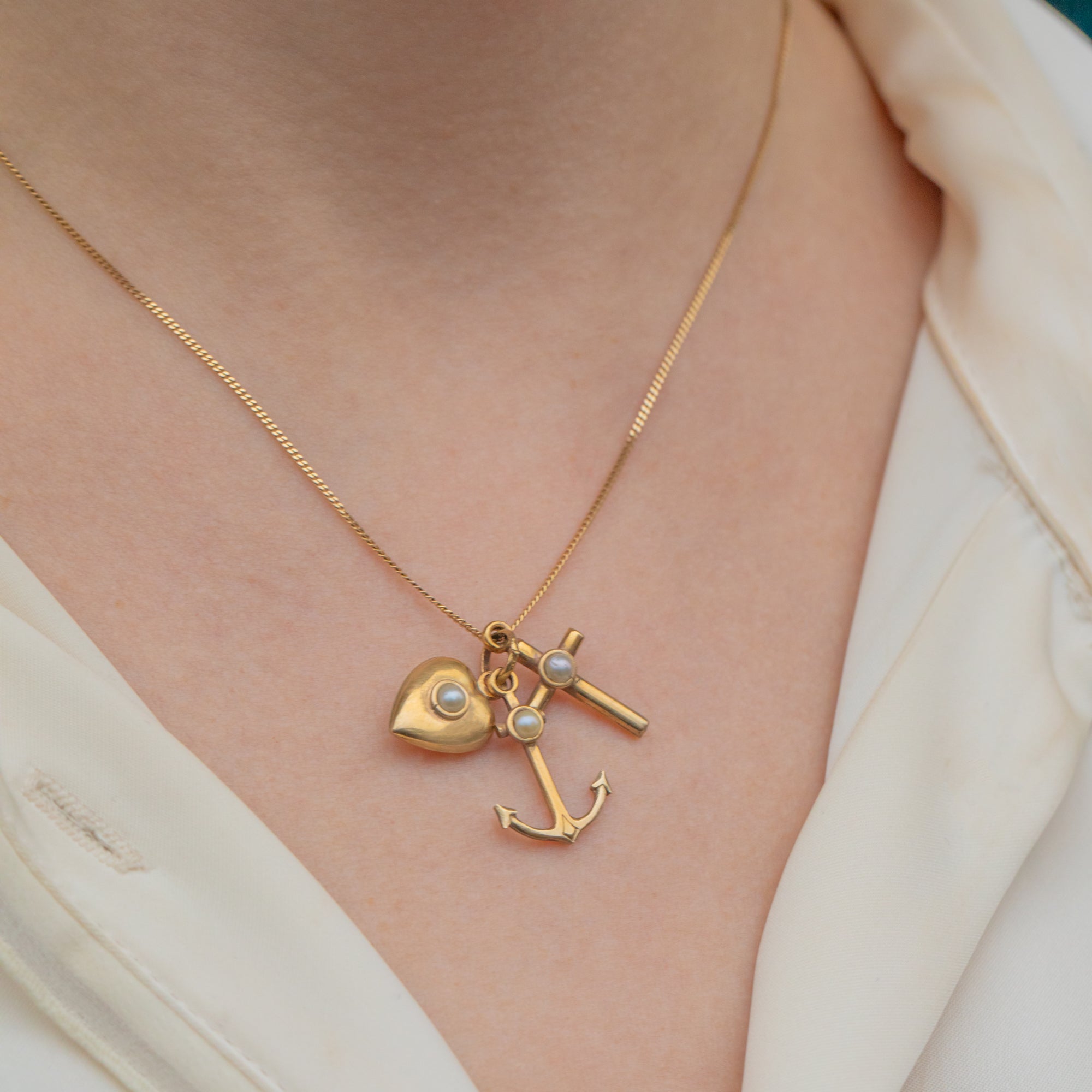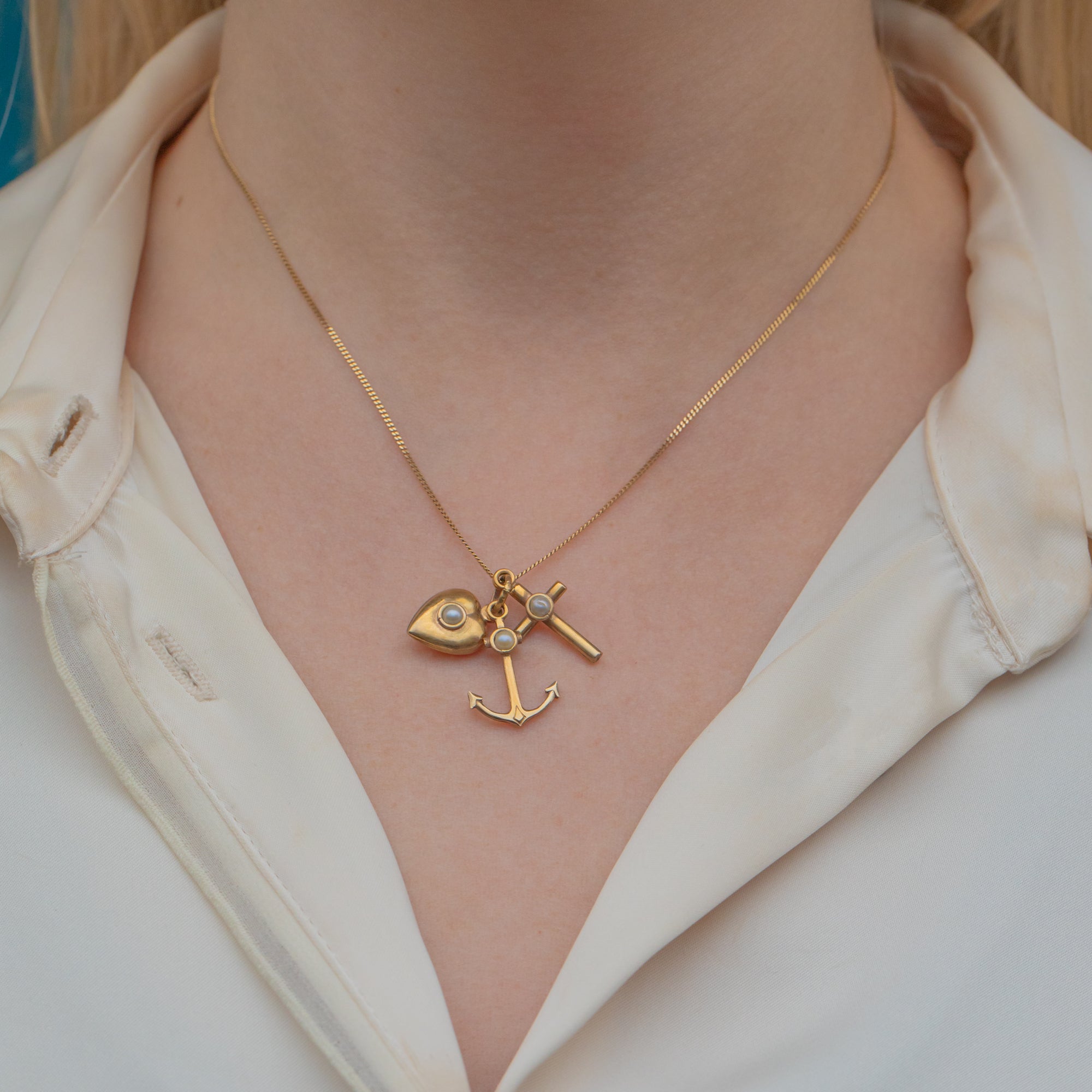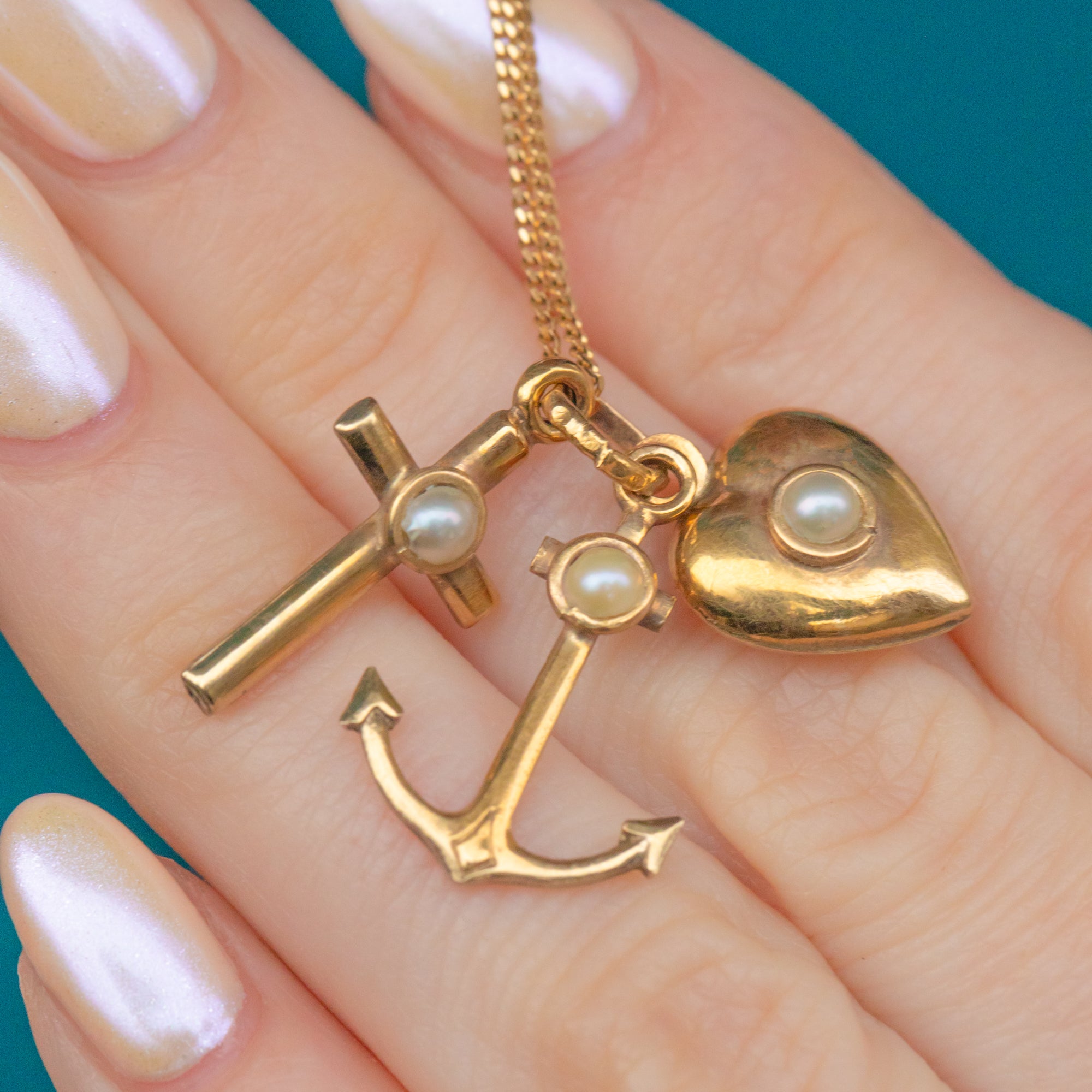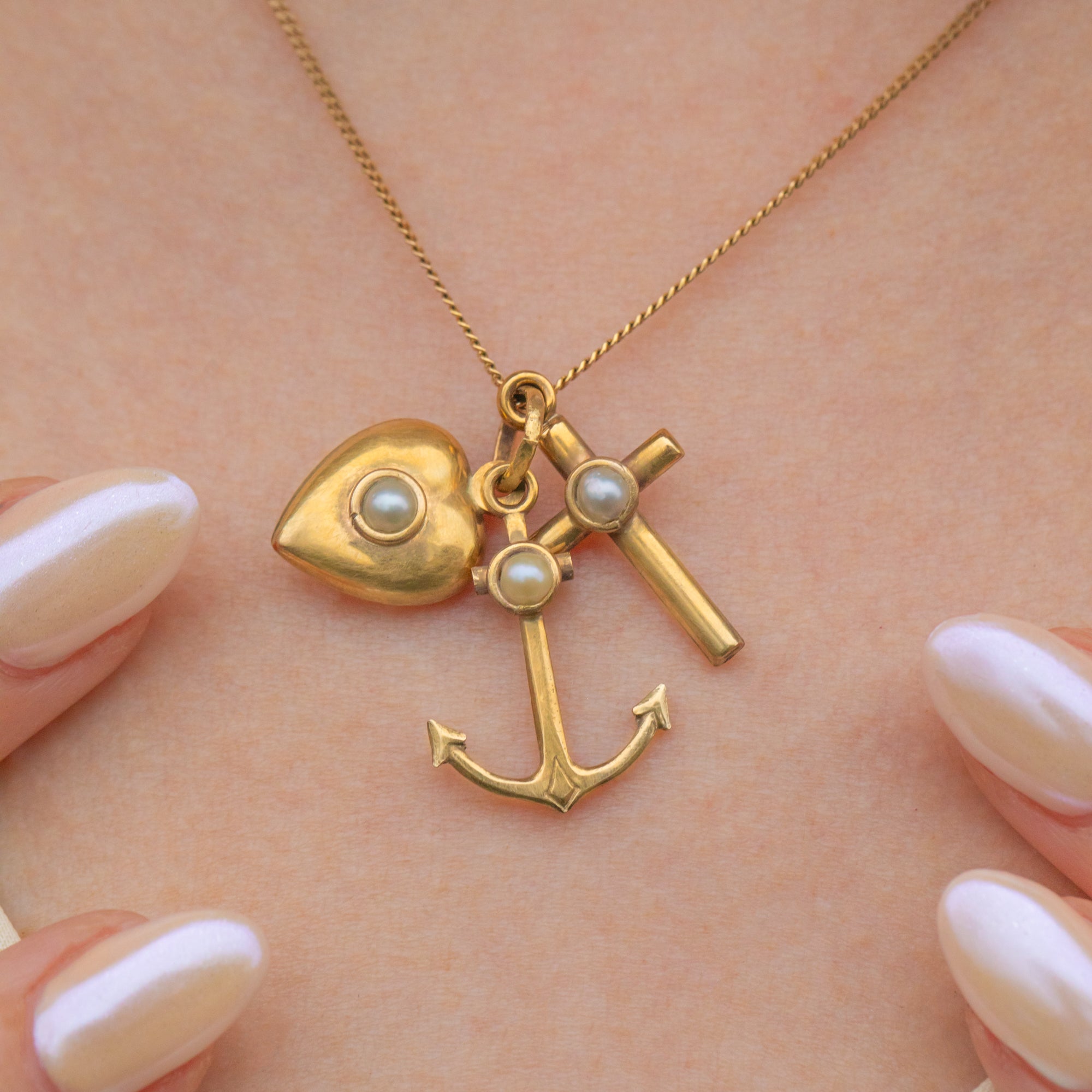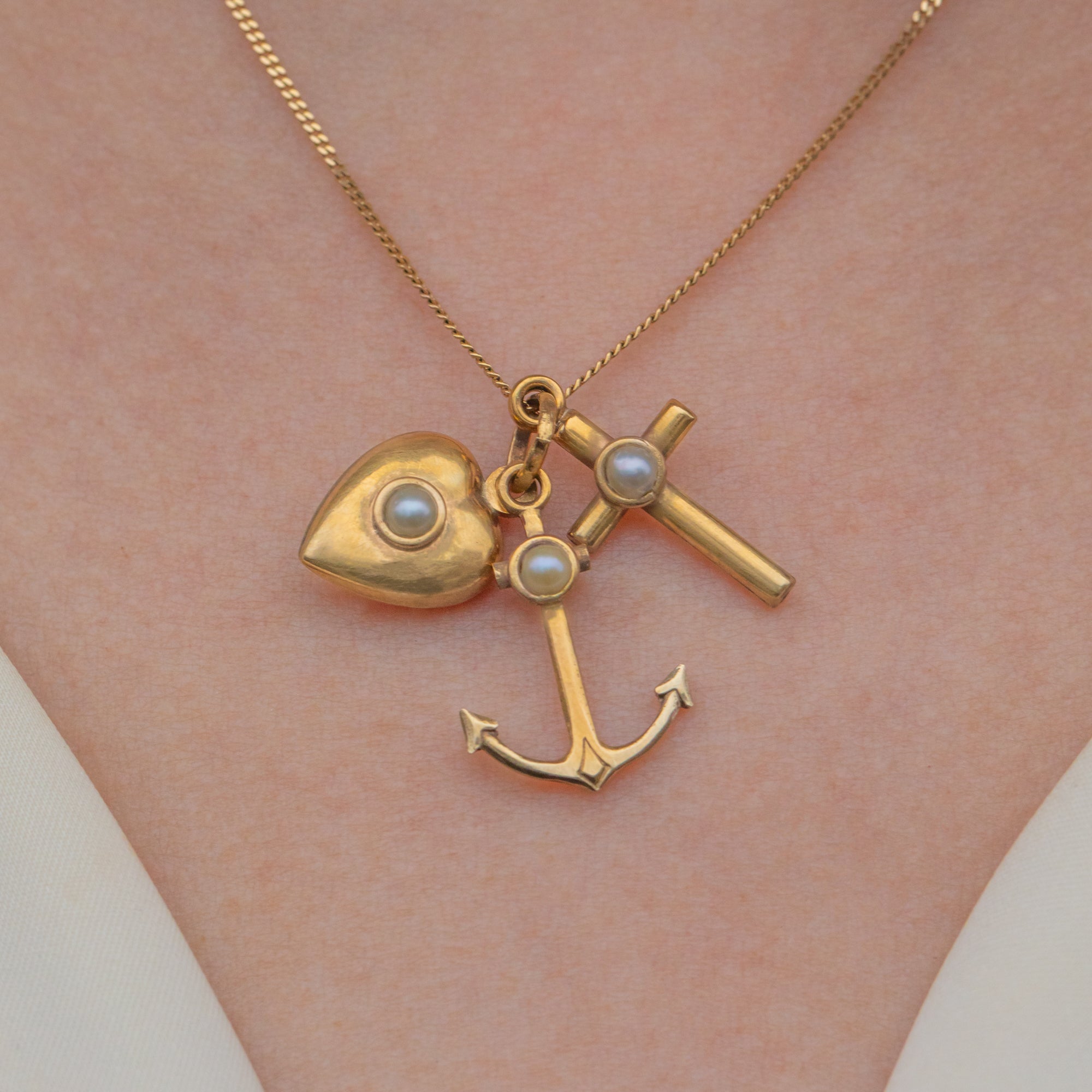 EXCELLENT. This antique 9ct Gold faith hope charity pendant is in excellent condition. The Gold has a lovely pale buttery hue and each charm is free from dings or scuffs. The Pearls are securely set with their nacre remaining smooth with no surface wear. This sweet Victorian faith hope charity charm trio will make a fab addition to your collection!