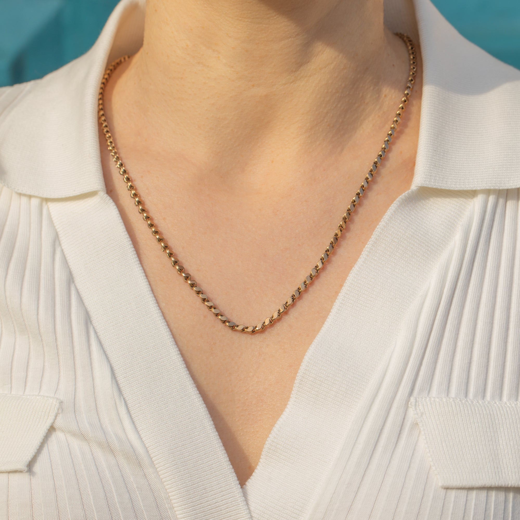 VERY GOOD-EXCELLENT: This antique 9ct Gold fancy tulip chain is in wonderful condition. The links are robust and secure, so you can wear this chain with the utmost confidence. The Golden hue is delicious and will last a lifetime of wear and beyond! There is an area on the dog-clip that has been previously filed to test the purity of the metal, but this has not impacted its structural integrity, and it functions perfectly.