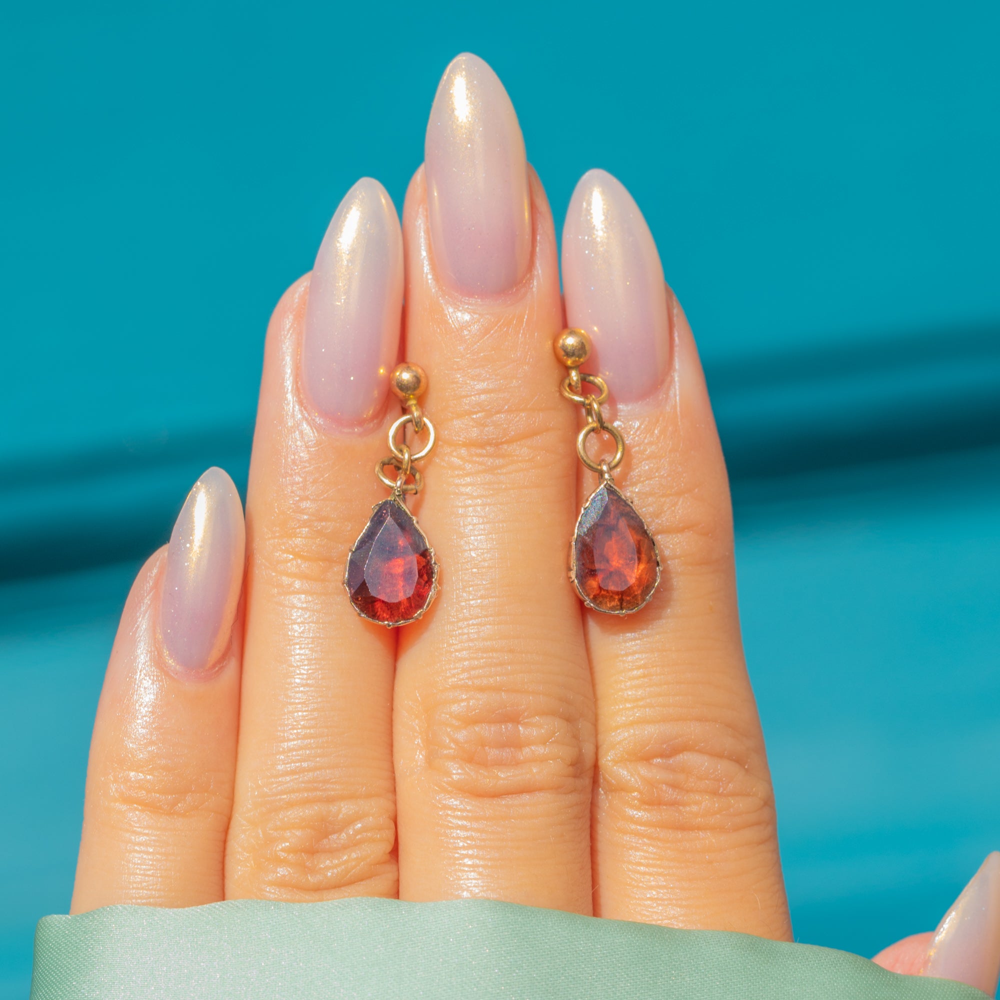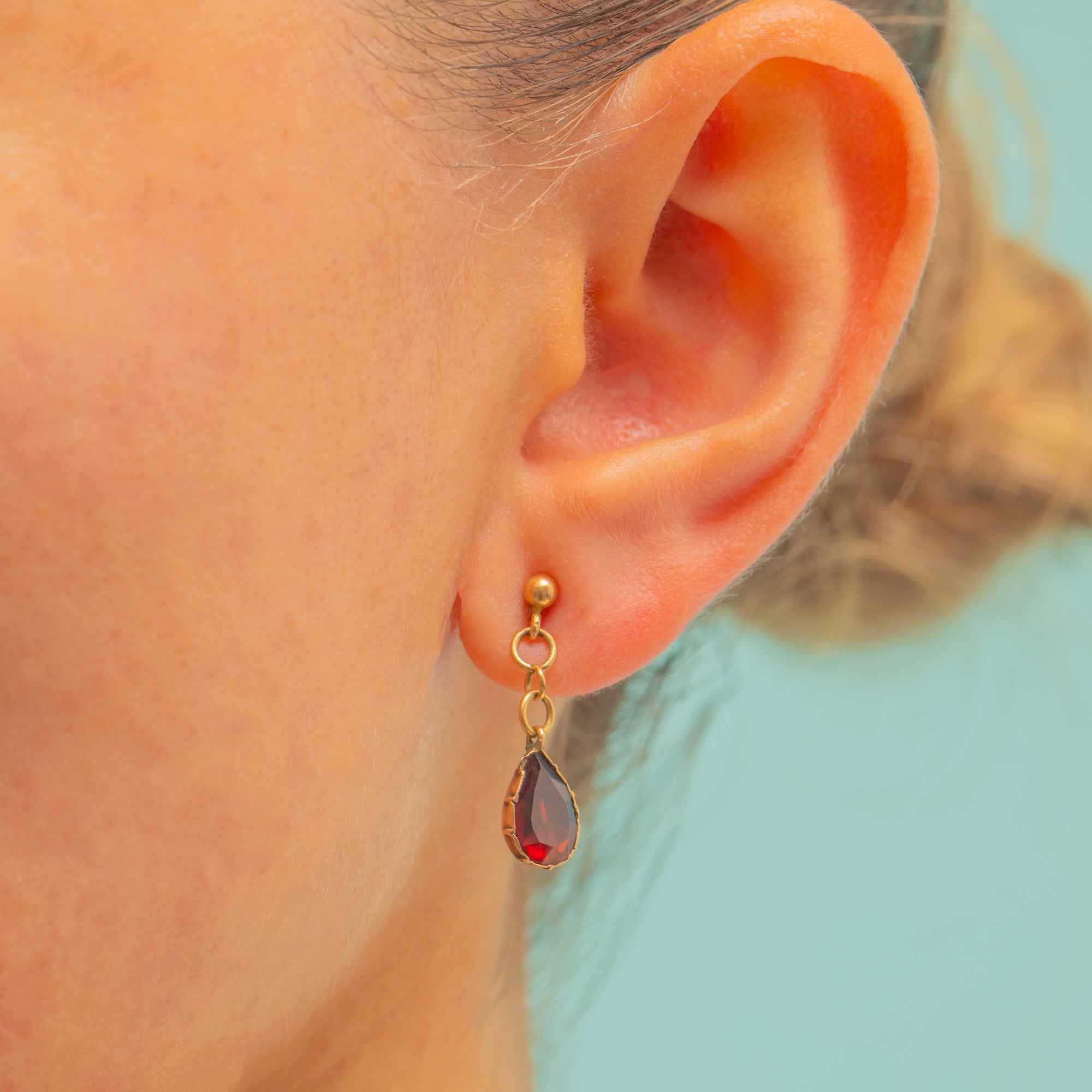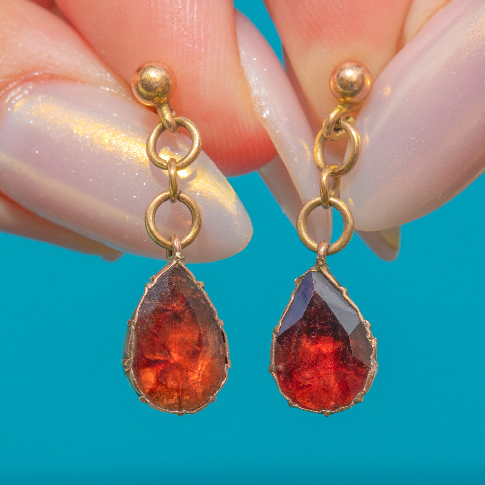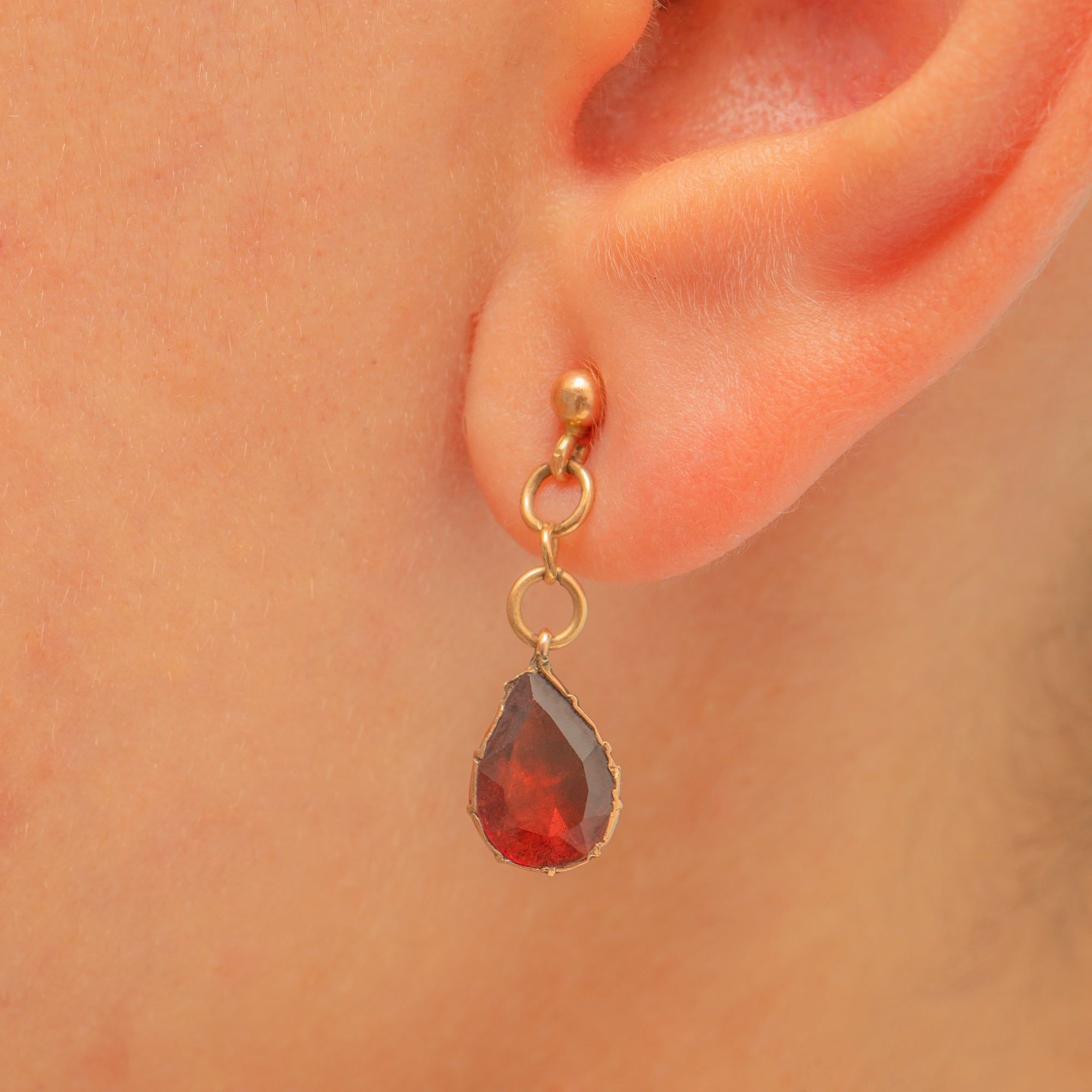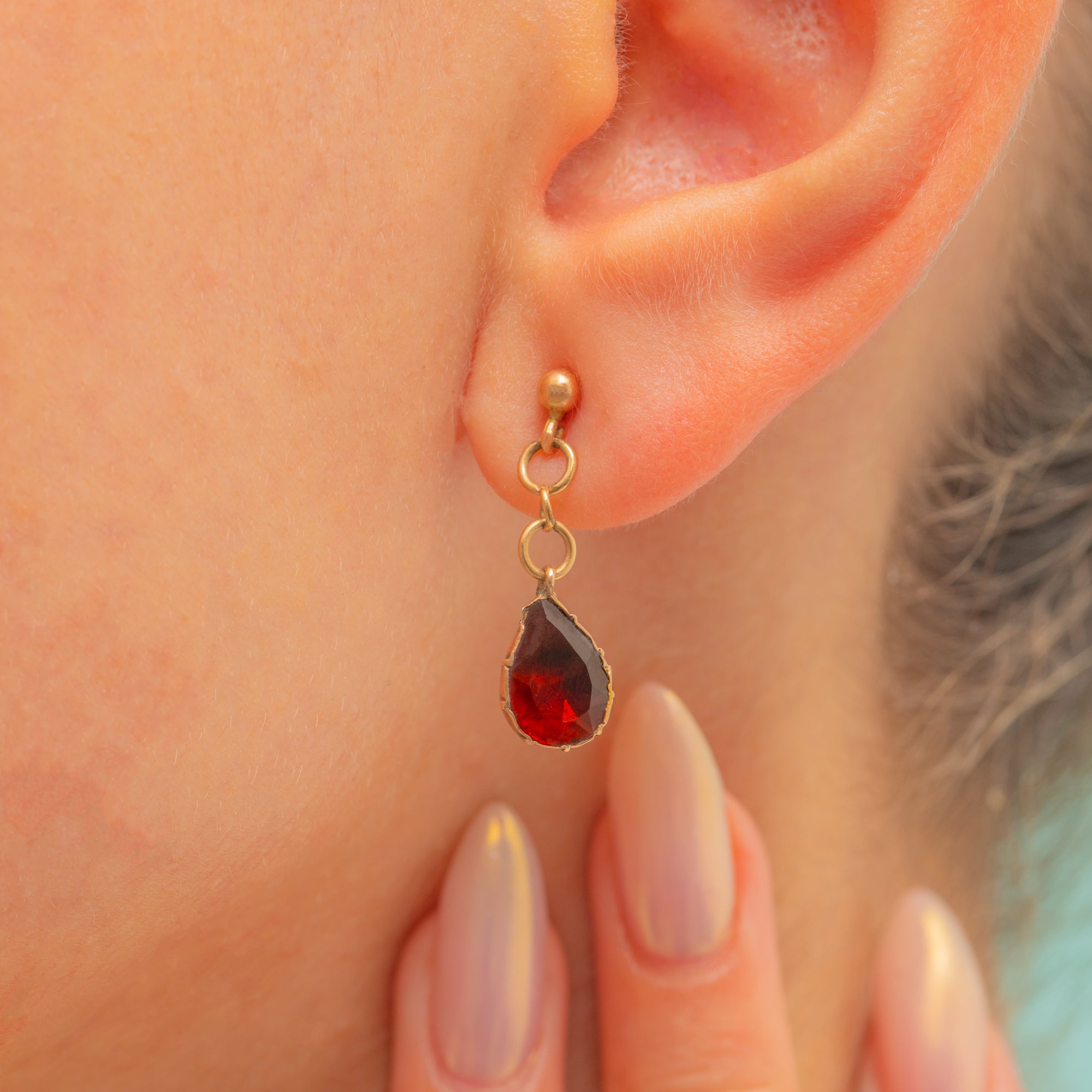 A fine pair of Antique Victorian earrings, each set with a glowing flat-cut Garnet in a rich wine-red hue. The teardrop Garnets are mounted in traditional crimped collet settings that display their depth of colour beautifully.
