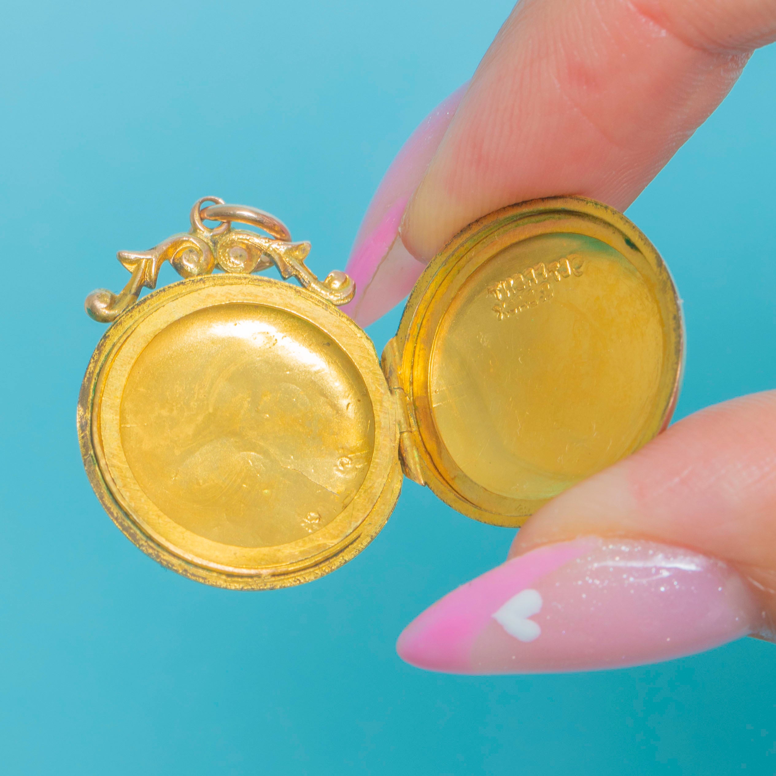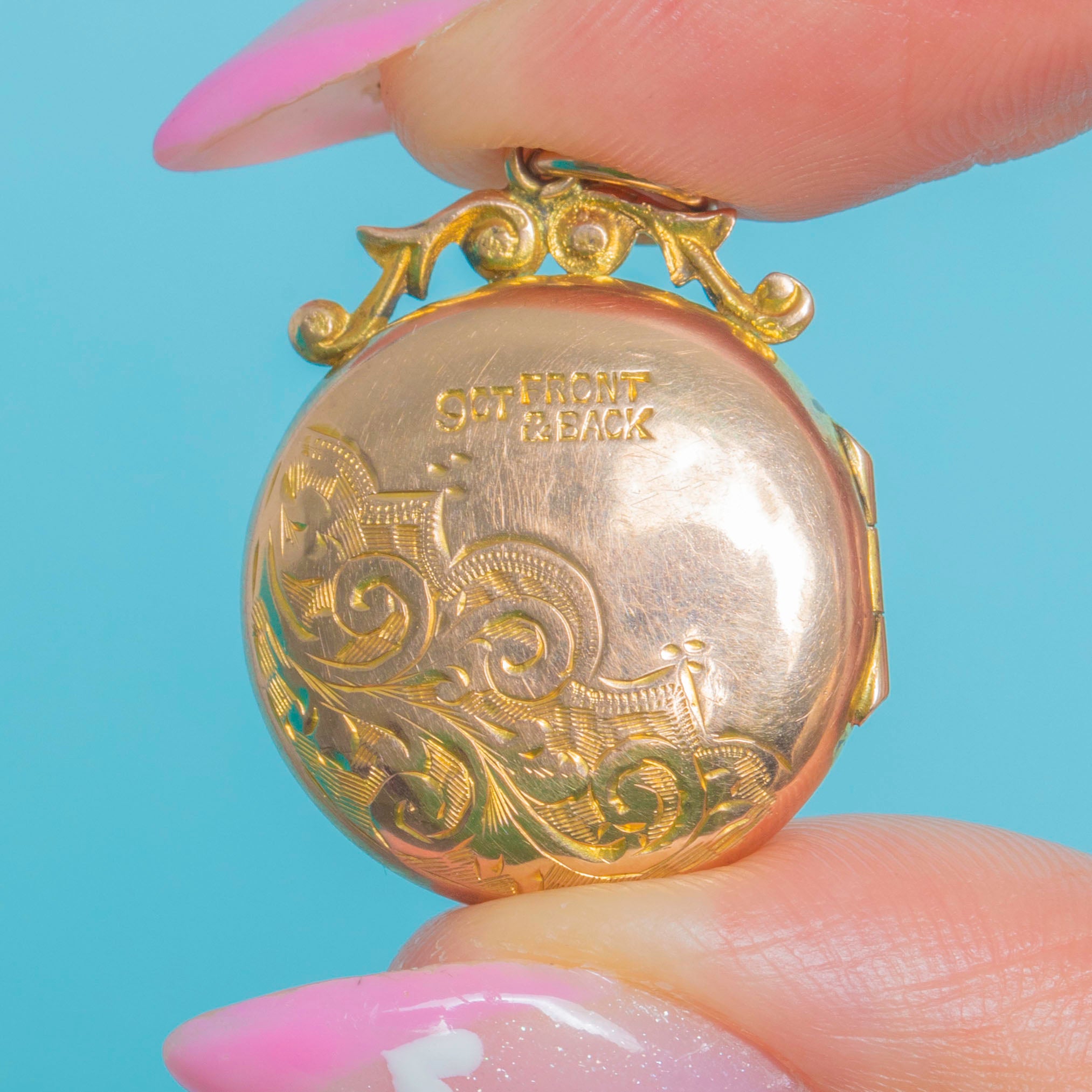 EXCELLENT: The Gold retains a lovely warm hue with crisp floral engraving and a gentle antique patina. The locket closes securely and the interior frames remain intact and in good order.
