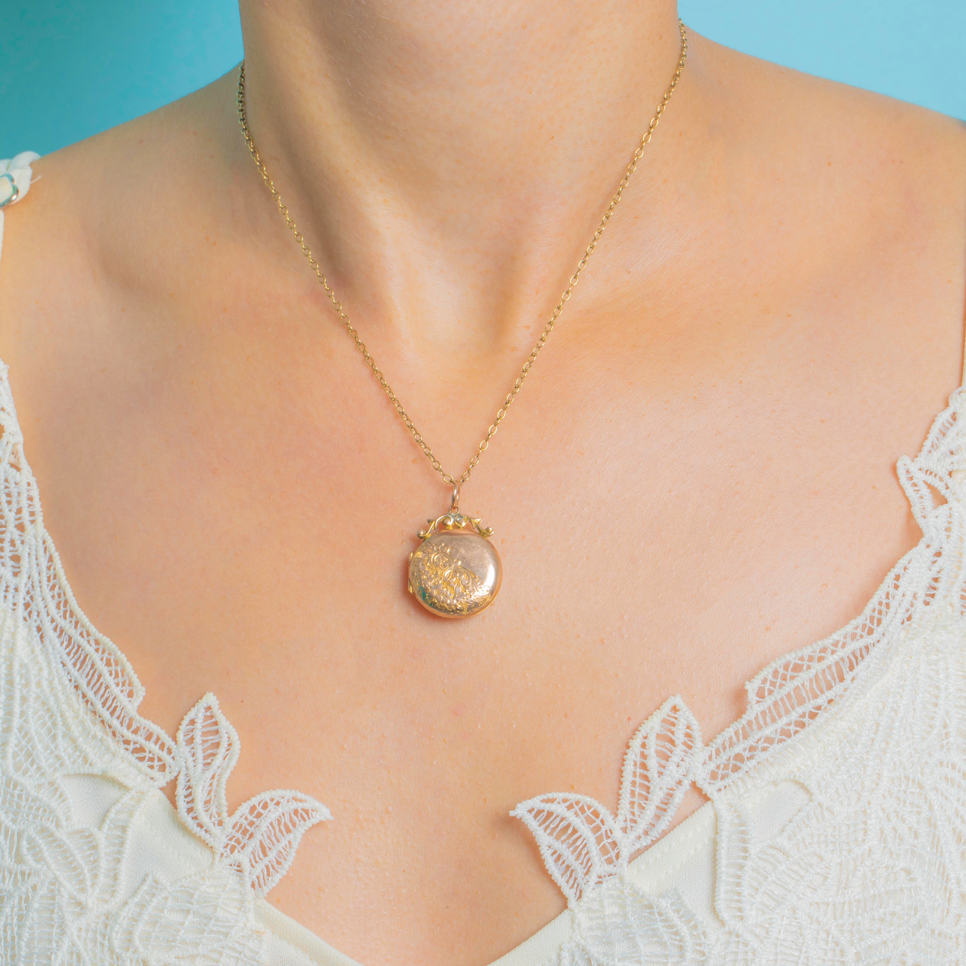 This charming Edwardian locket is crafted in 9ct Gold and decorated with beautiful floral engravings, a delicate, feminine motif typical of early 20th-century design. The round form gives it a timeless appeal, ideal for holding cherished photographs or mementos close to the heart.