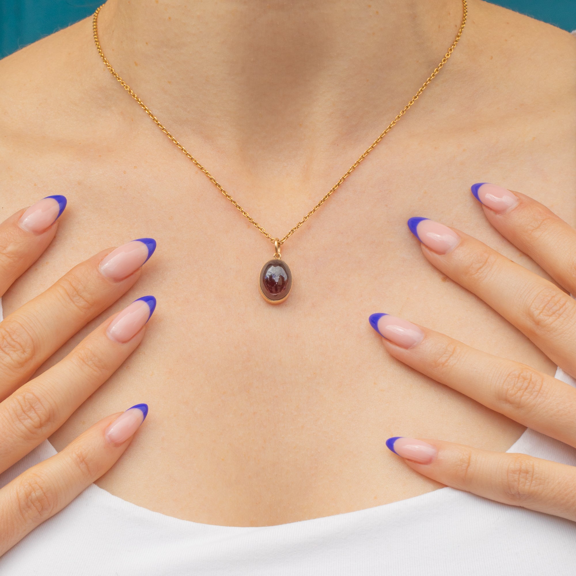 If ever you are looking for that special something to complete your outfit, this antique 9ct Gold Garnet cabochon charm will become your go-to! Bringing seduction and Victorian charm in one, you won't help but fall for her 8.35ct Garnet's pool of Sangria, swimming within her smooth cabochon cut.