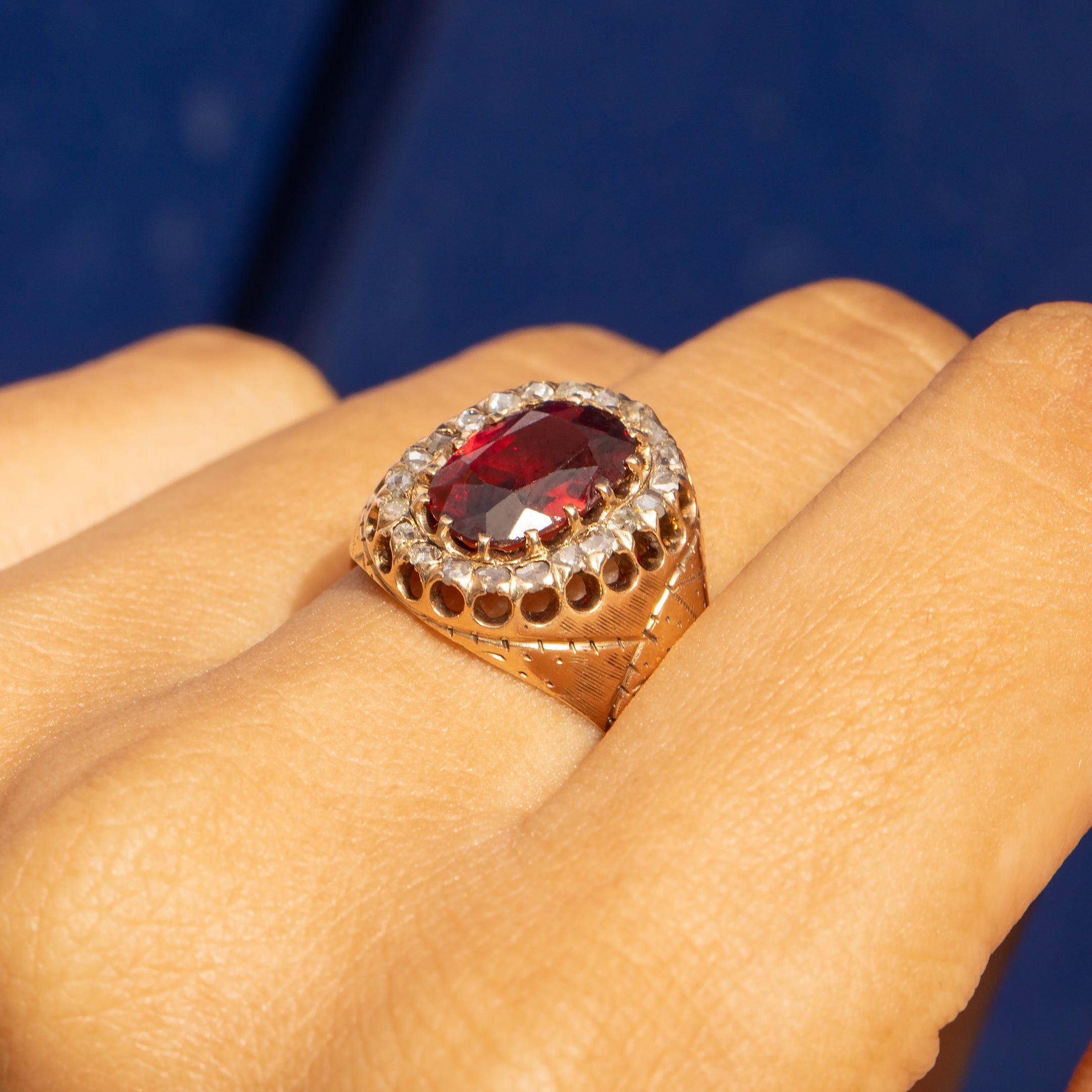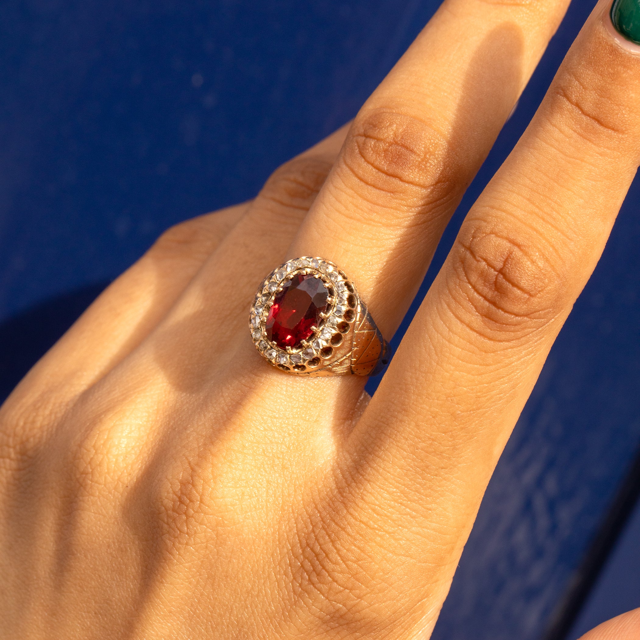 We've fallen in love with this antique 9ct Gold Garnet Diamond cluster ring! Boasting twinkling rose-cut Diamonds encircling a 2.60ct merlot-hued Garnet framed by intricately engraved shoulders, this Victorian ring is bursting with splendour.