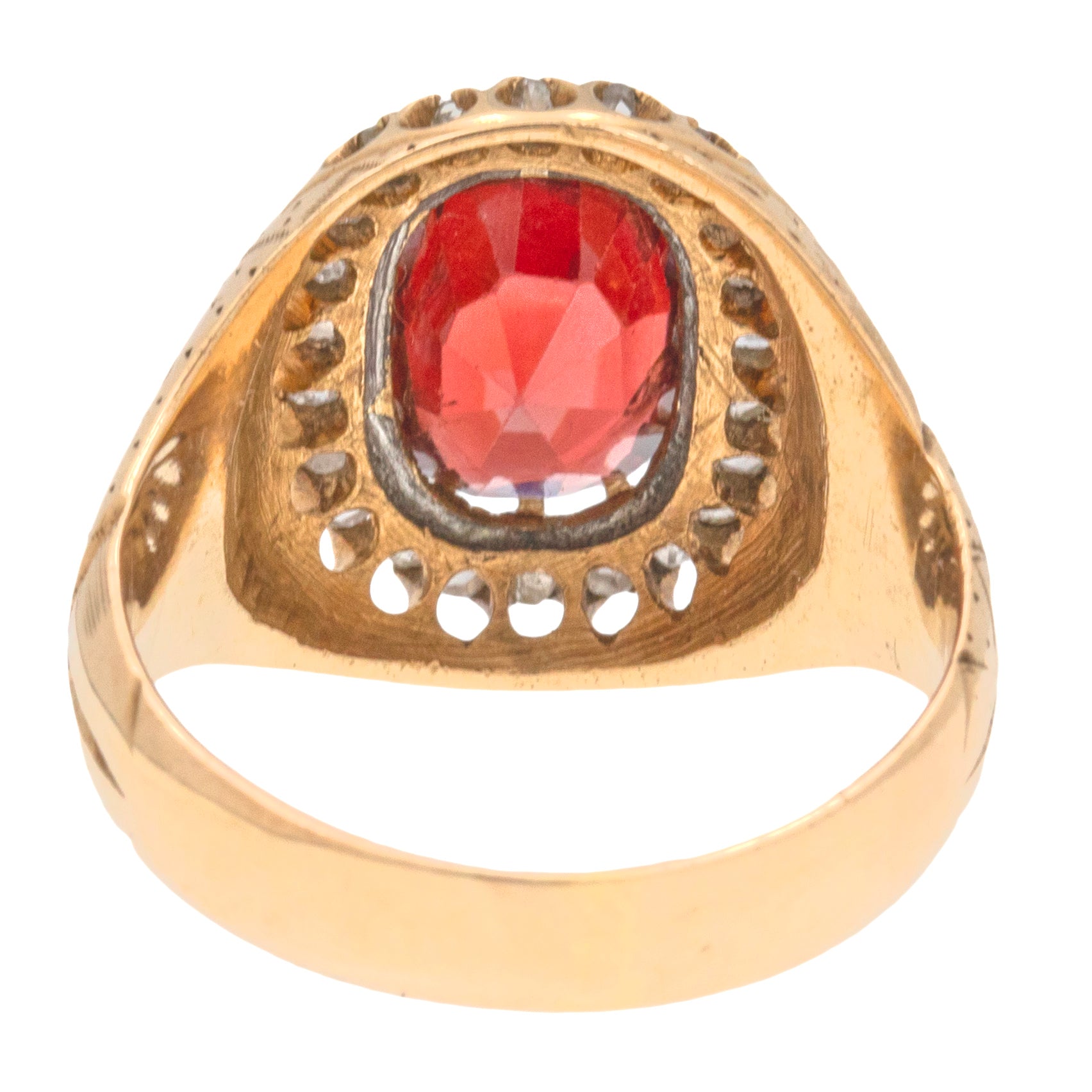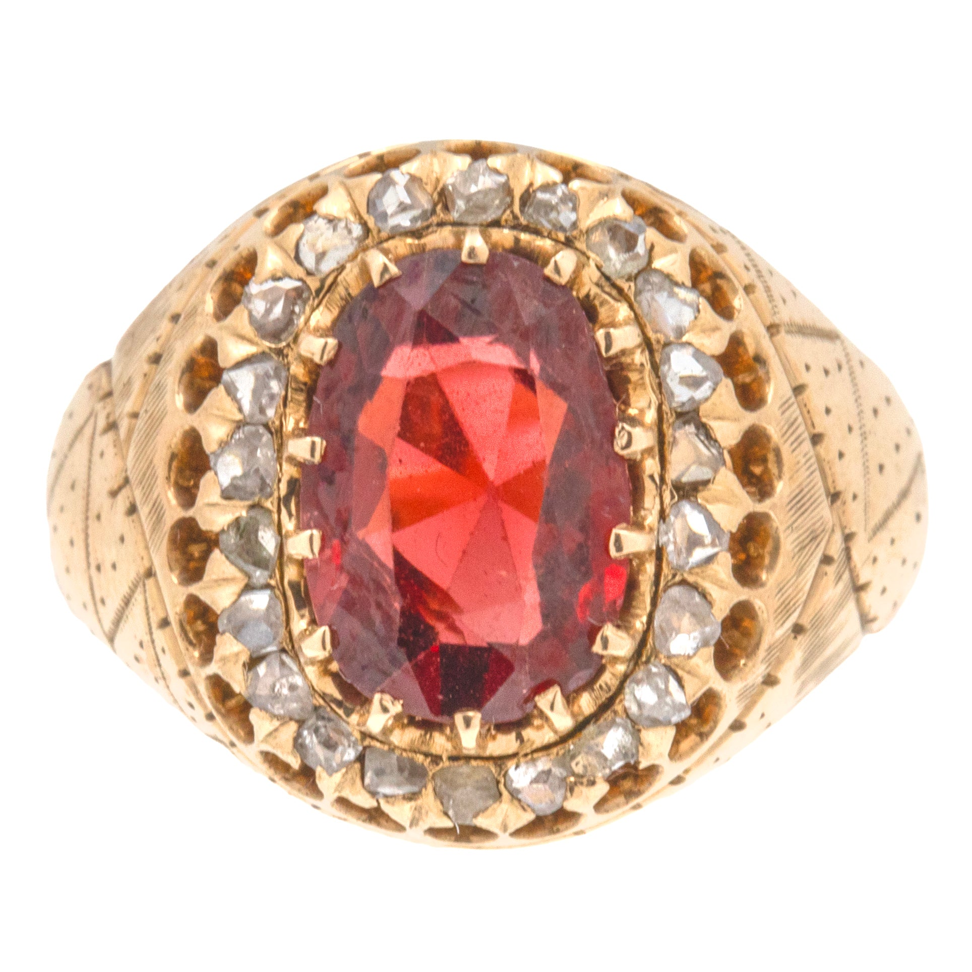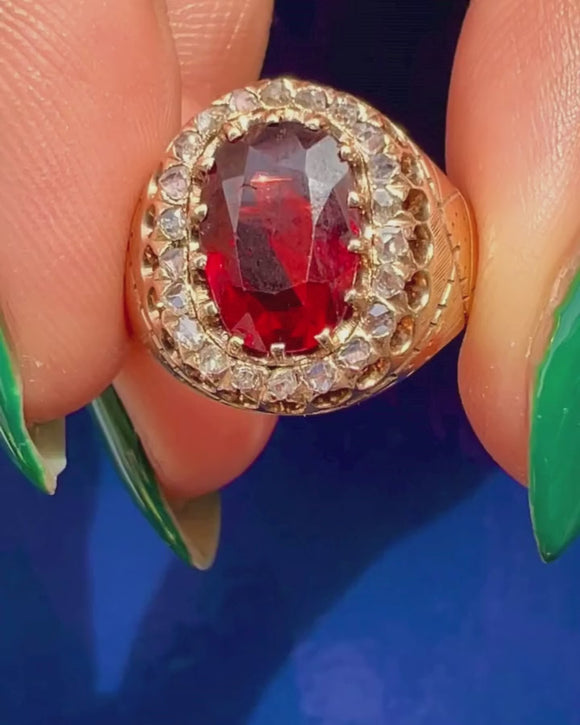 Antique 9ct Gold Garnet Diamond Cluster Ring, Engraved Shoulders, 2.60ct.