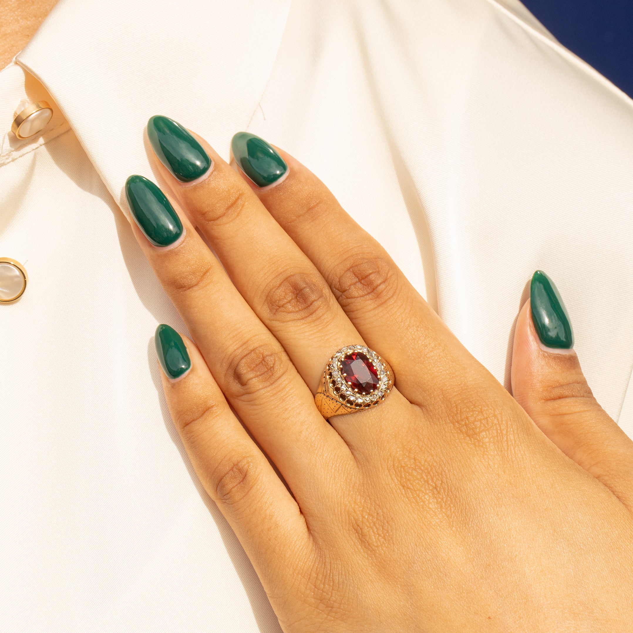Adorned with a total of 0.55cts of charming, glittery rose-cut Diamonds that accompany a jammy faceted Garnet at its centre, this piece is both feminine and moody. Her 9ct Gold band sits comfortably on the finger, making for the perfect everyday statement!