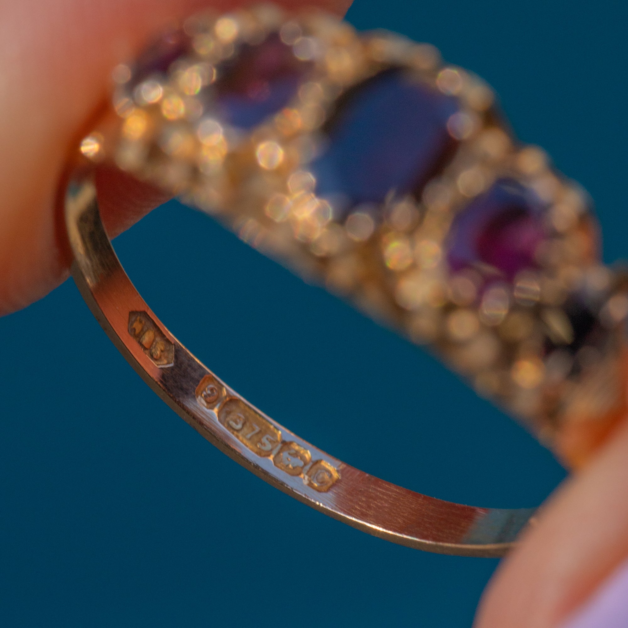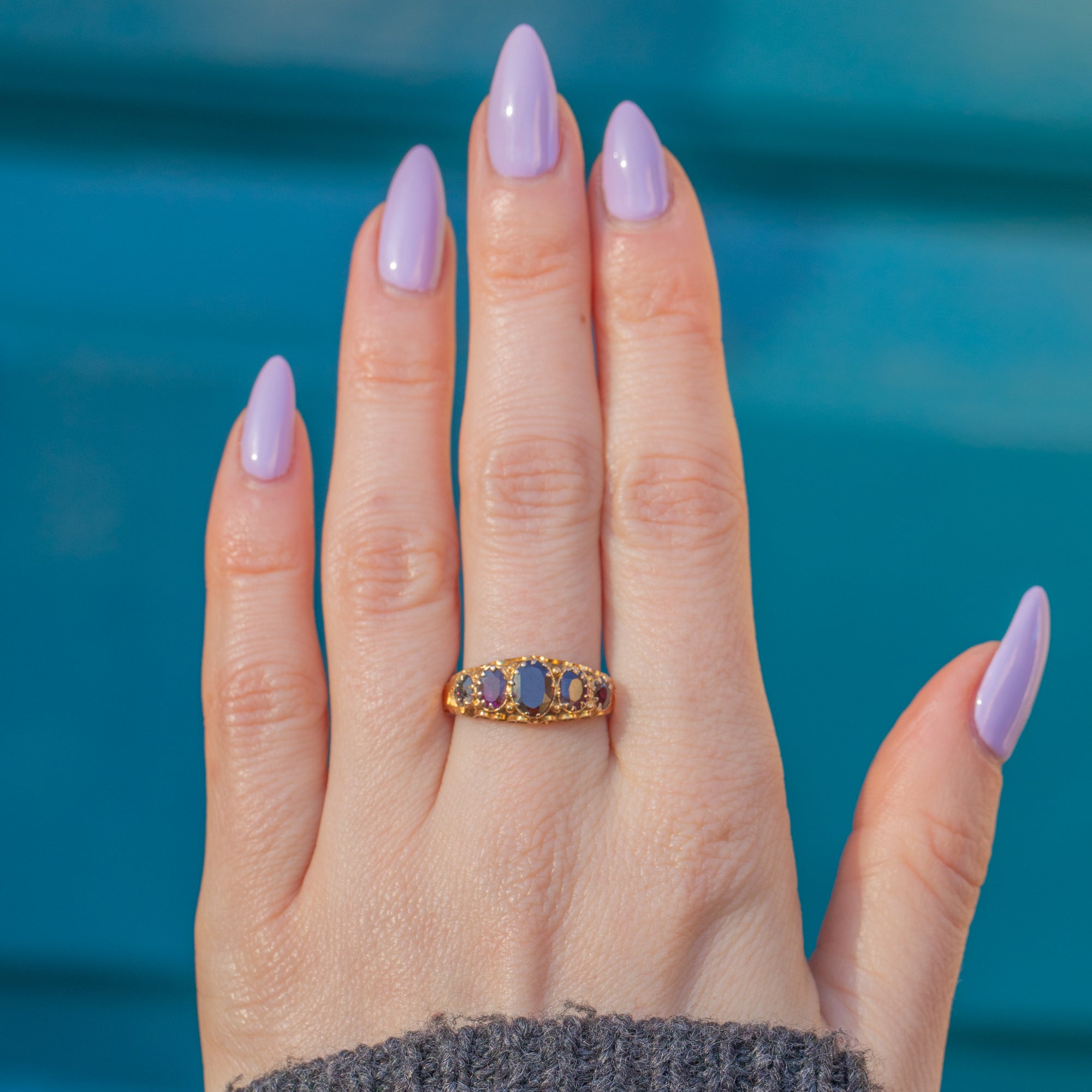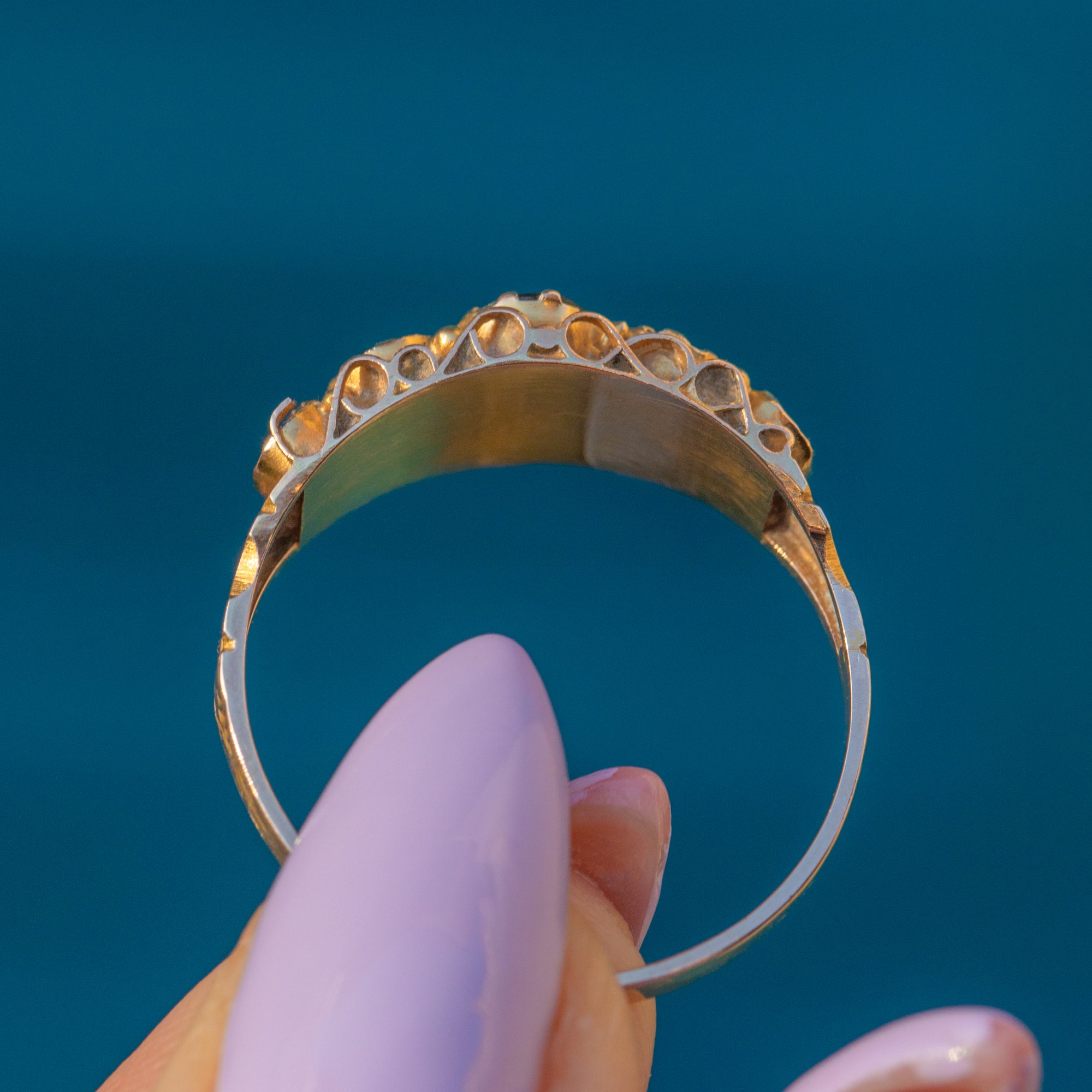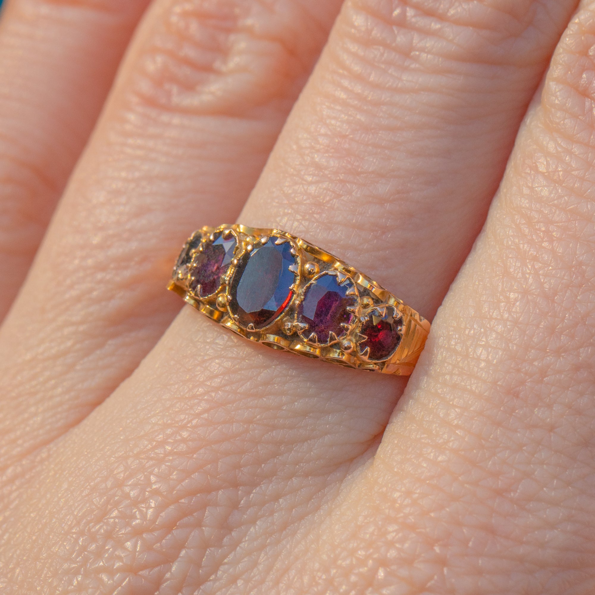 This antique 9ct Gold Garnet five stone ring will inject some early Victorian charm into your collection! The decorative 9ct Gold band is bursting with ornate details and is fully hallmarked to 1851, making it a highly collectible piece.