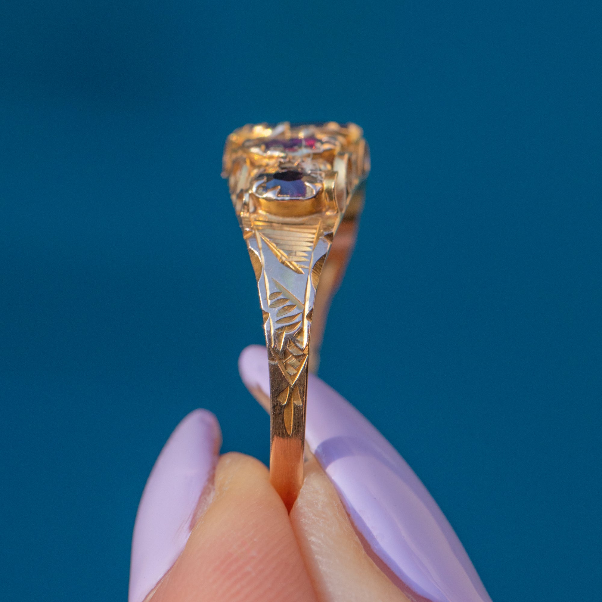 The exquisite gallery boasts curvaceous C scrolls that proudly present the Garnets, revealing seductive flashes of deep crimson and bright pops of fuchsia as they move in the light. The tapered ring band displays decorative engravings, allowing you to appreciate the skilled craftsmanship from every angle!
